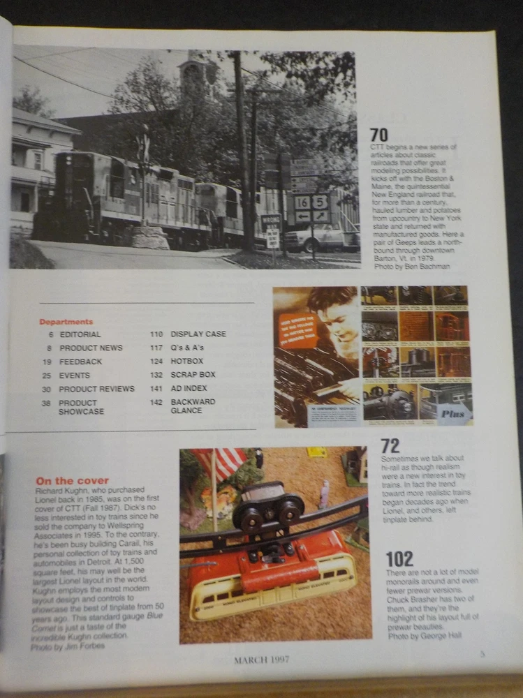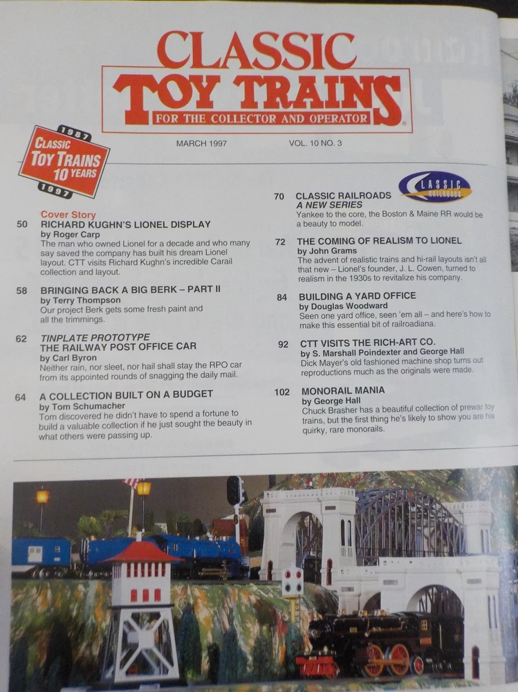 RailroadTreasures offers the following item: Classic Toy Trains 1997 March Richard Kughn Lionel display Railway Post office Classic Toy Trains March 1997 Cover Story 50 RICHARD KUGHN'S LIONEL DISPLAY by Roger Carp The man who owned Lionel for a decade and who many say saved the company has built his dream Lionel layout. CTT visits Richard Kughn's incredible Carail collection and layout. 58 BRINGING BACK A BIG BERK - PART II by Terry Thompson Our project Berk gets some fresh paint and all the trimmings. 62 TINPLATE PROTOTYPE THE RAILWAY POST OFFICE CAR by Carl Byron Neither rain, nor sleet, nor hail shall stay the RPO car from its appointed rounds of snagging the daily mail. 64 A COLLECTION BUILT ON A BUDGET by Tom Schumacher Tom discovered he didn't have to spend a fortune to build a valuable collection if he just sought the beauty in what others were passing up. 70 CLASSIC RAILROADS A NEW SERIES Yankee to the core, the Boston & Maine RR would be a beauty to model. 72 THE COMING OF REALISM TO LIONEL by John Grams The advent of realistic trains and hi-rail layouts isn't all that new - Lionel's founder, J. L. Cowen, turned to realism in the 1930s to revitalize his company. 84 BUILDING A YARD OFFICE by Douglas Woodward Seen one yard office, seen 'em all - and here's how to make this essential bit of railroadiana. 92 CTT VISITS THE RICH-ART CO. by S. Marshall Poindexter and George Hall Dick Mayer's old fashioned machine shop turns out reproductions much as the originals were made. 102 MONORAIL MANIA by George Hall Chuck Brasher has a beautiful collection of prewar toy trains, but the first thing he's likely to show you are his quirky, rare monorails. All pictures are of the actual item. There may be reflection from the lights in some photos. We try to take photos of any damage. If this is a railroad item, this material is obsolete and no longer in use by the railroad. Please email with questions. Publishers of Train Shed Cyclopedias and Stephans Railroad Directories. Large inventory of railroad books and magazines. Thank you for buying from us. Shipping charges US Shipments: When you add multiple items to your cart, the reduced shipping charges will automatically be calculated. For direct postage rates to other countries, send me an email. Shipping varies by weight. Terms and conditions All sales are final. Returns accepted if item is not as described. Contact us before making a return. No warranty is stated or implied. Please e-mail us with any questions before bidding or buying. Thanks for looking at our items.