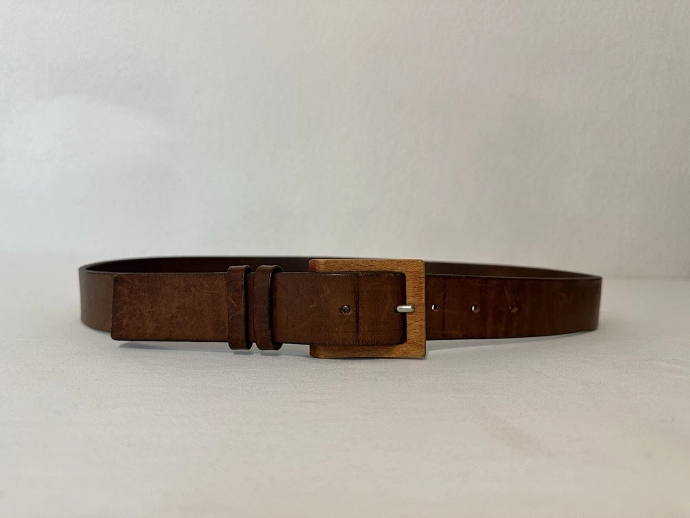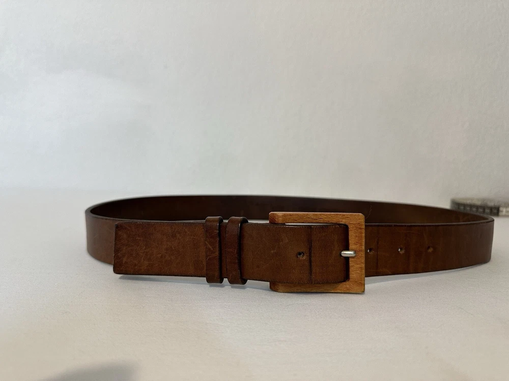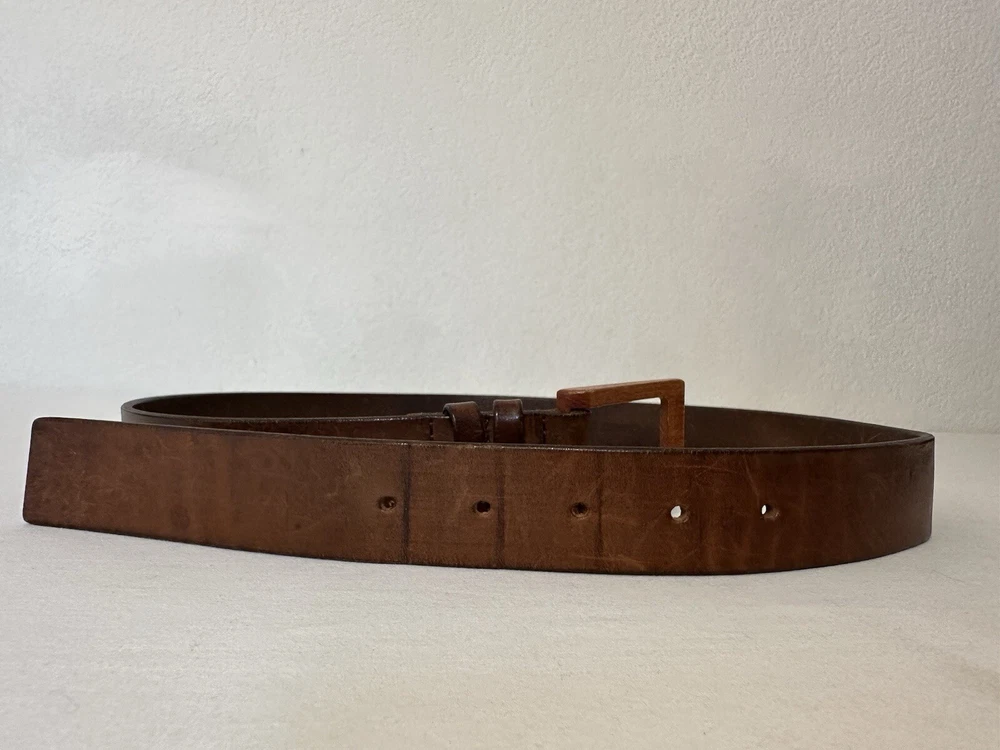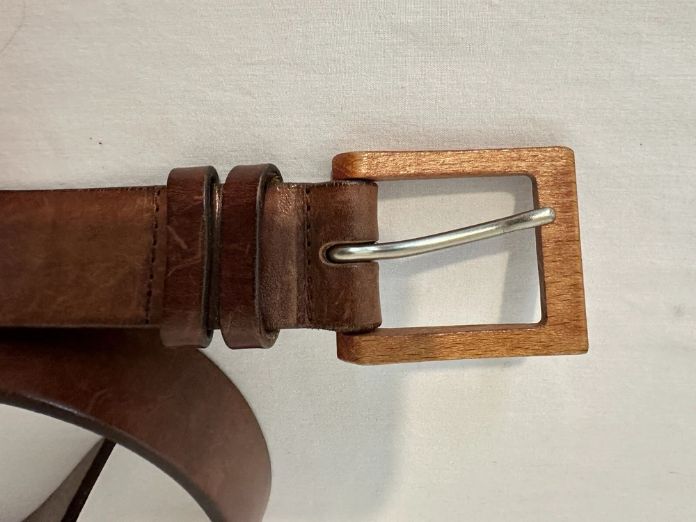 Claudio Orciani Brown Leather Belt Leather Wooden Buckle Italy 2031 43” Good Normal Wear Light Scuffs One Water Mark Lines On Leather From Buckle SEE PICTURES FOR CONDITION Measures 43”