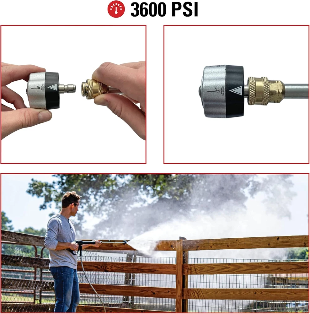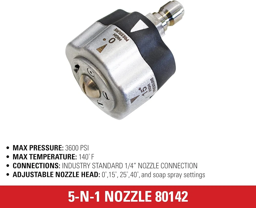 Universal fit: The Simpson Pressure Washer Spray 5-N-1 Nozzle is a must-have multipurpose accessory for any DIY or professional power washing project; This attachment can be used for deck cleaning, concrete patios, paint preparation, sidewalks, lawn furniture and more One nozzle for all your needs: The power washer 5-N-1 nozzle combines five different spray patterns into one convenient twistable nozzle head; Spray patterns include 0 Degree, 15 Degree, 25 Degree, 40 Degree and soap; Easily twist the nozzle to the setting you need Easy connection: The 1/4-Inch QC connection makes this nozzle easy-to-use with most power washer extension spray wands and lances; The nozzle is for cold-water use only Quality construction: The Simpson 5-N-1 nozzle is made for reliability and durability Specifications: Max PSI - 3600; Max temperature - 140° F; Actual product may vary slightly from product images Simpson, 3,600 PSI, 5 In 1, Quick Connect Spray Nozzle, For Cold Water Pressure Washers, Includes 5 Nozzles In 1 Convenient Accessory, 1/4" Quick Connect Coupler For Quick and Easy Wand Attachment and Removal, Connect To Any Standard Quick Connect, Cold Water, Gas Pressure Wand, Designed To Fit Most Gas Pressure Washers With Quick Connect Spray Wands.