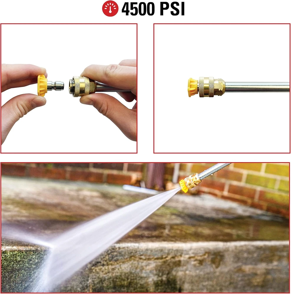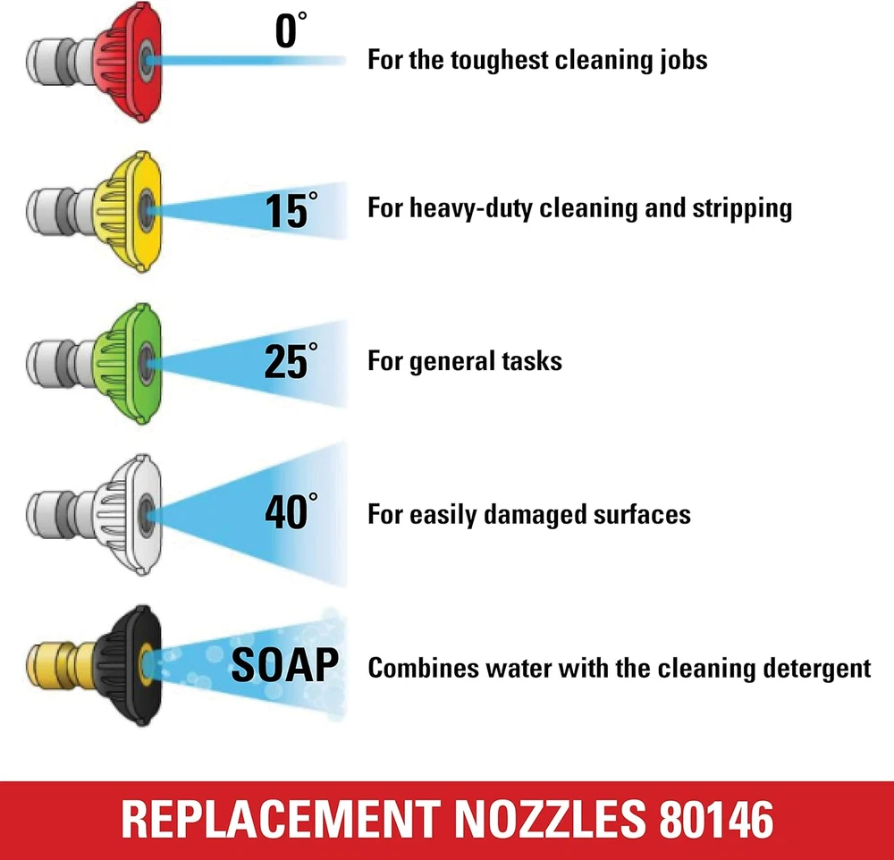 Universal fit: Simpson Pressure Washer Spray Nozzle Tips are a must-have accessory for any DIY or professional power washing project. These can be used for deck cleaning, concrete patios, paint preparation, sidewalks, lawn furniture and more; check out our guide to choose the correct nozzle for your project. Easy connections: The 1/4-Inch QC connection makes these nozzles easy-to-use with most power washer extension spray wands and lances; These nozzles are hot- and cold-water compatible 5 tips for any need: 0-degrees (red) for tough cleaning jobs; 15-degrees (yellow) for heavy-duty cleaning and stripping; 25-degrees (green) for general tasks; 40-degrees (white) for softer surfaces; Soap (black) allows you to combine water with cleaning soap for your task if applicable Quality construction: Simpson replacement nozzles are made for reliability and durability Specifications: Max PSI - 4500; Max temperature - 212° F; Orifice size - 4.0 Simpson 4500 PSI quick connect spray tips nozzle Set, Replace worn or lost spray tips for hot and cold water pressure washers, includes 4 high pressure, stainless steel quick connect spray nozzles and 1 low pressure spray nozzle, spray patterns: from pin point, for those tough jobs, to wide fan for low pressure cleaning, designed to fit most gas pressure washers with quick connect spray wands.