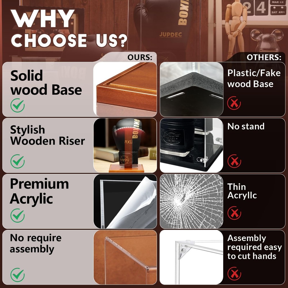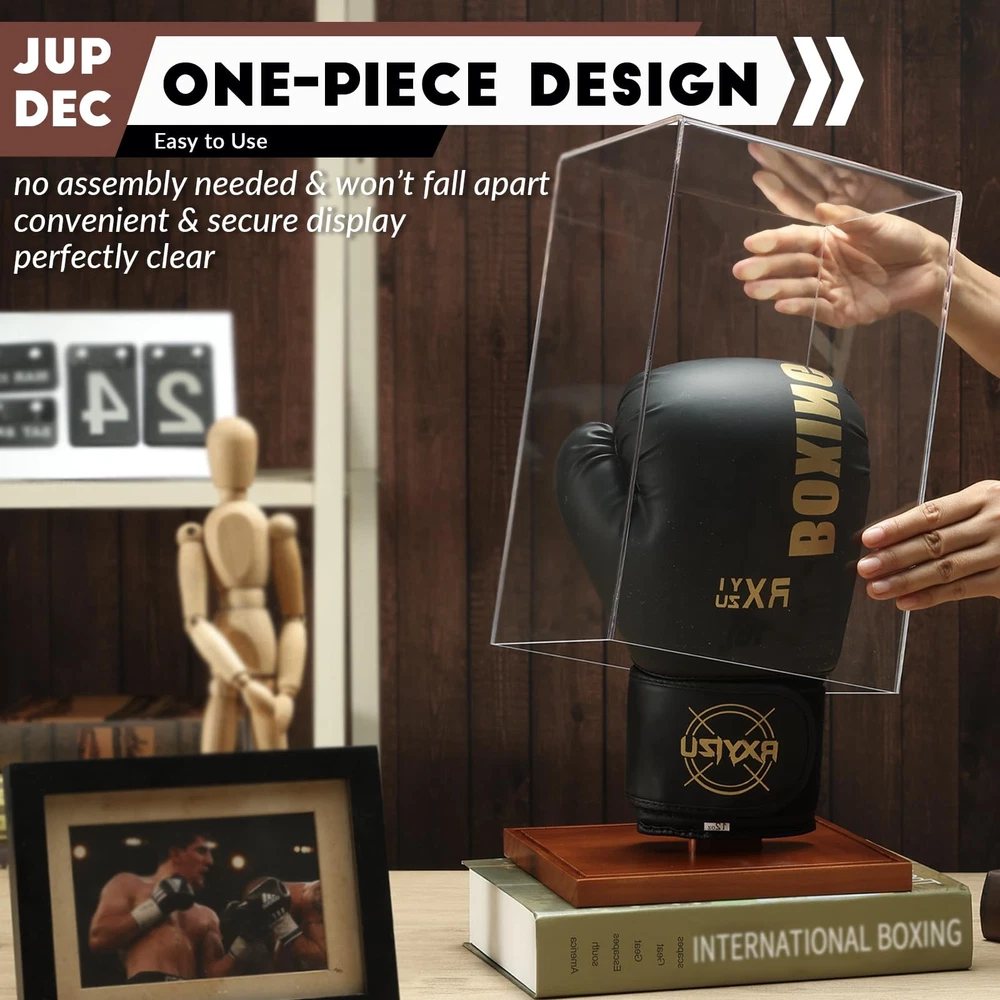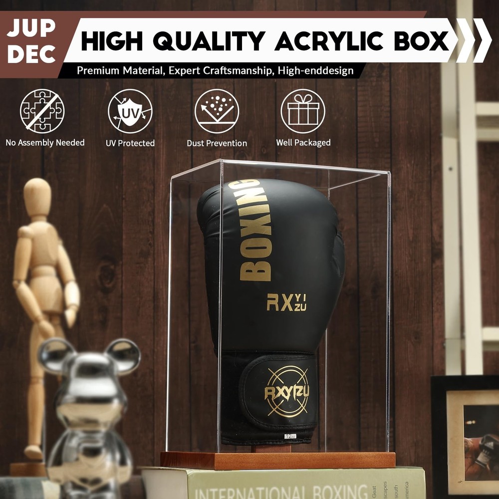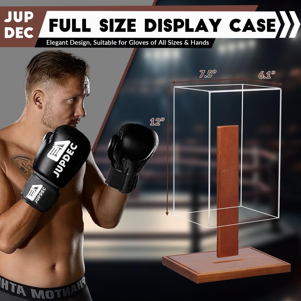 Boxing Glove Display Case, Clear Acrylic Showcase with Wood Base & Plank for Sin Easy Setup – Forget complex assembly! Simply attach the wooden plank to the base and adjust it left or right based on whether you're displaying a left-hand or right-hand glove. This allows your boxing gloves to be showcased at the perfect angle for a stunning display. In just a few simple steps, your prized gloves will look like a true champion’s trophy! Perfectly Compatible — Experience a display that makes your boxing gloves feel like they’re on their very own stage! Our adjustable wooden plank is thoughtfully designed to fit either a left or right glove, allowing you to showcase your prized possession just the way it deserves. This display box is perfect for highlighting a single glove only, making it an ideal fit for your favorite piece of memorabilia. We can’t wait for you to show off your champion’s glove in style! Crystal Clear Visibility — The premium acrylic case is made of 3mm thick High-quality acrylic material, 20% thicker than others. The transparency is up to 98%, which clearly shows the boxing glove's appearance and details clearly in 360°. It also prevents damage and scratches and keeps dust out, Give your collection a glamorous glow. Excellent UV Protection – Your gloves deserve to shine as brilliantly as the day you wore them! With our premium acrylic protective cover, you won’t have to worry about yellowing, aging, or peeling due to sun exposure stealing their vibrancy. Proudly display them at home or in the office—our UV protection ensures your gloves stay bold, pristine, and ready to inspire for years to come. It’s like having your own museum exhibit—only better! Full-Size Display Brings True Impact – With internal dimensions of 12" x 7.52" x 6.06", this display case is built to accommodate both men's and women's full-size boxing gloves, capturing the gloves' true essence and showcasing them in all their glory. This case brings authenticity and boldness to any setting, embodying the spirit of the sport and offering fans and collectors a premium way to appreciate the intricate details and quality of each glove. Compact and Elegant Design – Our display case is engineered to stand out in both compactness and visual appeal. Unlike bulky alternatives, our design offers a sleeker, more space-efficient profile that doesn’t sacrifice durability or protection. With attention to every detail, our display case enhances the beauty of your prized boxing gloves while minimizing their footprint, ensuring that your gloves are the true centerpiece, not the case. Timeless Craftsmanship Meets Modern Design – Meticulously crafted for quality, this sleek acrylic case rests on a beautifully finished wooden base, blending elegance with durability. Whether you’re displaying it at home, in your office, or at the gym, it’s designed to complement any setting while showcasing your gloves with style and pride. You’ll love how it seamlessly merges modern sophistication with timeless craftsmanship. Unforgettable Gift for Any Occasion – Whether it's a die-hard collector or a boxing enthusiast in your life, this display case makes for a premium, heartfelt gift. Perfect for birthdays, holidays, or celebrating a big win, it’s more than just a case—it’s a way to showcase memories and achievements in style. When they unwrap it, they’ll know you truly thought of something special! At JupDec, we believe in celebrating the passions and achievements of sports enthusiasts. Our products, from display cases to custom holders, are designed to not only protect but also elevate your memorabilia. Each item combines modern design with timeless craftsmanship, making every display as unique as the stories behind them. Whether you’re a seasoned collector or a casual fan, JupDec offers a piece of elegance and quality for every collection. We take pride in helping you showcase your victories, memories, and passions in the best possible way. Internal dimensions: 12" x 7.52" x 6.06" The set includes: 1 X Acrylic Glove Display Box 1 X Solid Wood Holder 1 X Solid Wood Base 1. Universal Glove Compatibility – Designed for both left and right gloves, the adjustable wooden holder offers flexibility that sets it apart from the competition. 2. UV Protection – Prevents fading and protects your gloves from sunlight and damage. 3. Durable Acrylic and Wood Construction – High-quality materials ensure long-lasting use and a professional display. 4. Easy Custom Setup – Quick and easy setup allows you to customize the holder’s position to your preference. 5. Perfect Gift – An ideal gift for collectors or boxing fans, whether for birthdays, holidays, or special achievements. In summary, this Boxing Glove Display Case is not just a protective cover but a showcase of your passion and achievements. With UV-resistant acrylic, a versatile wooden holder that fits both left and right gloves, and premium craftsmanship, it ensures your gloves stand out with elegance and protection. The quick setup and timeless design make it ideal for collectors, boxing enthusiasts, or as a memorable gift. Display your gloves proudly, knowing they're preserved in style with JupDec’s thoughtfully designed display case. Shipping We offer FREE shipping on all orders! We ship within Three business days of payment, usually sooner. We use a selection of shipping services such as UPS, FedEx, USPS etc. We only ship to the lower 48 states, no APO/FPO addresses or PO Boxes allowed. Local pickups and combined shipping options are not provided at this time. Return You can return a product for up to 30 days from the date you purchased it. Any product you return must be in the same condition you received it and in the original packaging. Please keep the receipt. Payment We accept payment by any of the following methods: PayPal Please pay as soon as possible after winning an auction, as that will allow us to post your item to you soon