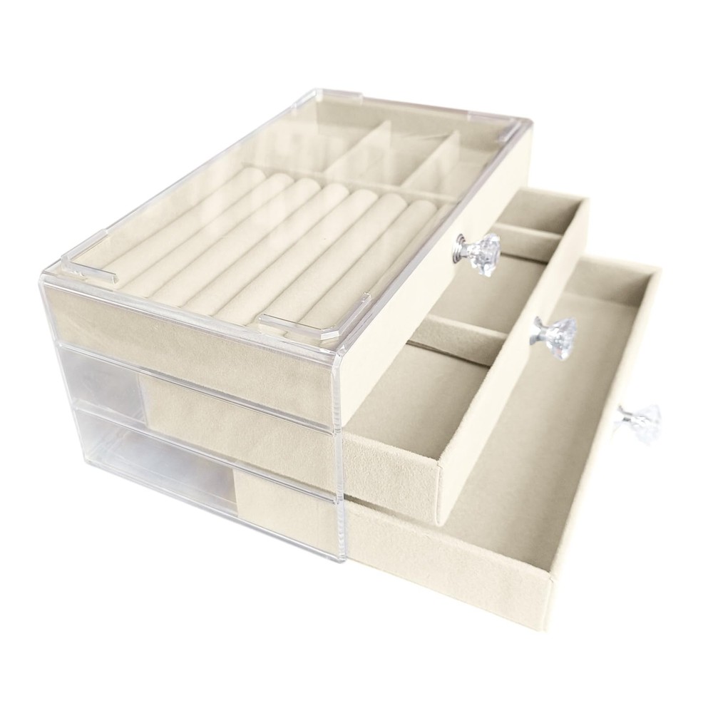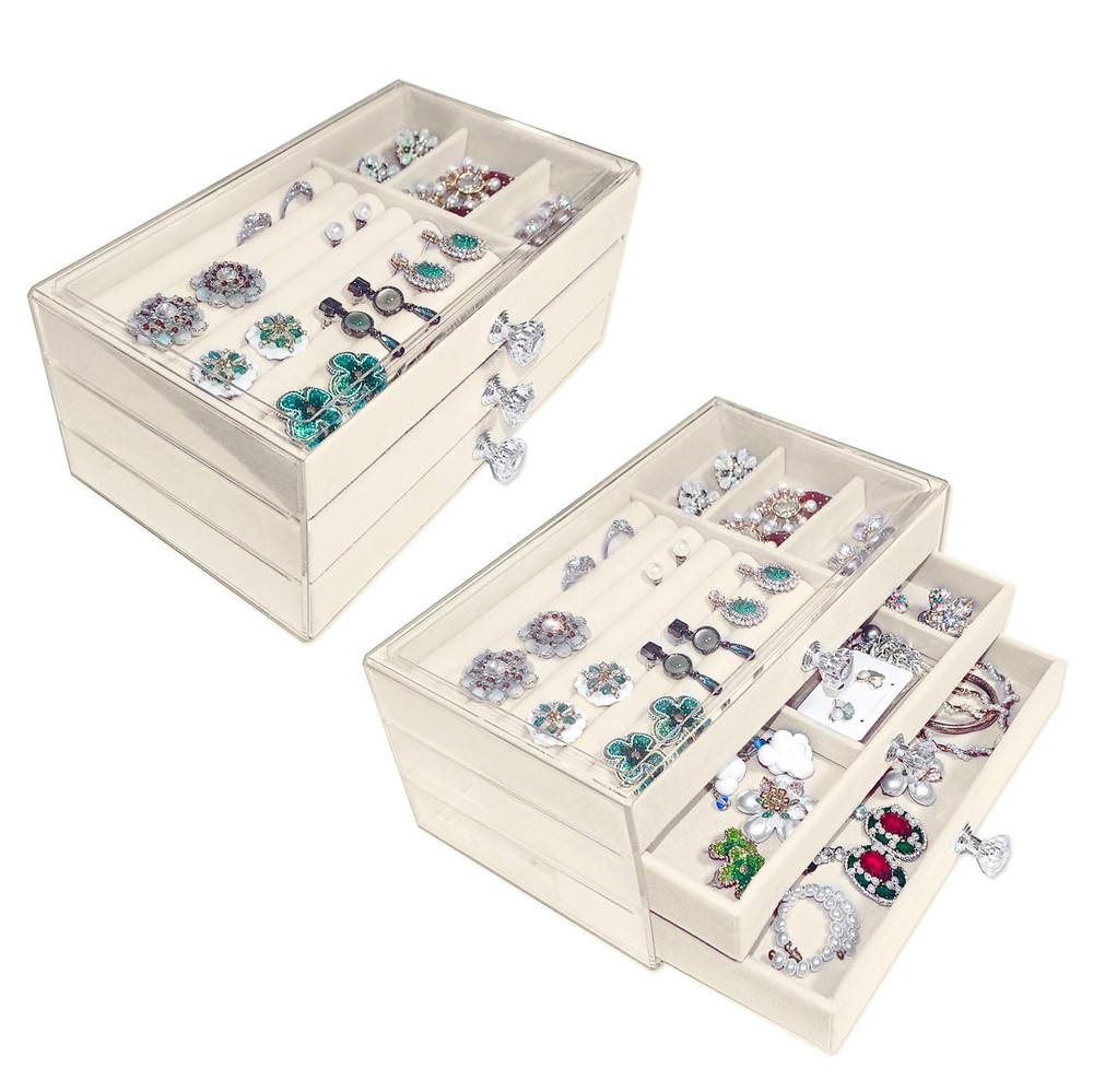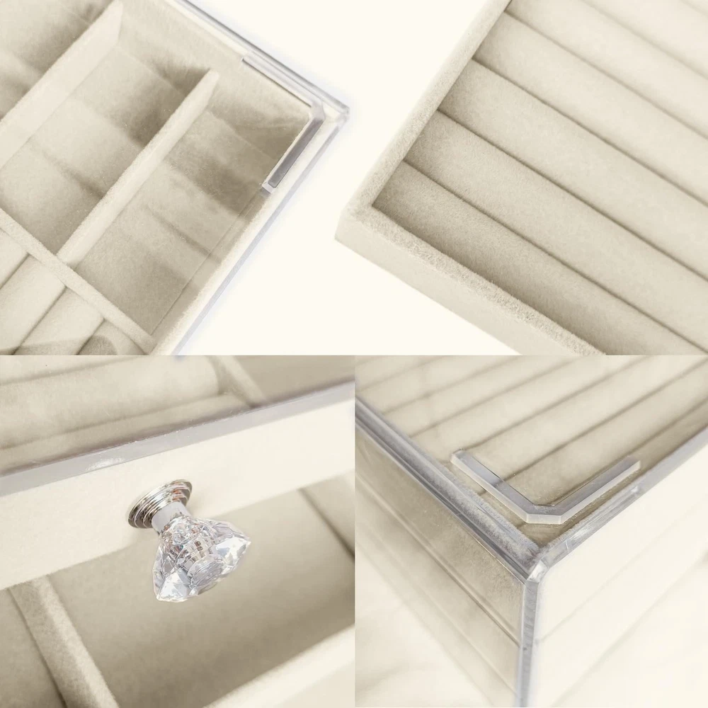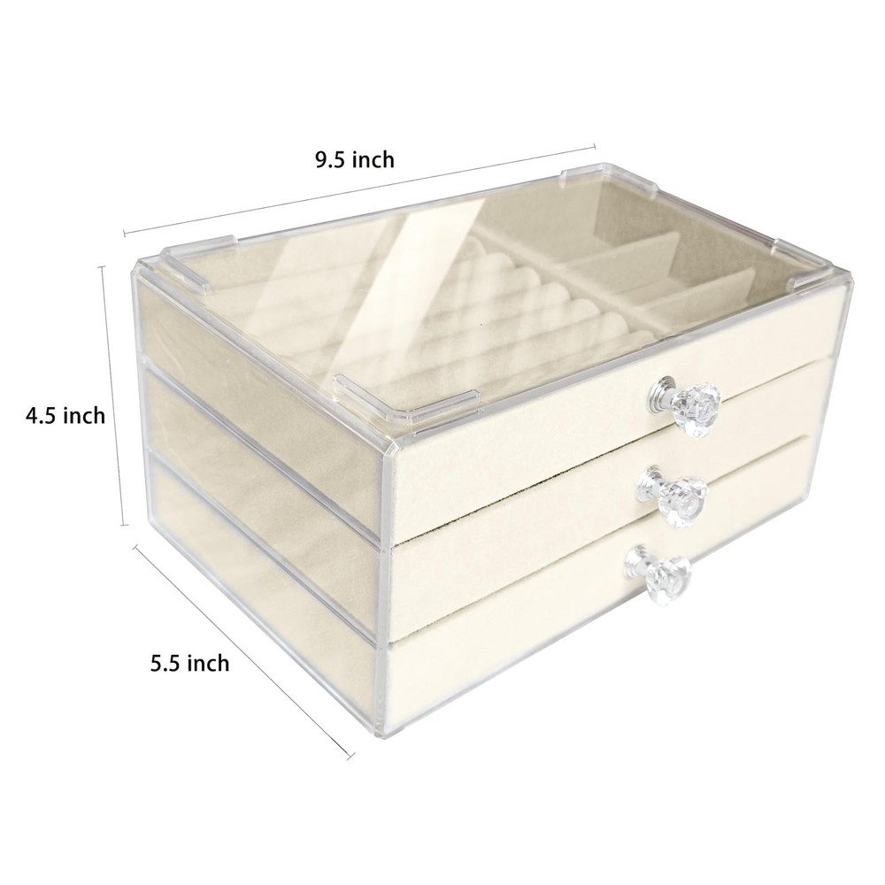 Acrylic storage box dimension is 9.5″ x 5.5″ x 4.5″. It is made with crystal-clear material and velvet lining, keeps your cherished jewelry dust-free, and it's easy to clear the box with the damp cloth.velvet tray make Jewelry box stylish look and provide your jewelry better protection. Velvet jewelry box with 3 layer drawers, each drawer attached with a diamond-like handle that slide out smoothly. Top layer has 8 slots to hold rings and earrings and 3 grid for some small jewelry. Middle layer possess 6 different section for different storage meet. And the bottom drawer with no divider can contain some big jewelry or Medallions. This Jewelry box can rearrange the drawers and trays according to your needs, DIY the space you need with the adjustable dividers in compartments, the velvet trays drawers also can be took out for use independently. Clear Acrylic Organizer is the best jewelry box to storage your jewelry and also a cosmetic storage box. So It is great gift for girls or fashion lover in your life. It can hold a lot of accessory and jewelry like rings, ear studs, necklace, pendants, bracelets, cufflinks, brooches, coins and so on. You will leads your small jewelry in order and easy to find.