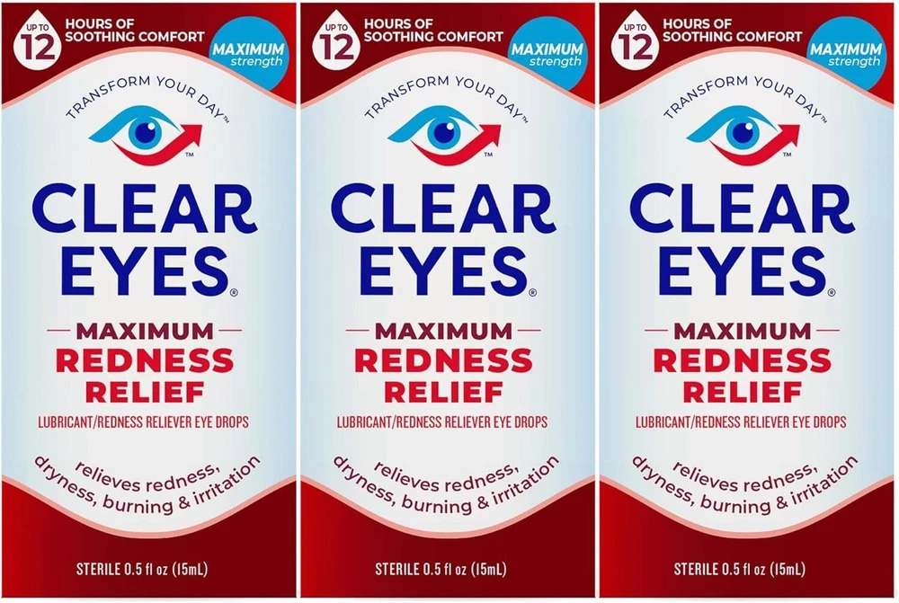 Brand Clear Eyes Special Feature Clinically Proven Item Weight 0.18 Pounds Item dimensions L x W x H 0.88 x 5.64 x 3.75 inches Product Benefits Redness Removal, Relieves Dryness, Soothing, Relieves Burning and Irritation, Eye Care Clear Eyes Maximum Redness Relief Eye Drops provide fast-acting, maximum strength relief from redness and irritation Contains maximum strength redness relief available without a prescription Relieves burning and irritation due to eye dryness and helps to protect against further irritations Clinically proven whiter eyes for a difference you can see (compared to untreated eyes) From the #1-selling eye drops brand Provides up to 12 hours of soothing comfort Contains 3 bottles of Clear Eyes Maximum Strength Redness Relief Eye Drops, 0.5 fl oz FSA- and HSA-eligible product in the U.S.