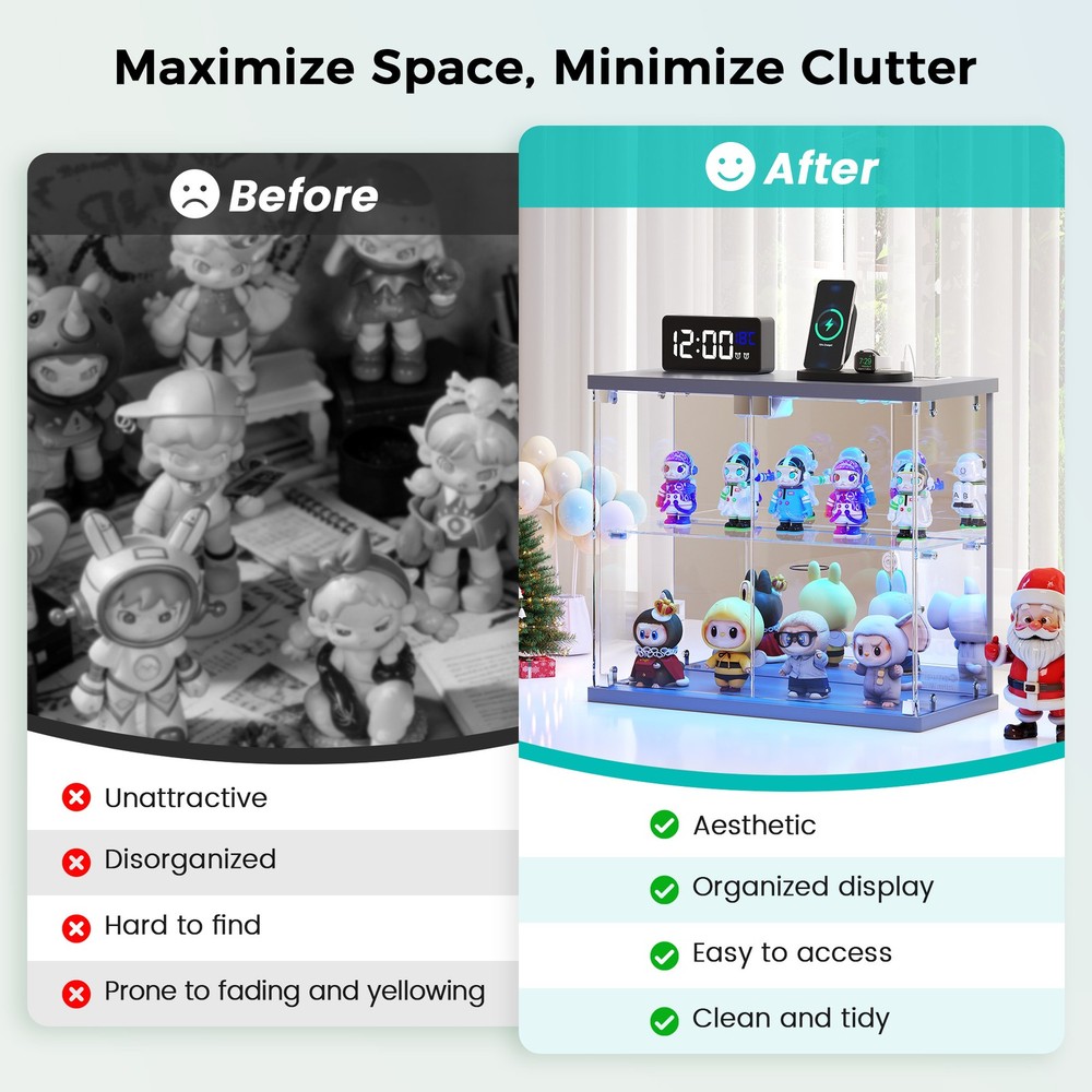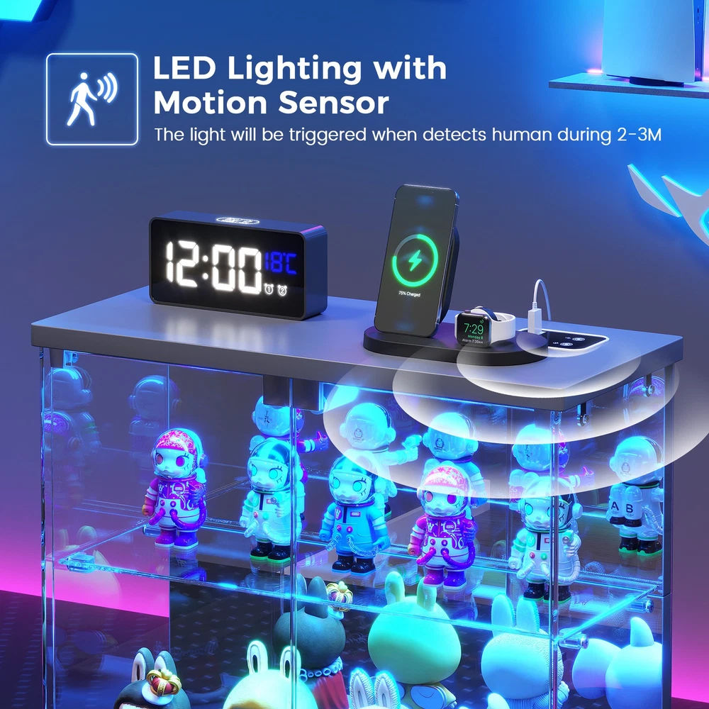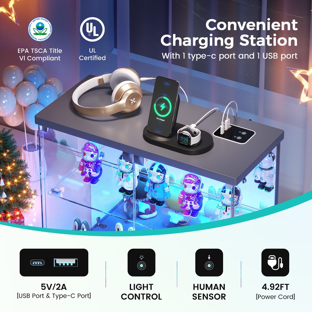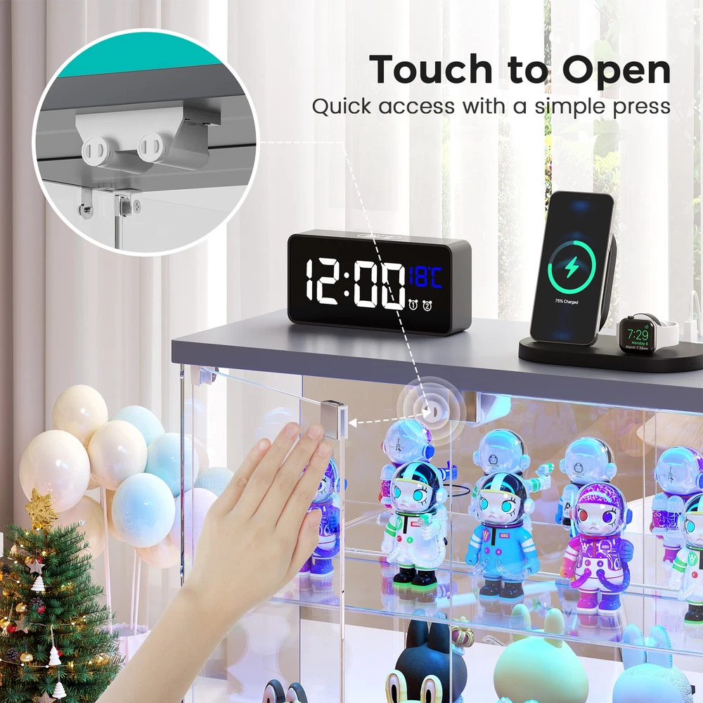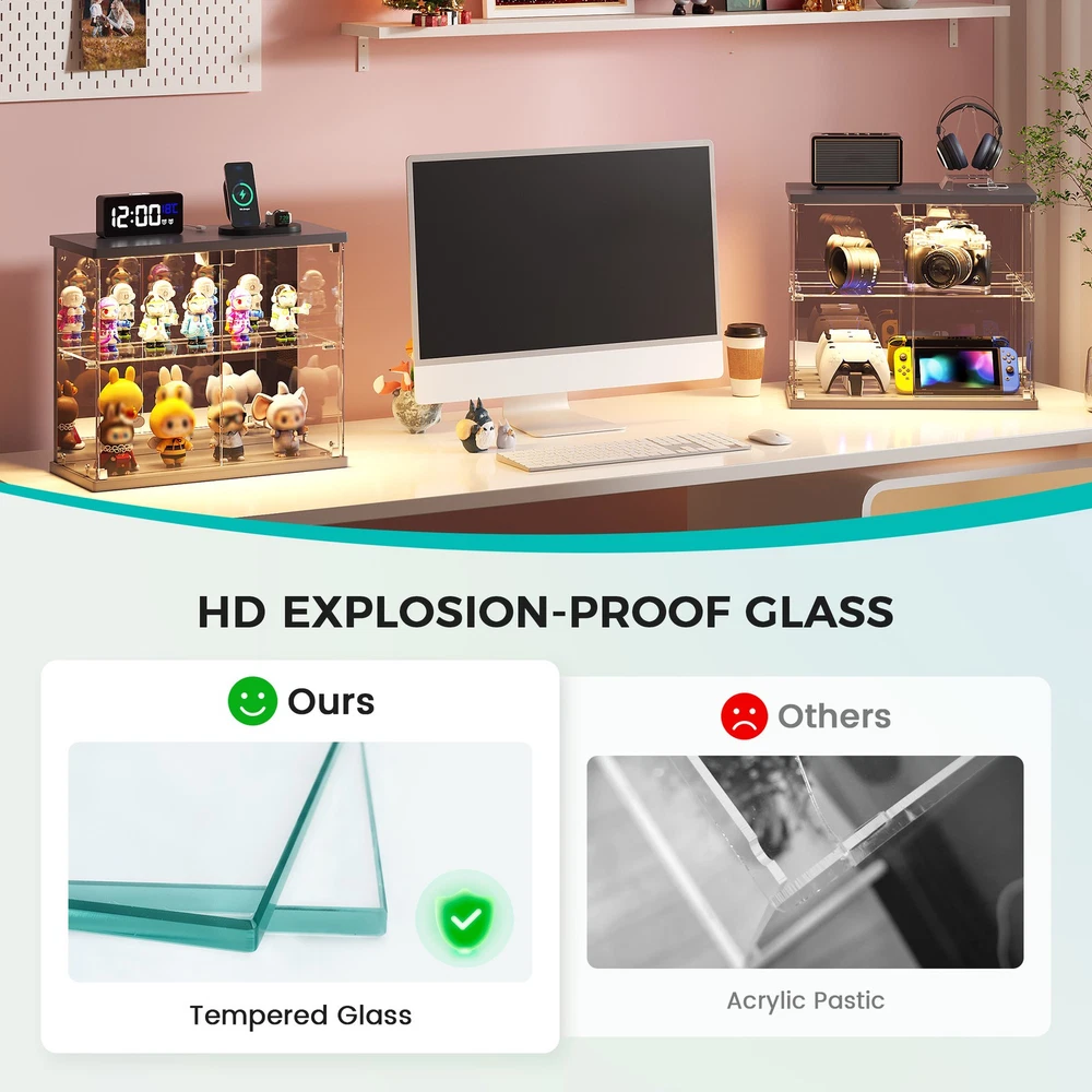 Magnetic Door with Safe Tempered – Featuring a press-to-open design, you can easily access your items with just a gentle push. This display box utilizes explosion-proof tempered glass is both crystal clear and safe. It effectively dustproofs and yellowing resistance that let your small Lego displays, perfumes, toys, or décor can be completely visible Light Control Module with Motion Sensing - This smart showcase upgrades your collection display with built-in LED lights(white, yellow, blue). The human sensor automatically switches the lights on when you approach within 1 meter, and turns them off after 30 seconds, achieving both energy efficiency and a stunning visual display Integrated Charger Station – This display organizer comes equipped with a built-in Type-C and a USB port, enabling simultaneous charging for two devices. Conveniently power your phone, tablet, earbuds, or smartwatch without the need for extra adapters. Keep your essentials fully charged overnight while maintaining a clean, cable-free display surface Mirrored Back Panel – With a mirrored back, this glass display case reflects your collectible figurines, visually expanding the space and adding remarkable depth to each piece. Not only does it brighten the entire display, but it also turns any ordinary space into a dynamic and eye-catching part of your bedroom Easy Assembly with Clear Instructions – Each panel is clearly labeled, and detailed step-by-step guides will walk you through the process. For optimal ease, using power tools is better. Enjoy a creative hour of assembly as a rewarding project with your partner or family Our product frames are all made of FSC-certified wood Lighting for Your Display Charge Hub for Your Desk Tempered Glass: Why It’s Clearly Better Gifts to Display & Delight