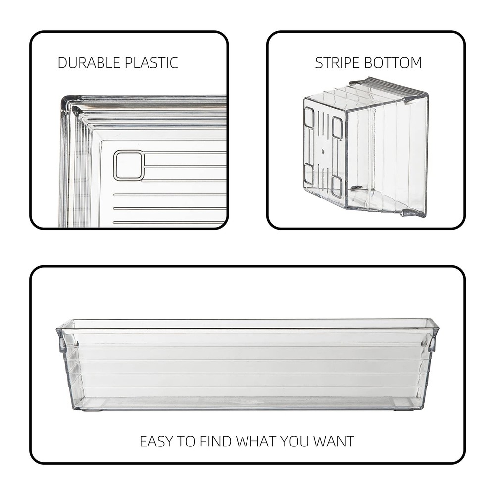 Clear Plastic Drawer Organizer Tray for Vanity Cabinet (Set of 10),Storage Tray for Makeup, Kitchen Utensils, Jewelries, and Gadgets Includes:(2) 12 L x 3 W x 2 H in, (4) 9 L x 3 W x 2 H in, and (4) 3 L X 3 W X 2 H Material: Acrylic(Plastic) Features: Clear ,Easy to Clean,Eco-friendly,Transparent,BPA Free,Unbreakable,Recycled. Mix and match for any drawer size and storage need. Packing: bubble pack + plastic wrap +Outer Catrton Shipping We offer FREE shipping on all orders! We ship within Three business days of payment, usually sooner. We use a selection of shipping services such as UPS, FedEx, USPS etc. We only ship to the lower 48 states, no APO/FPO addresses or PO Boxes allowed. Local pickups and combined shipping options are not provided at this time. Return You can return a product for up to 30 days from the date you purchased it. Any product you return must be in the same condition you received it and in the original packaging. Please keep the receipt. Payment We accept payment by any of the following methods: PayPal Please pay as soon as possible after winning an auction, as that will allow us to post your item to you sooner! Feedback Customer satisfaction is very important to us. If you have any problem with your order, please contact us and we will do our best to make you satisfied. Contact Us If you have any queries, please contact us via ebay. We usually respond within 24 hours on weekdays. Please visit our eBay store to check out other items for sale! Thank you for shopping at our store.