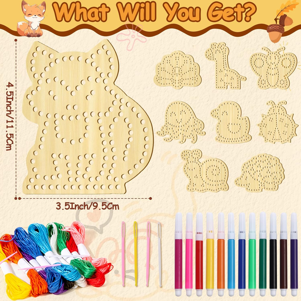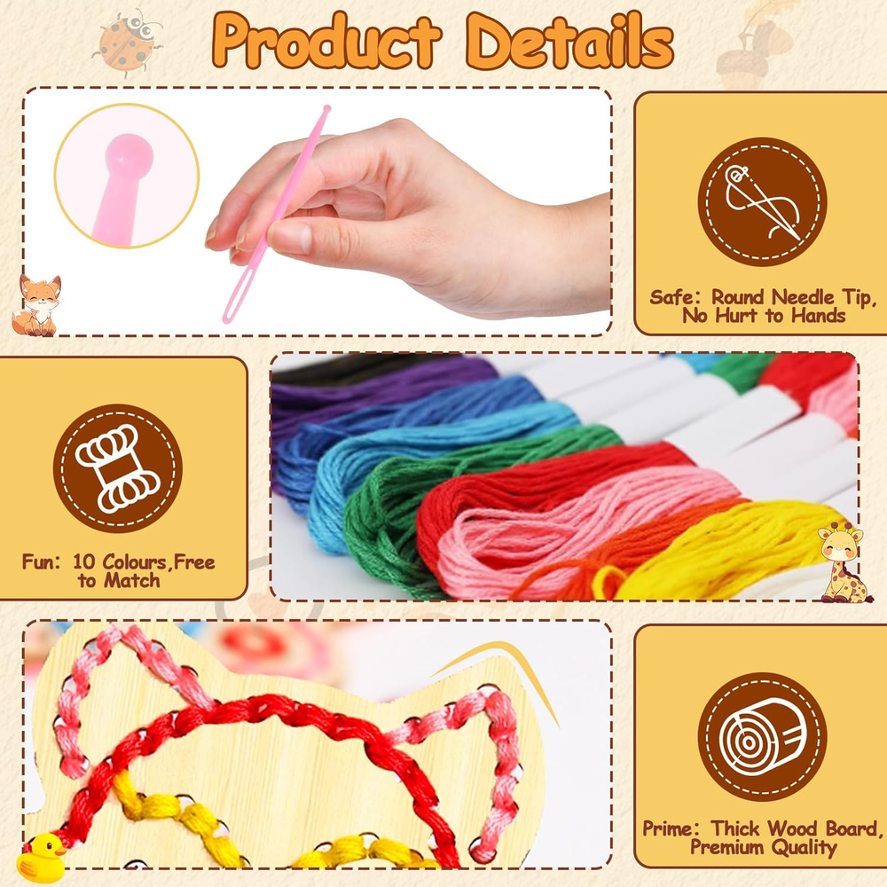 All-in-One Lacing Cards Set for Kids – Spark creativity and fine motor skills with our Montessori wooden lacing cards! This kids craft kit includes 9 adorable animal-shaped lacing cards, safety needles, colorful yarn, and 12 vibrant markers—everything needed for hours of arts and crafts for kids ages 4-8. Perfect for preschool learning activities, this set makes a fantastic travel toy and special education classroom must-have! Toddler-Friendly & Safe Materials – Crafted from smooth, durable wood, our Montessori toys for 3-year-olds and up are free from sharp edges and safe for small hands. The included toddler craft supplies—soft yarn and safety needles—ensure a frustration-free experience for little learners. Ideal for crafts for toddlers and preschool learning toys! Fun & Educational Fine Motor Skills Toy – Designed to improve fine motor skills for 3-5 4-8, our lacing cards help little hands develop hand-eye coordination, patience, and dexterity. Whether used as preschool games, learning toys for kids 3+, or manipulatives for preschoolers, this set turns playtime into a fun learning adventure! Perfect for Kids Crafts & Travel Activities – Whether at home, in the classroom, or on the go, this kids crafts 3-8 set is a great screen-free activity! Compact and lightweight, it makes an excellent travel activity for toddlers. Keep children engaged with lacing cards for kids ages, promoting sensory play and pre-K learning activities anytime, anywhere. Ideal Preschool Gift for Boys & Girls – Looking for the perfect educational toy for your kids? This toddler arts and crafts kit is a delightful birthday, holiday, or back-to-school gift. Encourage creativity and learning with this engaging preschool learning toy—perfect for toddler activities, crafts for kids ages 3-5, and learning resources for 3-year-olds! Product Description Cleboen 9-in-1 Montessori Sewing Kit for Kids Includes adorable wooden animal lacing cards —fox, peacock, ladybug, and more! Designed to improve fine motor skills, cognitive development, and hand-eye coordination , making it an ideal STEM toy for toddlers. Safe, durable, and endlessly fun! Perfectly Sized for Little Hands! Each wooden lacing board is designed for easy handling and safe stitching . The kit includes colorful embroidery floss, plastic needles, and markers , ensuring a fun, engaging, and mess-free crafting experience for kids aged 3+ years . Learn Through Play – A Fun & Educational Sewing Kit! This DIY threading toy helps kids develop fine motor skills, color recognition, patience, and hand-eye coordination . Perfect for Montessori learning , it encourages independent play while fostering creativity and problem-solving skills . A must-have for early childhood development! Fun Family Bonding Time This interactive sewing toy is perfect for parent-child activities , making learning fun while strengthening bonds. Watch your child develop focus, patience, and creativity as they stitch adorable animal patterns . A great way to enjoy screen-free playtime together! Perfect Holiday & Birthday Gift for Kids Looking for the best educational toy for your little one? This Montessori-inspired wooden sewing kit is an excellent choice! Ideal for Christmas, birthdays, and special occasions , it sparks creativity while enhancing fine motor skills and hand-eye coordination . Give the gift of fun and learning today!