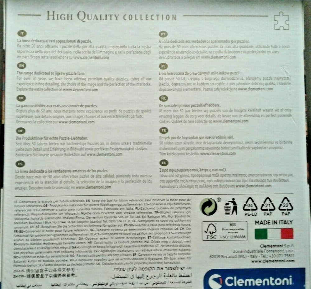 MPN:8005125318193Theme:Landscapesgtin13:Does not applyCountry/Region of Manufacture:ItalyNumber of Pieces:1000 - 1999 PiecesMaterial:CardboardUPC:Does not applyAge Level:17 Years & UpBrand:ClementoniColor:Multi-Color