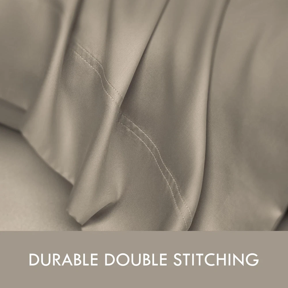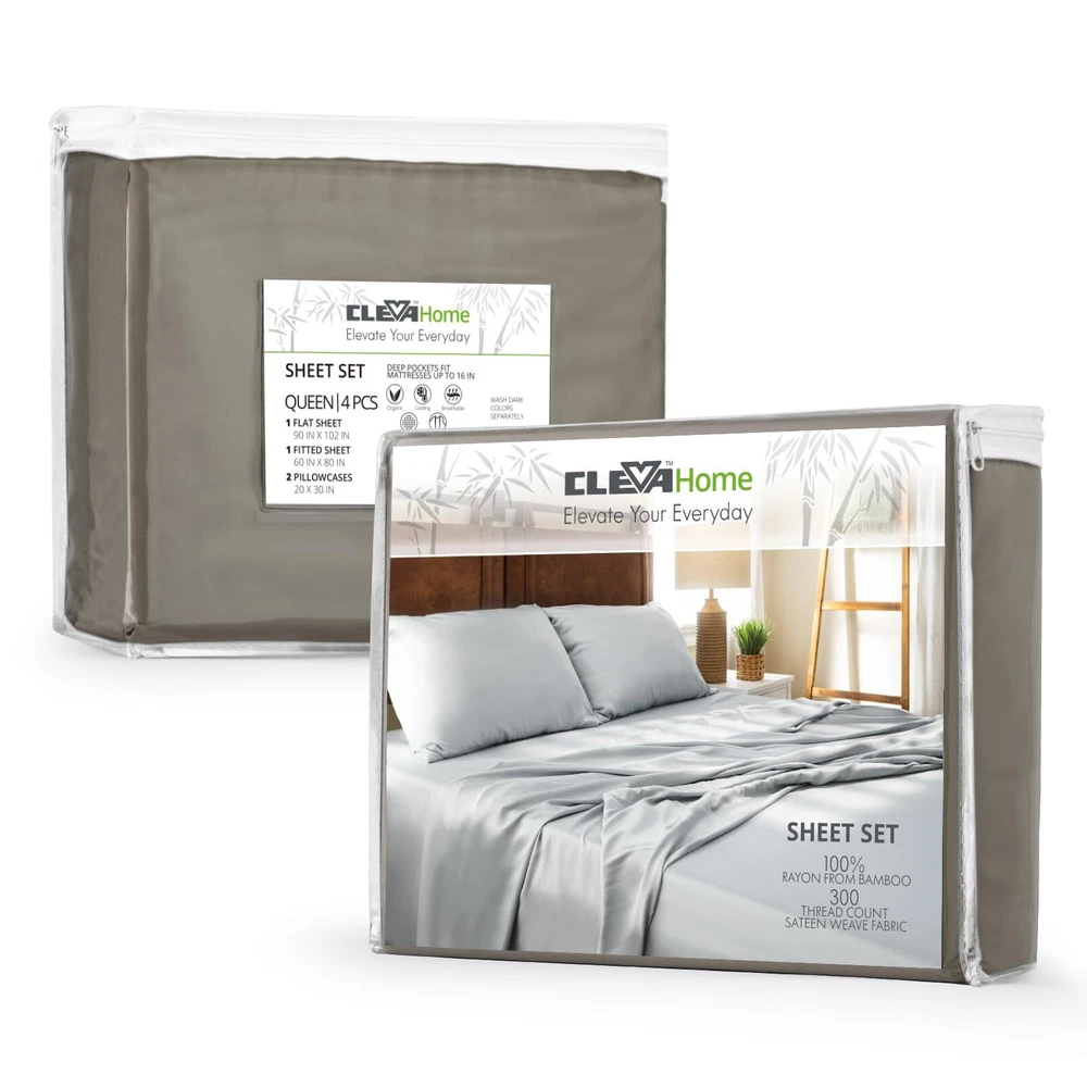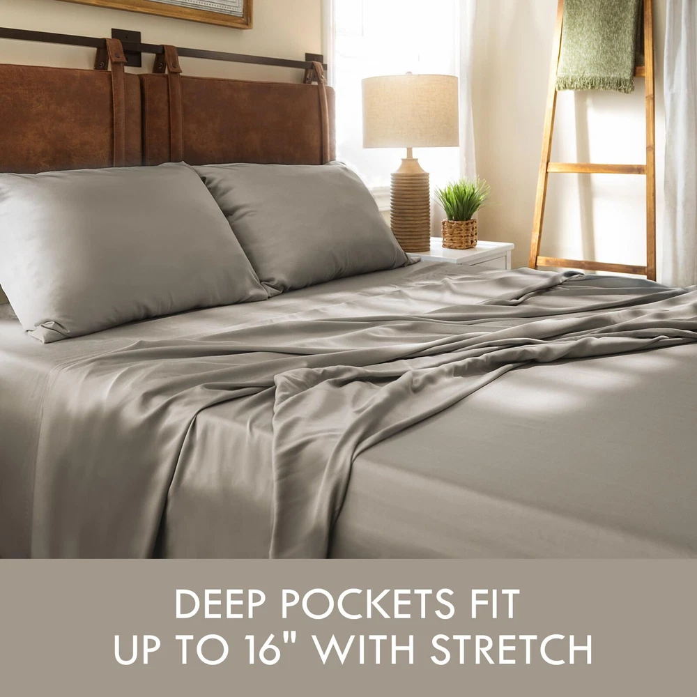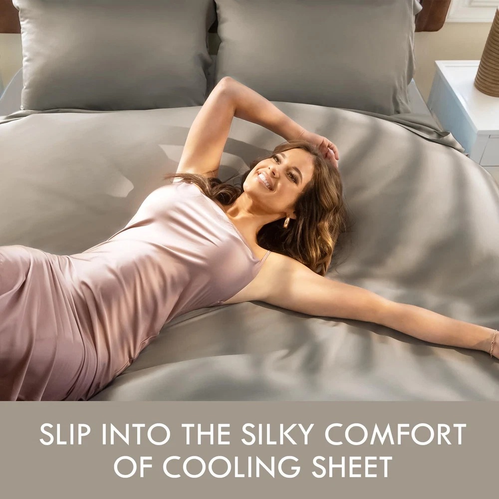 4 PIECE BED SHEET SET: Includes 2 Pillowcases, 1 Flat Sheet, and 1 Fitted Sheet. Flat Sheet (90" x 102"), Fitted Sheet (60" x 80"), Pillowcases (20" x 30"). Deep Pocket Sheet Set: Indulge in luxury with our elasticized deep-pocket sheet, fitting mattresses up to 16 inches thick. Its versatile size suits most beds, even smaller ones. Ultimate Coolness and Softness: Experience cool comfort with our bedding. It naturally regulates temperature, wicks away moisture, and offers ultimate softness. Perfect for hot sleepers and sensitive skin. Super Soft Sheets: Crafted from 300 TC satin fiber fabric, our bedding sheets are incredibly soft, smooth, and silky. 300 thread count is the optimal choice for pilling resistance as higher thread counts mean thinner and weaker fibers. Certified Safety: Our bed sheets are OEKO-TEX Standard 100 certified, ensuring bed sheets do not contain harmful chemicals. Recommended care includes cold washing, gentle cycle, and avoiding bleach or fabric softener. Tumble dry on low heat and remove immediately to avoid wrinkles. Use a warm iron if needed.