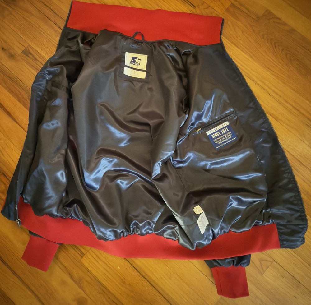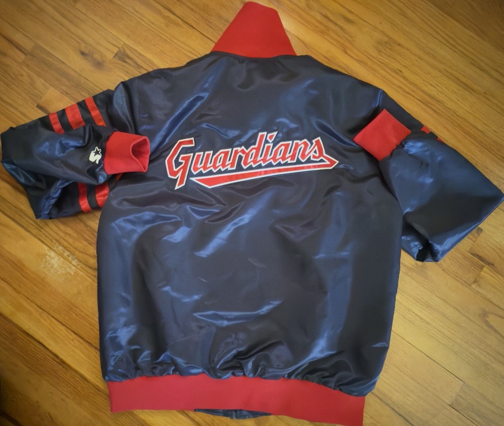 The Cleveland Guardians Starter jacket is an officially licensed MLB baseball jacket in size XL, featuring the team logo and colors. This jacket is perfect for men who are fans of the Cleveland Guardians and want to show their support during the regular season. It is in great shape and ready for purchase, making it a valuable addition to any baseball fan's wardrobe.