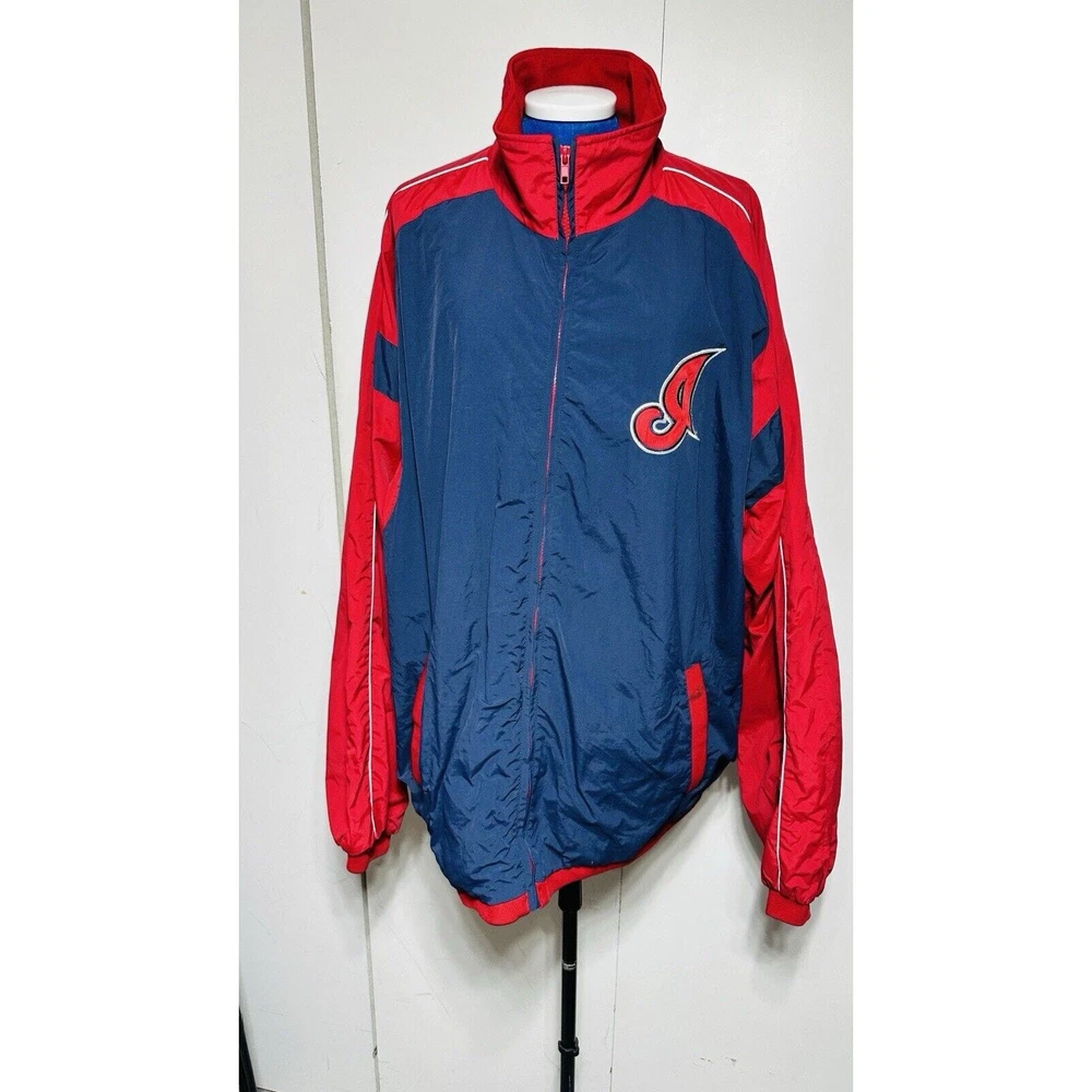 Excellent Condition Show off your support for the Cleveland Indians with this Majestic brand windbreaker jacket featuring the iconic Chief Wahoo logo. The jacket is a size XXL and comes in a striking blue color with accents of red. It is perfect for any fan of the Major League Baseball team and is made in Korea, Republic of. This jacket is a must-have for any Cleveland Indians fan. It is made of high-quality materials and features a full zip design for easy wear. The jacket is designed for men and is perfect for showing off your team spirit. Get yours today and add it to your collection of fan apparel and souvenirs!