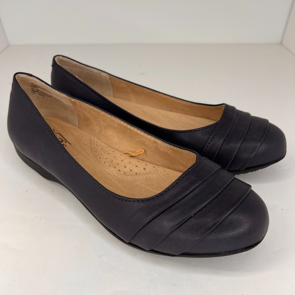 Elevate your casual style with these Cliffs by White Mountain Women's Clara Navy Flats . These slip-on ballet shoes are perfect for travel, business, and everyday wear. The solid black color and round toe shape make them versatile for any outfit, while the faux leather lining material and cushioned insole provide comfort all day long. The rubber outsole ensures durability and traction, and the foam insole adds to the cushioning effect. These flats are available in UK size 6, US size 8.5, and EU size 39, with a W shoe width. These shoes are suitable for summer, fall, and spring seasons. Add these stylish and comfortable flats to your wardrobe today! 100% CUSTOMER SATISFACTION IS OUR GOAL! Our items are always carefully examined for condition, measured if necessary, and photographed in a climate controlled and smoke-free environment. We make every attempt to accurately describe and clearly picture the items we have for sale. Please, ALWAYS view all of the photos. We value your business and our goal is your complete satisfaction. FAST SHIPPING All items are packaged with care and shipped out the same or next business day via USPS, FEDEX, or UPS with tracking numbers so you are always informed. RETURNS We offer a 30-day return policy. All items must be unused and unopened in the condition in which they were received, with original packaging, and all accessories included for return. REVIEWS - CUSTOMER SATISFACTION - COMMUNICATION We aim to make you happy. After you receive your shipment, please leave a positive review . If you have concerns or questions about your order, please contact us so we can resolve the issue. We will do our best to make you satisfied. THANK YOU FOR YOUR BUSINESS!