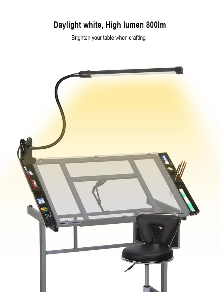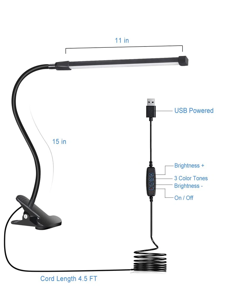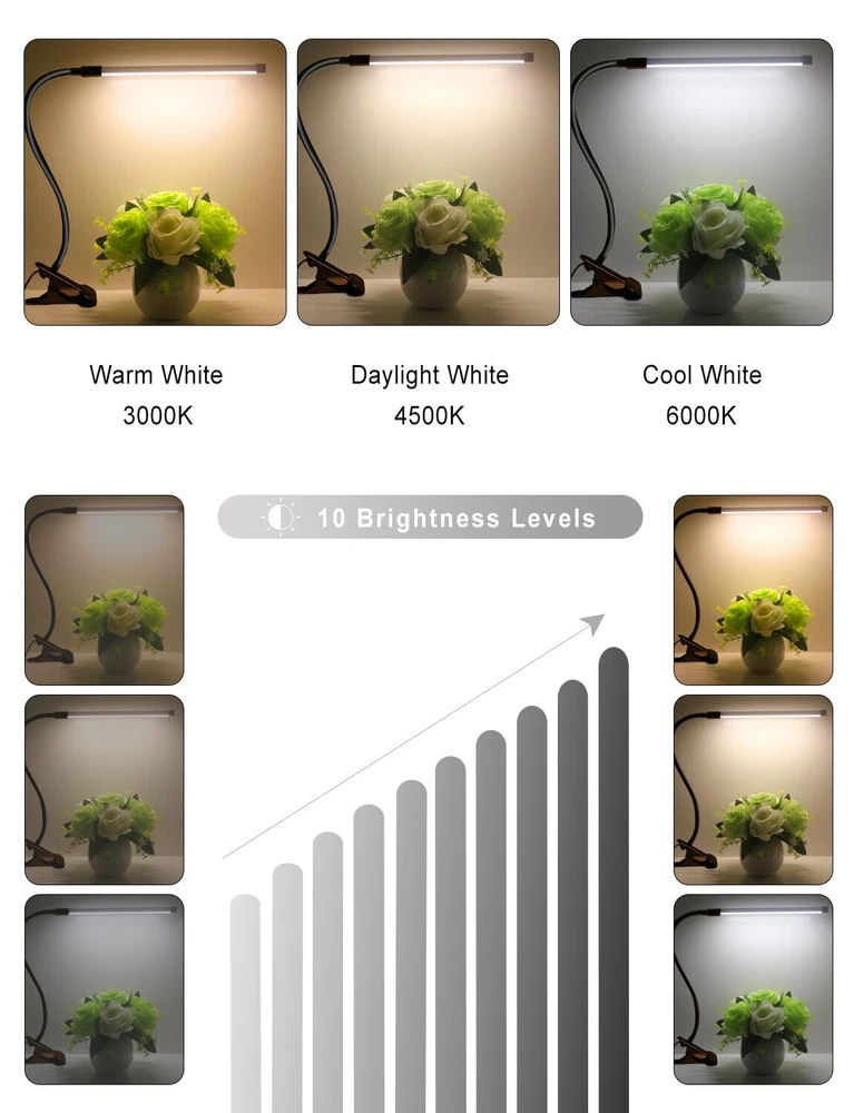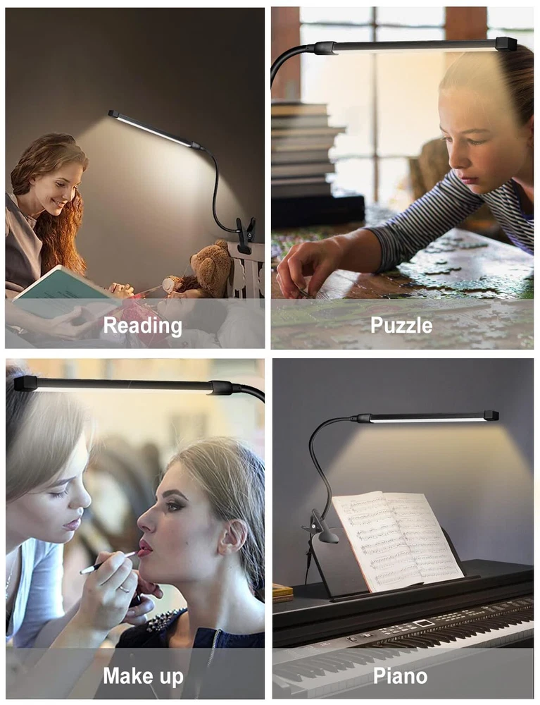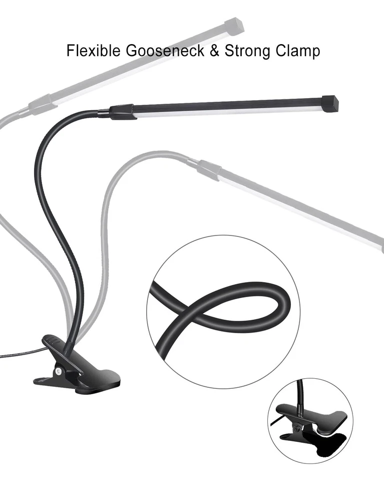 Description Feature 1)3 color modes in 1 lamp.Working,study or reading,relaxing 2)10 dimmable levels to turn up and down(10%-100%) 3)LED eye protection,energy saving,no flicker,no dazzling 4)Aluminum alloy high end manufacturing,good heat dissipation 5)Flexible mental gooseneck and sturdy clip-on at your DIY modeling, perfect space saver 6)USB cable to computer,tablet PC,power bank 7)Life time lasts for 50000 hours 8)Memory function 9)8W clip reading lamp is equal to 40W tranditional lamp 10)As a bed reading light, you could adjust the flexible neck and position it properly,never disturb your family menber nearby 11)Perfect for working as office lamps, reading lamps and study lamp for children, task lamp for architects and artist and bedside table lamps,workbench lights,writing lights,clamping lamp,architecture lighting 12)18 months warranty,24hrs service,30-DAY money back guarantee Specification Product Name:Clip On Desk Lamp Rated Power:8W Input Voltage:5VDC /2 A LED Color:Warm white,pure white,cool white Color Temp:2700-3200K,4000-5000K,6000-6500K Mode:Relaxing,reading or study,working Light Flux:640lm,760lm,800lm Beam Angle:180 degree LED Bar Dimension:L11xW0.8XH0.9 inch Flexible Arm Dimension: Diameter 0.4x15 inch for all space Clamp Dimension:L4.5xW.32xH2.5inch Clip-on Height:2.4 inch Cable Length:4.5 FT Net Weight:0.5 bl Certification:CE RoHS Application:Bedroom,study room,studio,office,dormitory,kitchen etc What is in the box 1x modern clip on led desk lamp 1x user manual Back to School Supplies, Paint and Work in Natural Daylight: Easel light offers a natural and soft light close to the sunlight(CRI>90), ensuring your artwork pops with precision and vibrancy. Task lamp is eye caring, free from flicker and glare. Flexible Neck and Sturdy Clip: The 15-inch flexible yet strong gooseneck can be twisted into various shapes and stays in place, allowing precise light placement for your art projects. The clip, lined with sponge, opens up to 2.4 inches, securely holding onto surfaces without damaging furniture. With a 6 FT long USB power cord, you won't need an extension cord even if there isn't an outlet nearby. 3 Color Modes and 10 Brightness Levels: The clip on desk lamp offers warm light(2700K), warm white light(4500K), and cool light(6000K), suitable for reading, studying, relaxing, working, thinking, relaxing, drawing, knitting, sewing, puzzles etc. Adjust the lighting with the 10-step dimmer to ensure the perfect illumination for any creative task. Durable Aluminum Construction and Extended Lifespan: The bedside reading lamp is crafted from high-quality aluminum, ensuring superior heat dissipation and preventing it from getting hot during use. This results in an extended lifespan of up to 50,000 hrs. Lightweght and Memory Function: This dimmable LED desk lamp is versatile and easily used on easels, bookshelves, dorm rooms, music stands, pianos, office tables, computer desks, bed headboards, drawing boards, makeup tables, desktops, and for various crafts. When turned on, the table lamp for desk automatically recalls your last setting.