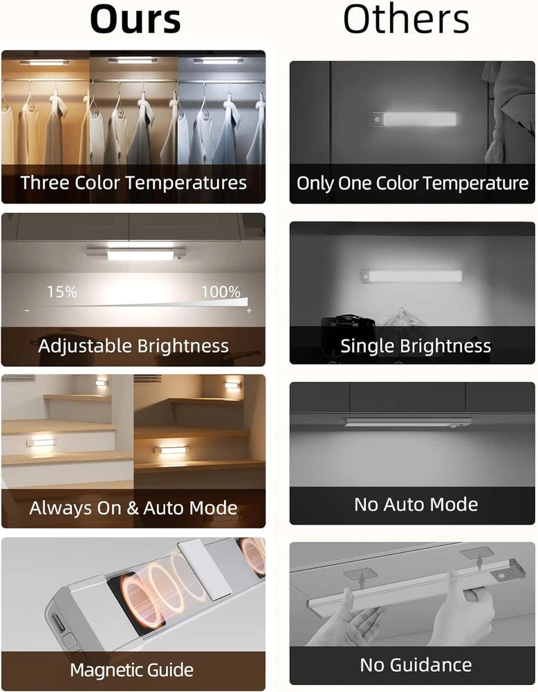 Menu Other Items Feedbacks About Us Contact Us Add To Favorites Closet Lights, 30 LED Rechargeable under Cabinet Lighting Wireless, 3 Color Temps under Cabinet Lights, Dimmer Motion Sensor Light Indoor for Kitchen, Cabinet, Bedroom, Wardrobe (3 Pcs) 【PIR Motion Sensor & 3 Modes 】 The motion sensor automatically switches the under cabinet lighting on when movement is detected within a 10 ft / 120°range. In Always-on mode, enjoy seamless and non-stop lighting for all your needs. In Night Mode, light will automatically turn on when motion is detected at dark environment. 【3 Color Temperatures/ Adjustable Brightness】 There are three color temperatures for your selection: Warm Light (3000k), Warm White Light (4200k), and White Light (6500k). You can also freely adjust the brightness. Simply control with button – single press to change color temperature and long press to adjust brightness. 【High-Capacity Battery】 The 500mAh rechargeable battery can last for 15-30/ days with an illumination frequency of 10-20 times daily for 20s each in AUTO mode, and it can stay illuminated for 4-5 hours with the maximum brightness in Always-On mode. (Note: Please charge before first use.) 【Easy Installation】Having magnets integrated into the back, this light snaps directly onto the mounting strip as well as any other magnetic metal surface like a fridge. The adhesive on the mounting strip has strong bonding characteristics also with water and heat resistant ability. 【Wide Application】 Illuminate any space effortlessly with our versatile under-cabinet light. Perfect for kitchens, offices, workshops, and closets, this reliable and energy-efficient lighting solution is designed to enhance a variety of settings. Enjoy bright, clear illumination wherever you need it most. 【We Care About You】— If the product arrives damaged or if there are any quality issues, please contact EZVALO directly, and we will provide you with a satisfactory solution. We genuinely care about every customer's shopping experience! Product Description The video showcases the product in use. The video guides you through product setup. The video compares multiple products. The video shows the product being unpacked. 1 Motion Sensing Detection 2 Multiple Bright Choices 3 Day & Night Mode 1 500mAh Battery 2 Strong Magnetic 1 Kitchen 2 Wardrobe 3 Bookshelf Item Specification Item model number EZL2417A-20 Light Source Type LED Style Modern Number of Items 3 Power Source Battery Powered Number of Light Sources 30 Control Method Touch Switch Type Touch Theme Modern Lighting Method Downlight Unit Count 3.0 Count Room Type Garage, Closet,Cabinet, Workshop, Stairwell, Storage Room, Kitchen, Bedroom, Hallway, etc Efficiency Energy Efficient Product Dimensions 7.87 x 1.46 x 0.89 inches; 9.14 ounces Material Aluminum, Plastic, Acrylonitrile Butadiene Styrene Required Assembly No Model Number EZL2417A-20 Installation Type Magnetic Mount, Under Cabinet, Wall Mount Model Name EZL2417A-20 Additional Features Adjustable Color Temperature, Dimmable, Energy Efficient, Wireless, Rechargeable, Motion Sensor Specific Uses For Product Garage, Stairwell, Hallway, Storage Room, etc, Cabinet, Closet, Home Fixture Type Removable Brightness 50 Lumen Material Type Aluminum, Plastic, Acrylonitrile Butadiene Styrene Light Color White, Warm Water Resistance Level Not Water Resistant Light Fixture Form Wall Light fixture form Wall Item Dimensions L x W x H 8"L x 1.45"W x 0.88"H Mounting Type Wall Mount Color White Indoor Outdoor Usage Indoor Shape Rectangular Voltage 5 Volts Included Components 1 x User Manual, 3 x USB C Charging Cable, 6 x Adhesive Iron Sheet, 3 x 8inch Motion Sensor Lights Style Name Modern Size 8inch-3Pack Dimensions Shipping Returns Additional Info Product Dimensions: 1.46 inches x 7.87 inches x 0.89 inches. Weight: 9.1 oz Fast shipping is very important for us. Our standard shipping service is FREE. Your order will be shipped within 1-3 business days upon full payment received. Most items are delivered within 3-5 business days, however, please allow 3-10 business days. We are shipping only to USA. We only ship to the confirmed Paypal address. We reserve the right to cancel any order for any reason at any time. We are not responsible for undeliverable addresses. We offer a 30 day return policy from checkout winning date. Your satisfaction is guaranteed! If for any reason you are unhappy with your item, just return it within 30 days for a full refund, minus shipping cost. Please contact us prior to initiating a return so that we can issue you a refund authorization. Items defective upon receipt must be packaged in their retail packaging as if new and returned with a detailed description of the problem. Return shipping fees are not refundable. We reserve the right to decline any returns if the above guidelines are not followed. All of our items, unless otherwise stated, will only run on 120 volts. Please check to make sure your country complies with these specifications. If you have a problem or question regarding your transaction please contact us before leaving any type of feedback. We will work with you to resolve any problem you may have.