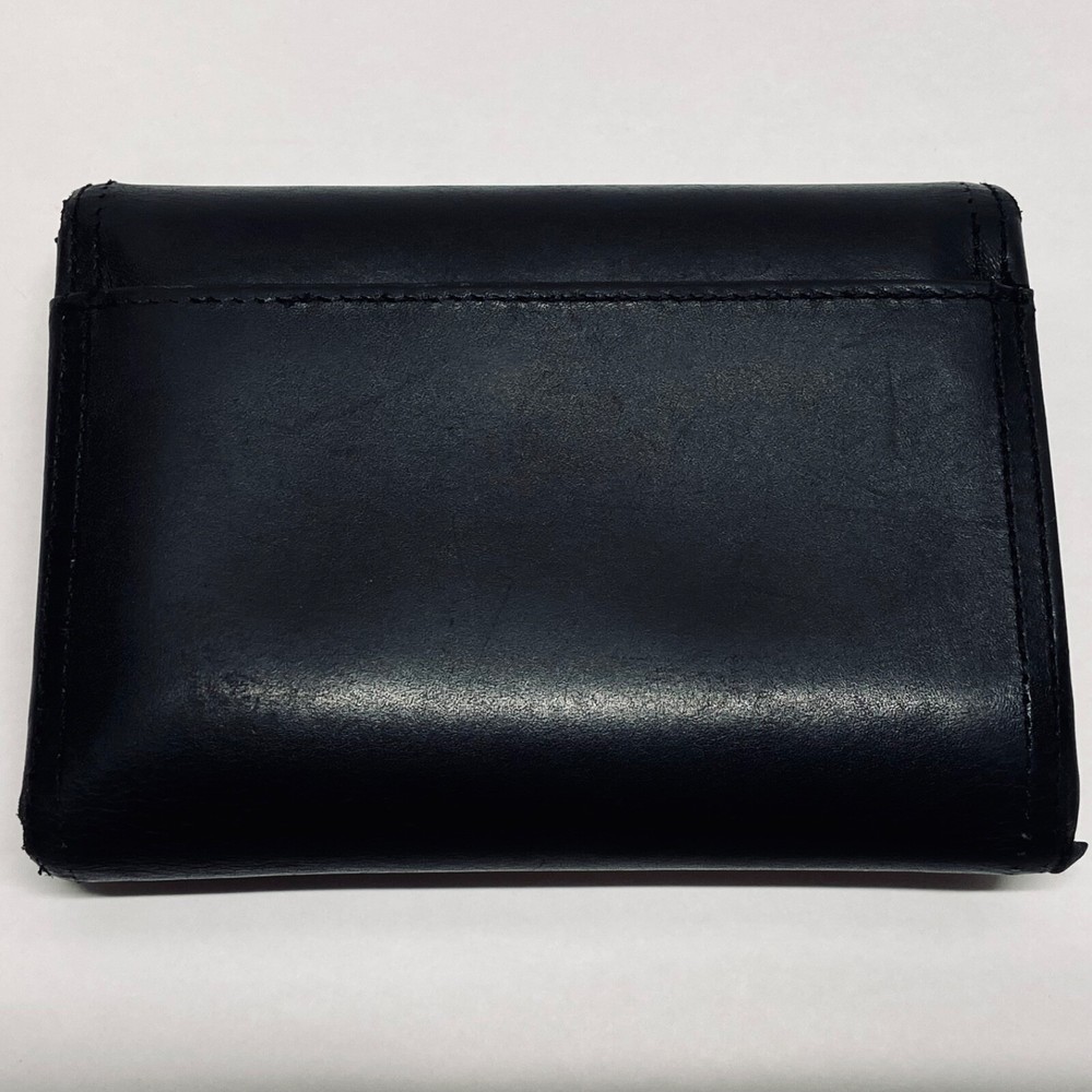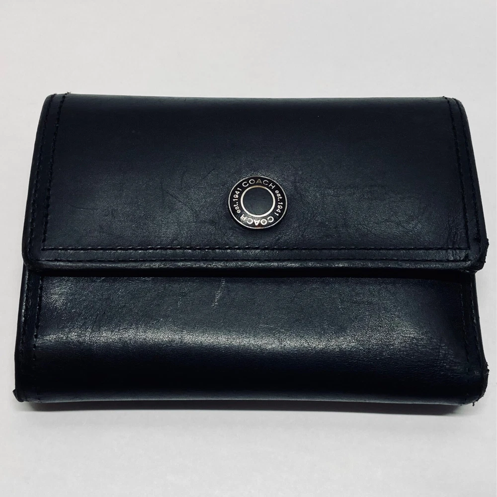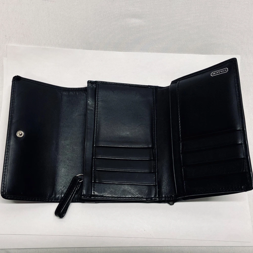 Coach Women's Black Leather Trifold Wallet Snap Front Medium Size Good Condition Item is pre-owned with moderate signs of use. There is signs of wear on the edges. Please see all photos as this is the exact item you will receive. Features 8 card slots and a zippered coin area. Dimensions of wallet are 5.5" w and 3.5" h. Thanks for looking!
