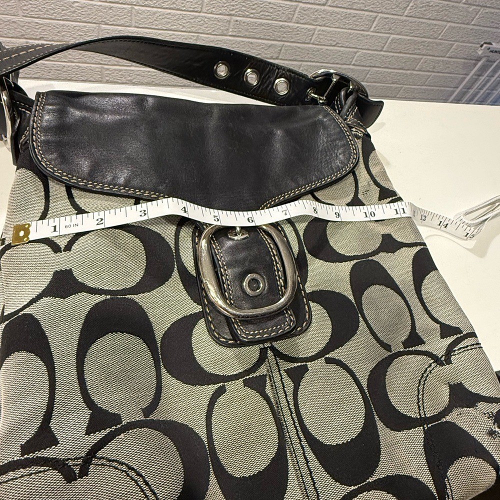 This elegant Coach shoulder bag features the iconic 'C' monogram pattern in a sophisticated black and gray color scheme. Crafted with a black leather trim and an adjustable shoulder strap, it offers both style and comfort. The medium-sized design with a flap closure makes it a versatile accessory for any occasion.