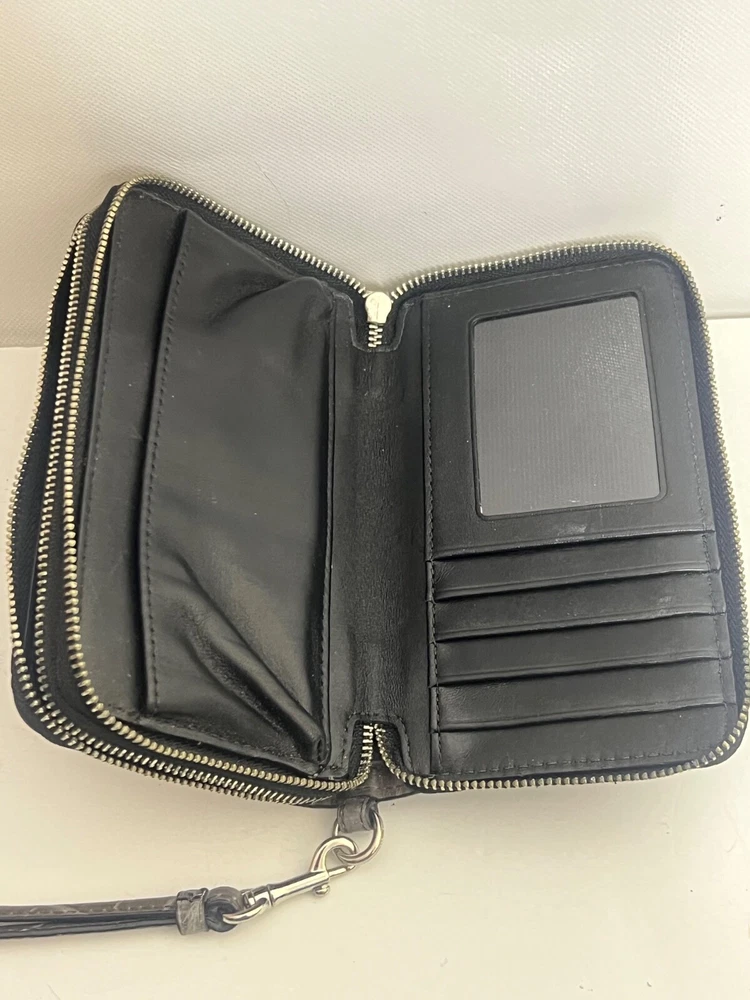 Coach Textured Leather Accordion Zip Wallet With Wristlet Strap Brown With Black Interior Silver Hardware 6 inches in length 3 3/4 inches width Good condition Proceeds from the sale of this item benefits Floyd Felines Animal Rescue in Rome GA a 501c3 non profit organization.