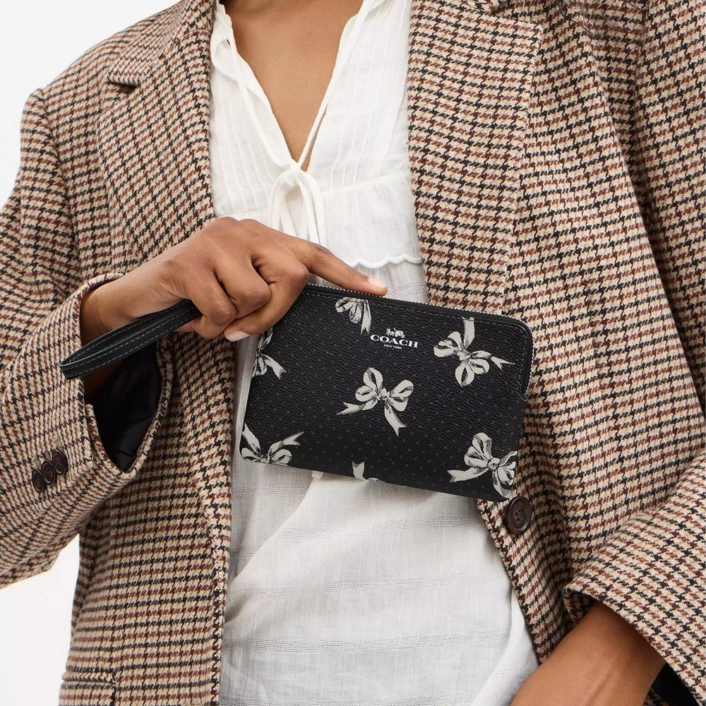 This wristlet is a stylish and practical accessory! The compact size fits essentials perfectly, and the bow print adds a cute touch. Love the sturdy coated canvas and smooth zip closure—plus, the two card slots are super handy. The wrist strap makes it easy to carry, and the fabric lining feels premium. A great little piece for quick outings!