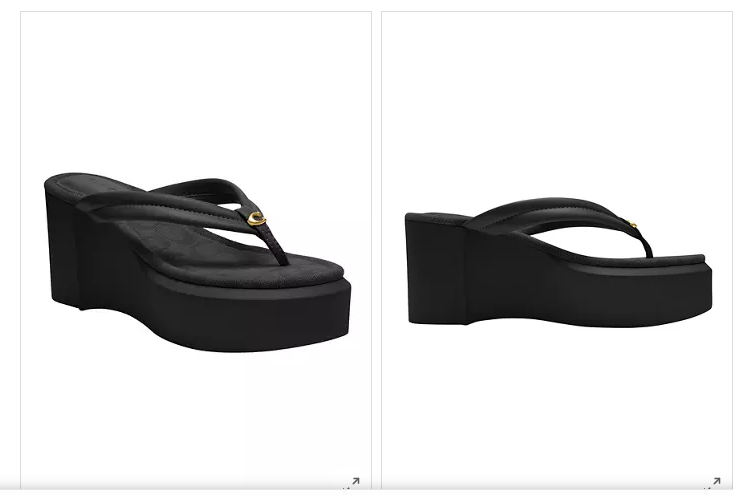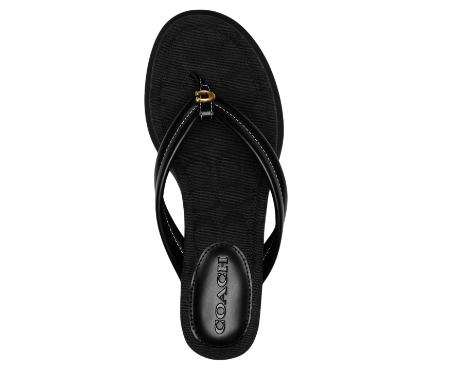 Step into elegance and comfort with the Coach Franki leather platform wedge flip flop sandal. Designed for the fashion-forward woman, this sandal features a sleek black upper, complemented by a versatile solid pattern that effortlessly pairs with any summer ensemble. The slip-on style ensures ease of wear, making these sandals both practical and stylish. The Coach Franki model boasts an approximate 3.5-inch wedge heel with a platform sole for added comfort and style. A comfortable lift that's perfect for sunny days out or casual evenings. Accented with a brass/gold logo C to give that edge. Available in sizes 8 and 9, these flip flops are an essential addition to your footwear collection, marrying the timeless appeal of Coach with the relaxed vibe of a flip-flop silhouette. All items come from a smoke free environment and are 100% authentic ***Check out my other designer flip flops for sale*** Location: box66rack88D225