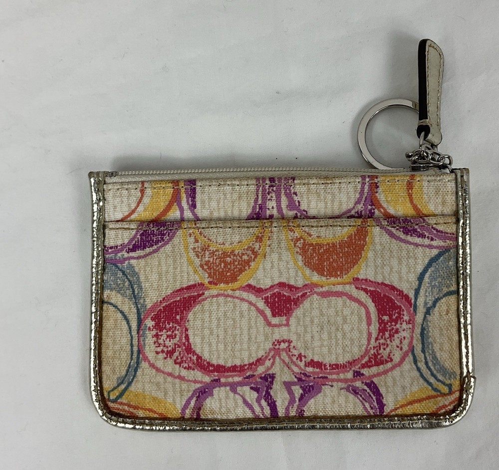 The Coach Credit Card Keychain Wallet is a stylish accessory for women, featuring a multicolor canvas design with the signature logo accent. This mini wallet is made of a combination of polyester, canvas, and leather materials, making it durable and fashionable. It includes multiple features such as credit card slots, a keychain, an outer pocket, a change purse, and a coin purse, all securely held together with a zipper closure. With its designer theme and brand reputation, this wallet is a practical and chic addition to any woman's handbag collection.