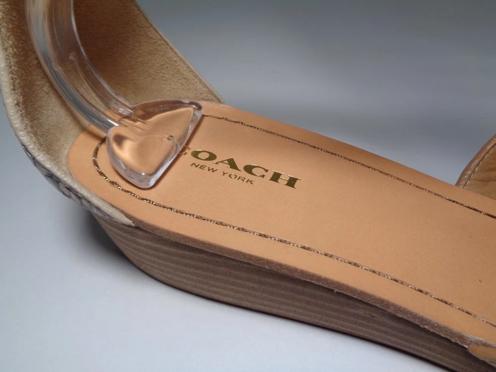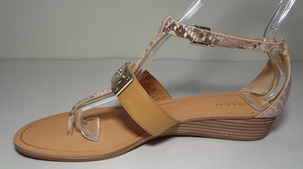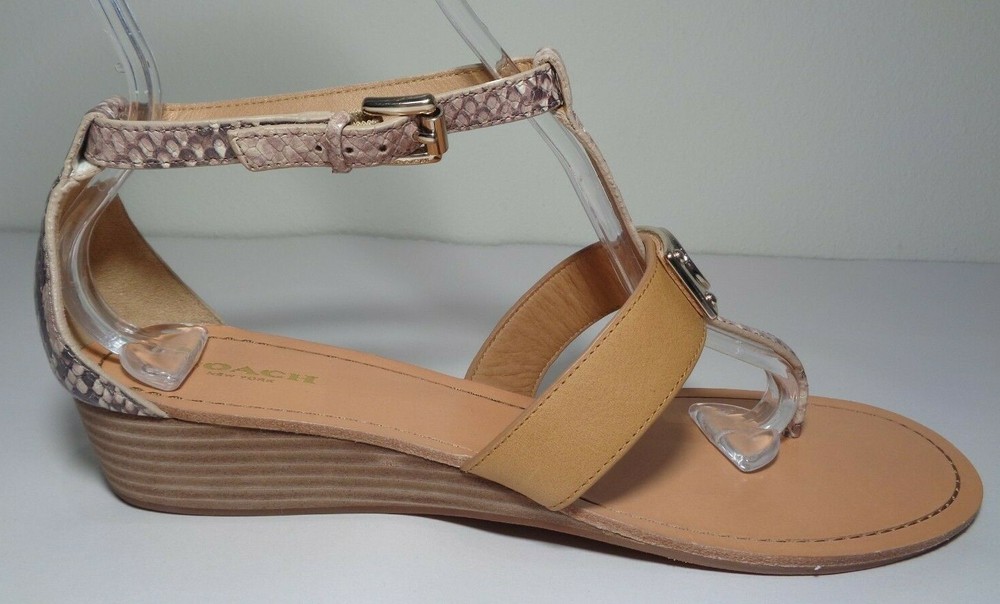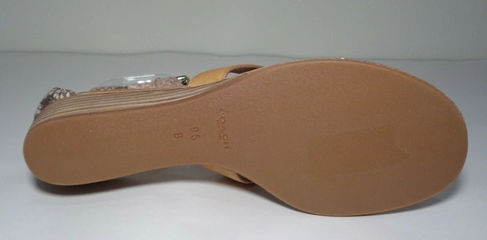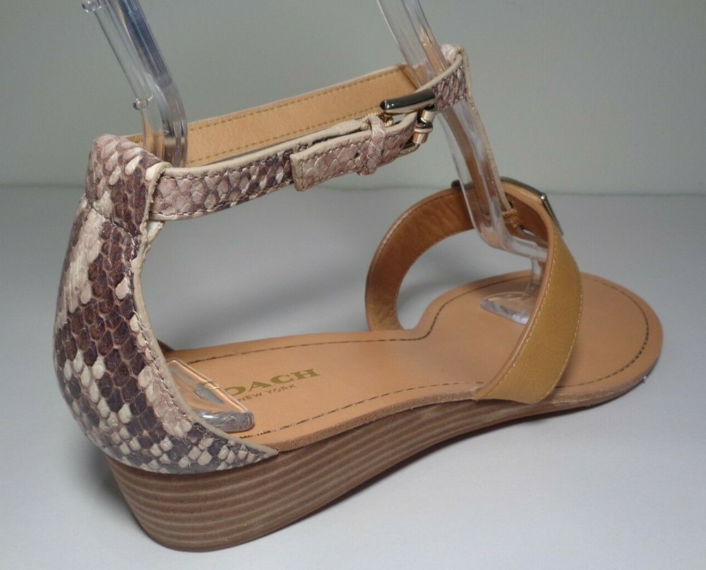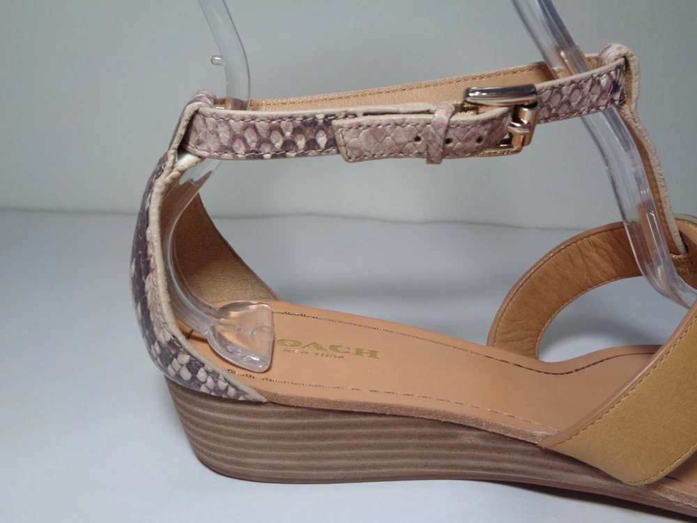 Coach Size 9.5 M INES Snake Print Leather Wedge Heel Sandals New Women's Shoes Style: INES LT PRNT SNK/VEG LTHR, A5727 Color: Natural/Ginger, 34A5727-NGN Leather upper and lining Wood stacked heel Rubber outsole Heel height approximately 1.5 inches Eur 39.5 CN 245.5(1.5)
