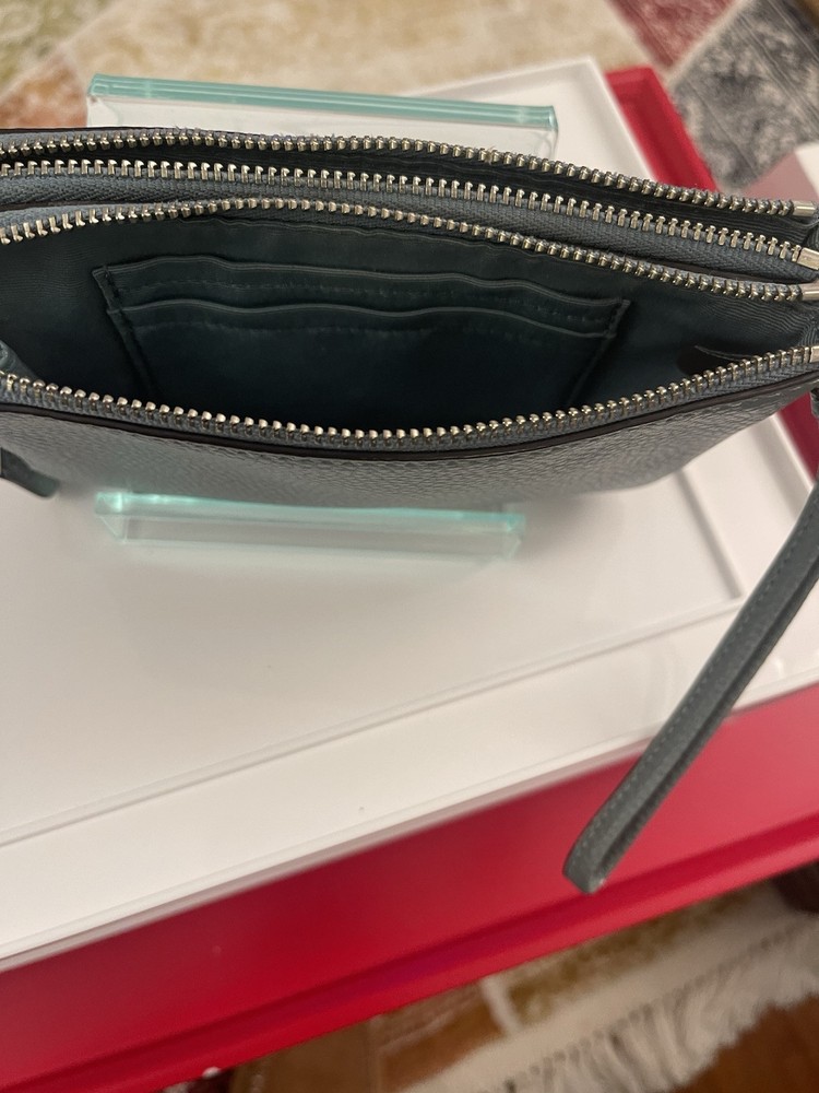 Crafted with the modern woman in mind, this Coach small double zip wristlet marries sophistication with practicality. The elegant green hue complements the sleek leather design, offering a chic accessory to accentuate any ensemble. The wristlet's compact silhouette is ideal for securing essentials without the bulk of a traditional wallet. With its well-thought-out layout and durable construction, it's a timeless addition to any accessories collection, embodying the perfect blend of style and function for the busy, fashion-conscious individual.