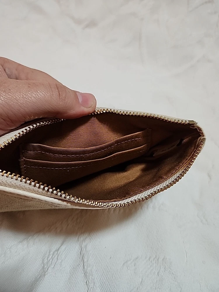 Coach Zip Top Small Wristlet Cream Leather And Tan Jacquard Logo Fabric . Condition is Pre-owned. Shipped with USPS Ground Advantage.