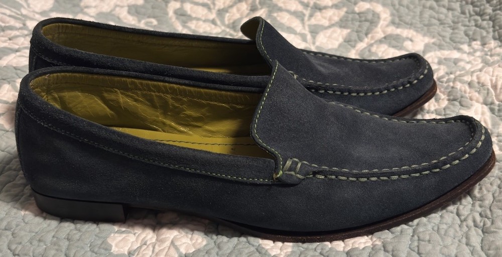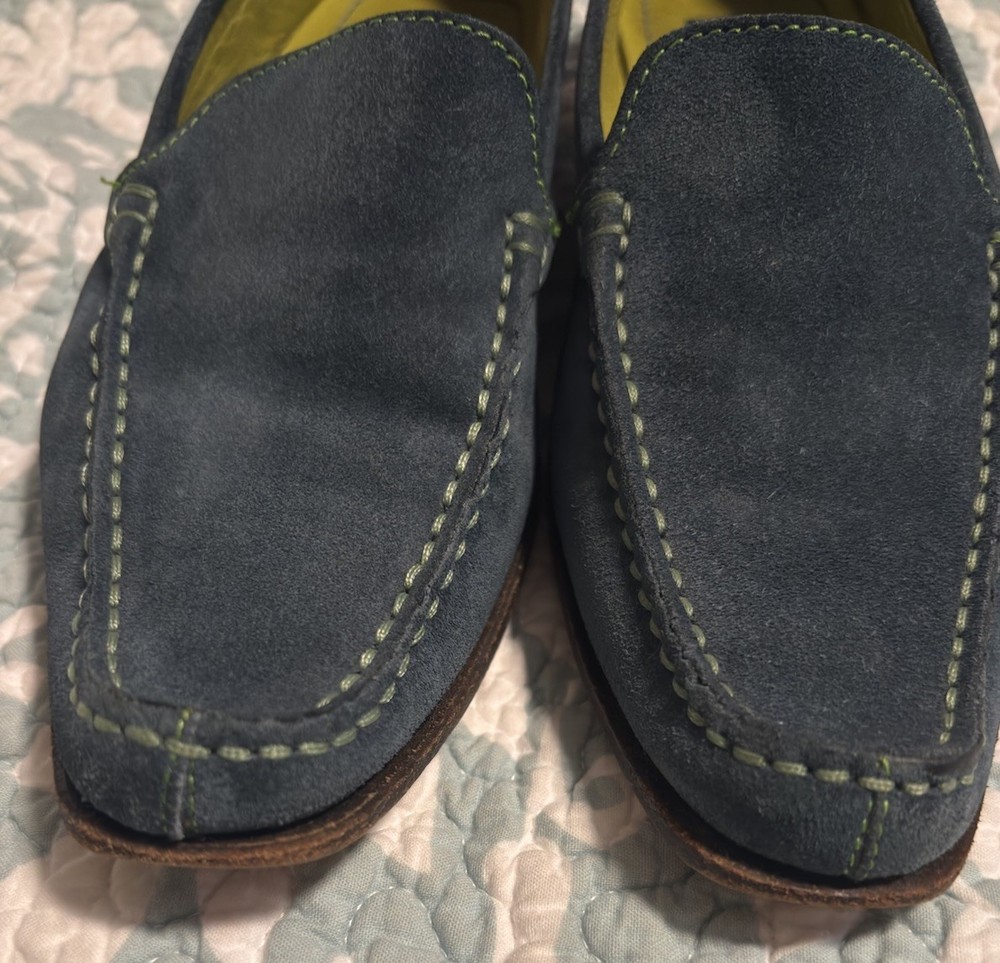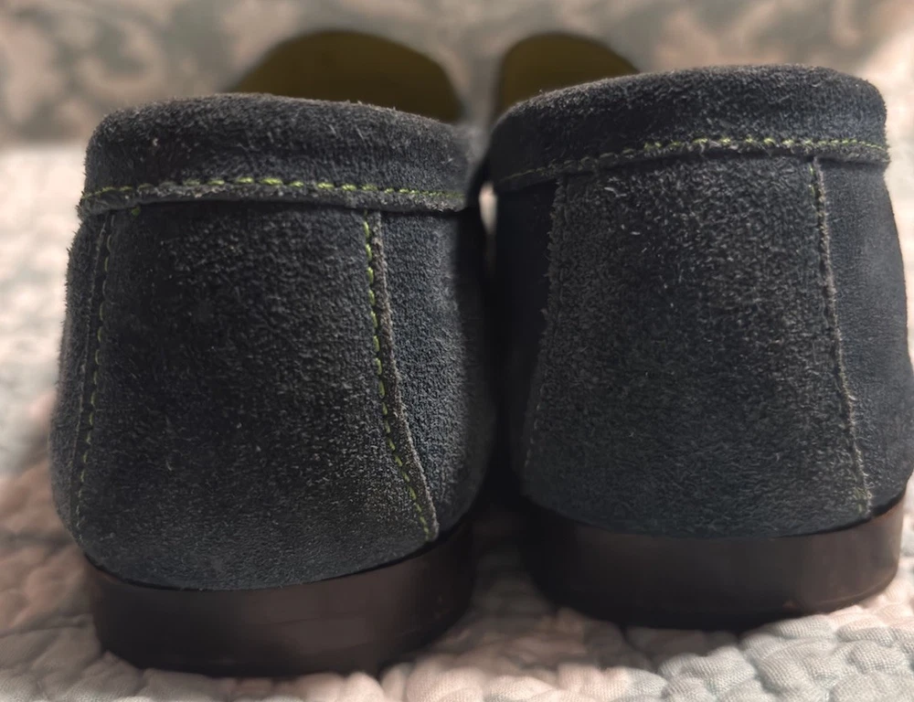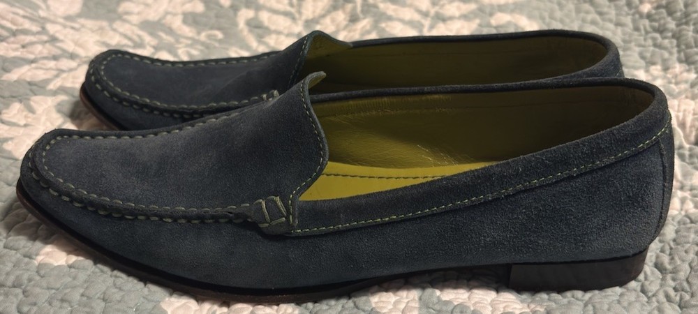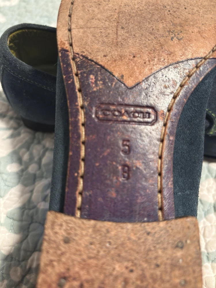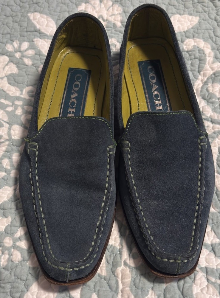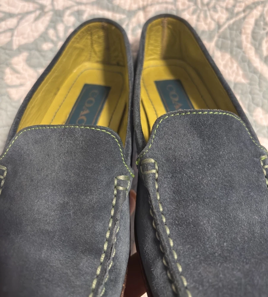 Fabulous Coach Delayne Womens Loafers in teal green suede leather with chartreuse stitching. Made in Italy, size 5 B. Excellent pre-owned condition.