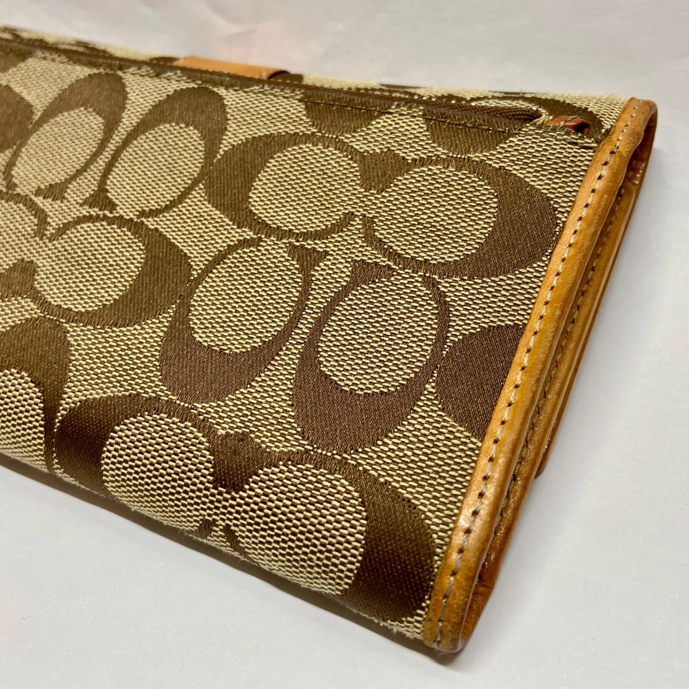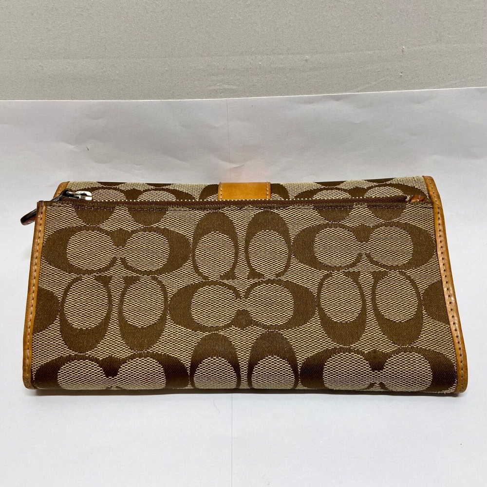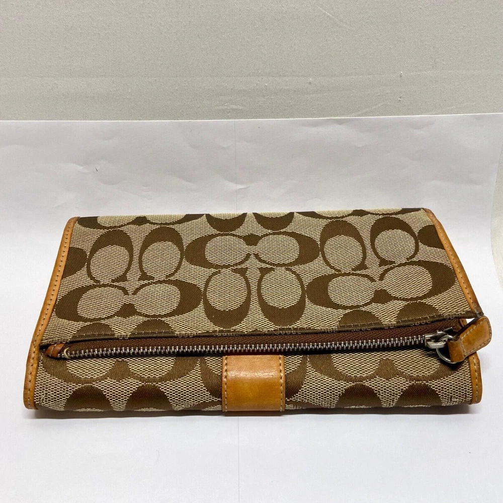 Coach Women's Signature Tri-fold Wallet Brown Khaki Jaquard Leather Trim Vintage This ladies snap front wallet is in good pre-owned condition with minimal signs of use. Please see all photos as this is the exact item you will receive. Please note there are some pen marks on the inside of wallet. Measurements are; 7.75" wide, 4.5" h and approximately 1" deep. Inside features 6 card slots, ID slot, and bill holder. Additional zip pocket on back of the wallet. Thanks for looking!