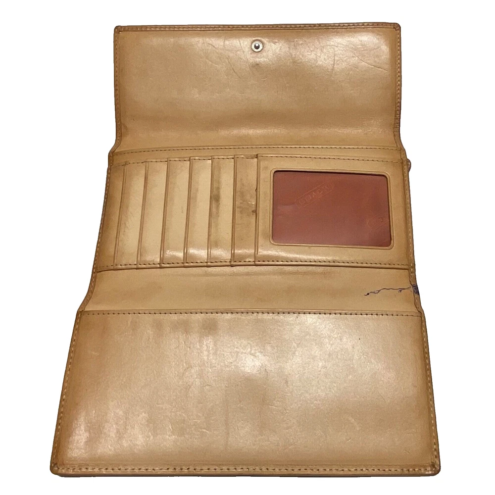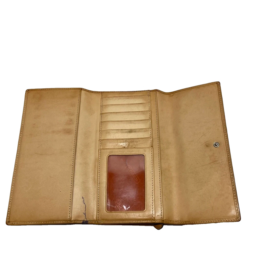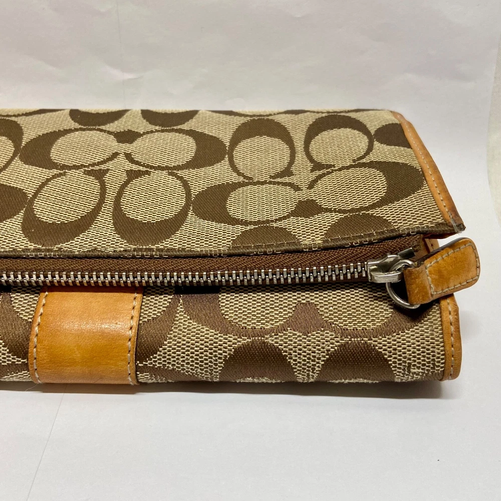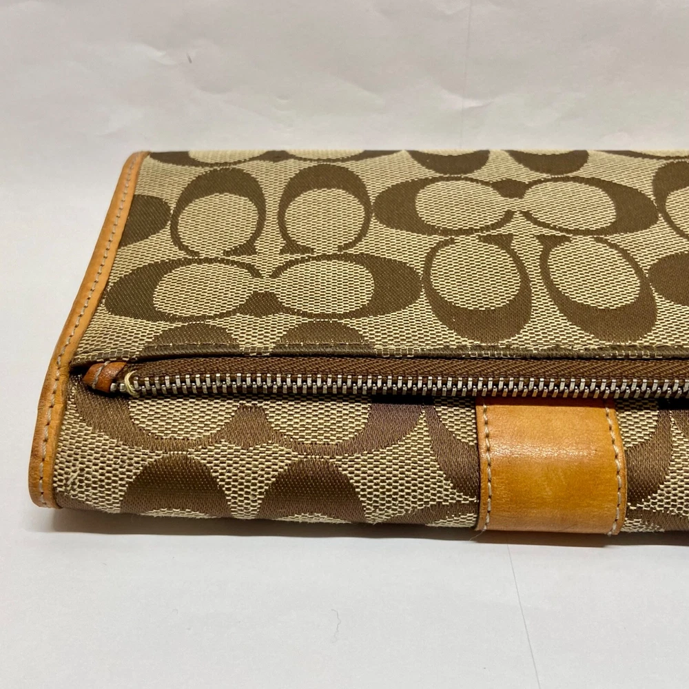 Coach Women's Signature Tri-fold Wallet Brown Khaki Jaquard Leather Trim Vintage This ladies snap front wallet is in good pre-owned condition with minimal signs of use. Please see all photos as this is the exact item you will receive. Please note there are some pen marks on the inside of wallet. Measurements are; 7.75" wide, 4.5" h and approximately 1" deep. Inside features 6 card slots, ID slot, and bill holder. Additional zip pocket on back of the wallet. Thanks for looking!