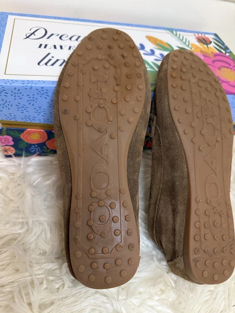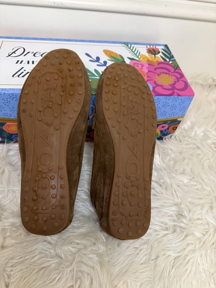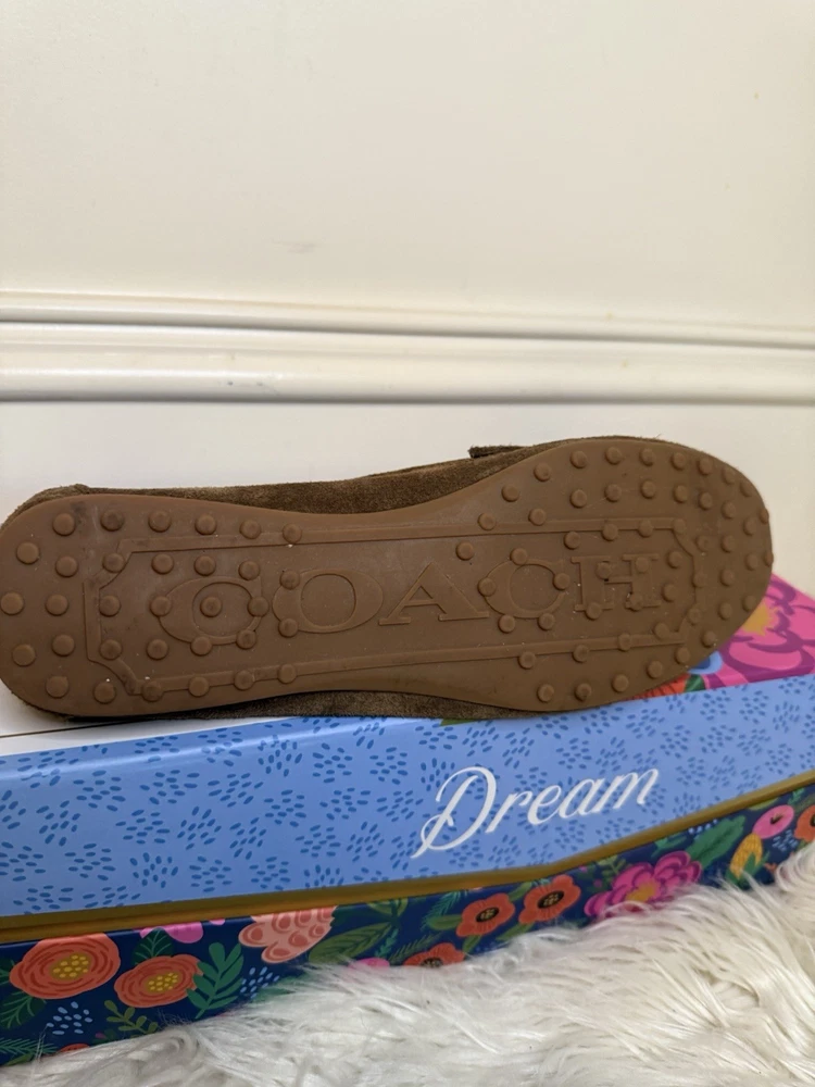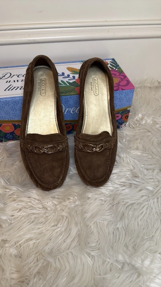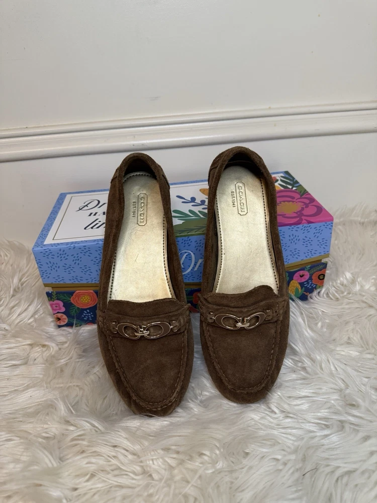 The Coach Women's Suede Fortunata Loafer in brown is a stylish and comfortable slip-on shoe for casual occasions. Featuring a solid pattern, round toe shape, and slip-on closure, these loafers are made of suede with a buckle detail for added flair. With a comfortable flat design and a B width, these shoes are perfect for women looking for a classic and versatile addition to their wardrobe. The Coach brand and timeless style make these loafers a must-have for any fashion-forward woman. Preloved and good condition, please look at all the pictures! Thank you!