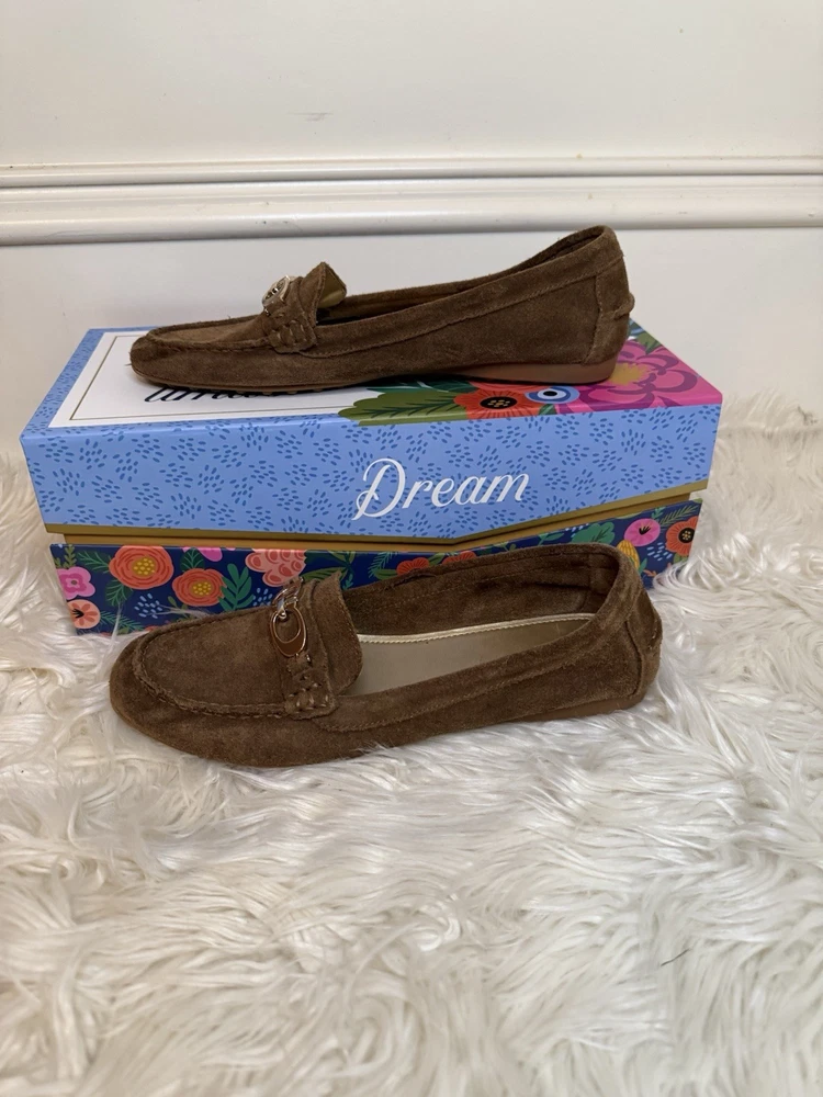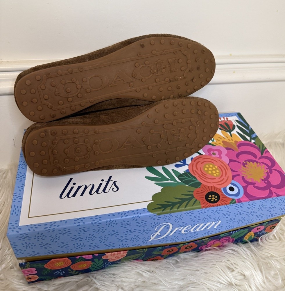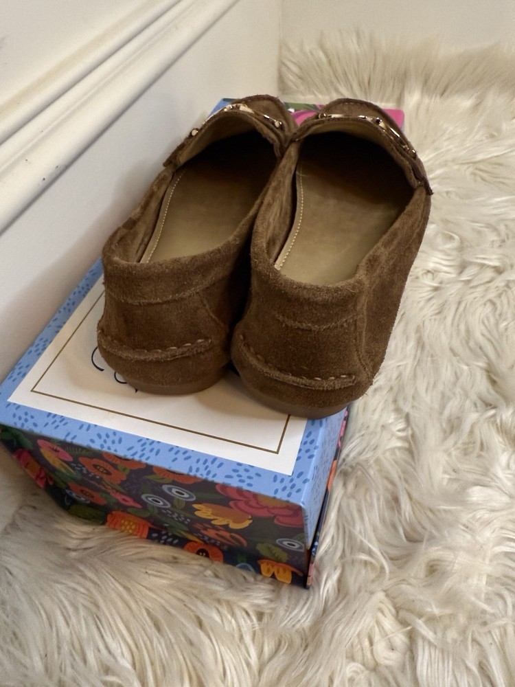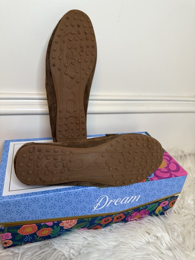 The Coach Women's Suede Fortunata Loafer in brown is a stylish and comfortable slip-on shoe for casual occasions. Featuring a solid pattern, round toe shape, and slip-on closure, these loafers are made of suede with a buckle detail for added flair. With a comfortable flat design and a B width, these shoes are perfect for women looking for a classic and versatile addition to their wardrobe. The Coach brand and timeless style make these loafers a must-have for any fashion-forward woman. Preloved and good condition, please look at all the pictures! Thank you!