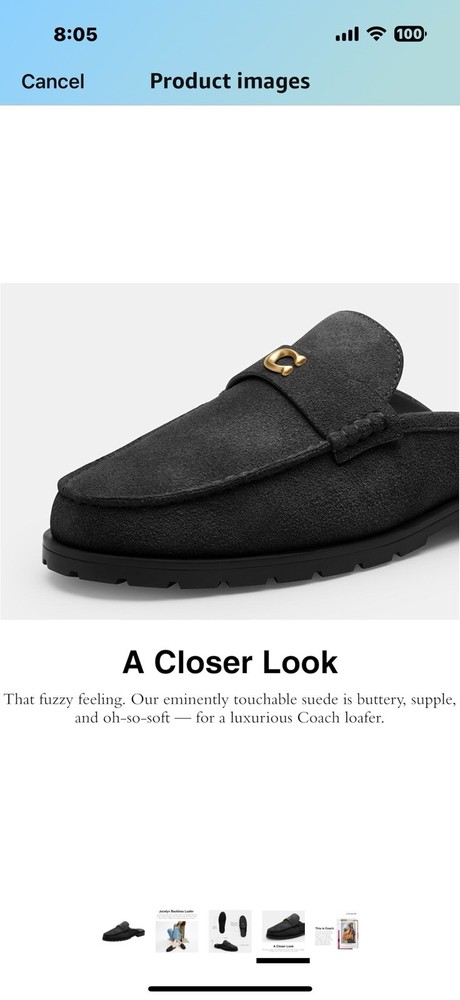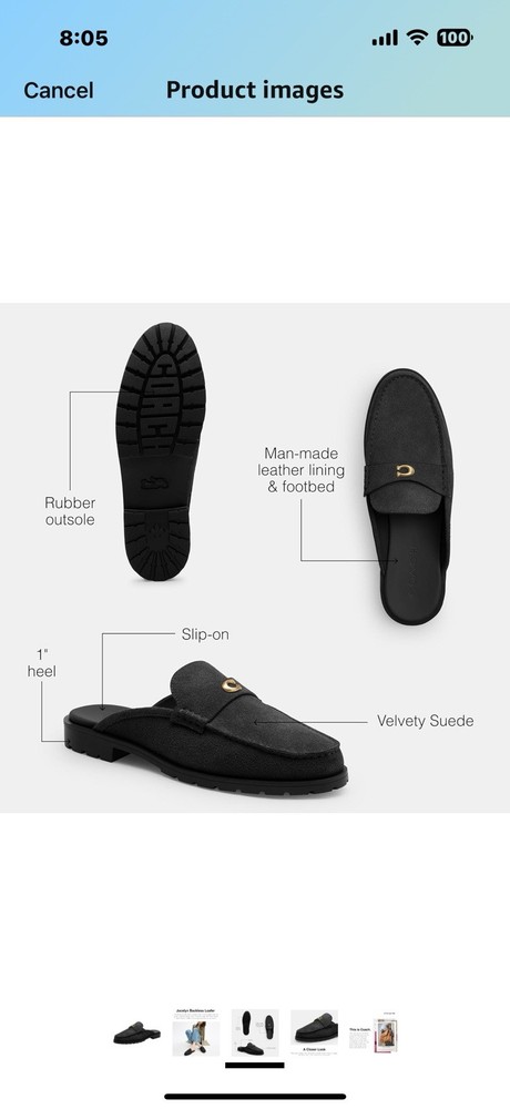 Coach Women's Jocelyn Backless Loafer, Charcoal/Black, 5 Origin Imported Sole material Rubber Outer material Denim Closure type Pull-On Country of Origin Vietnam About this item Editor's Notes: Our Jocelyn Loafer takes a timeless style to new heights with soft suede, a backless design and a 1" heel for subtle lift Velvety Suede: That fuzzy feeling. Our eminently touchable suede is buttery, supple, and oh-so-soft - for a luxurious Coach loafer Rubber Outsole: These luxury loafers feature a rubber sole for great traction on city streets It's All in the Details: Suede upper, man-made leather lining and footbed, rubber outsole, slip on, 1" heel This is COACH: Having the courage to be real since 1941. COACH is the Original American House of Leather - with a legacy of craft and a community that champions the courage to live authentically Description Our Jocelyn Loafer takes a timeless style to new heights with soft suede, a backless design and a 1" heel for subtle lift. Suede upper, man-made leather lining and footbed, rubber outsole, slip on, 1" heel