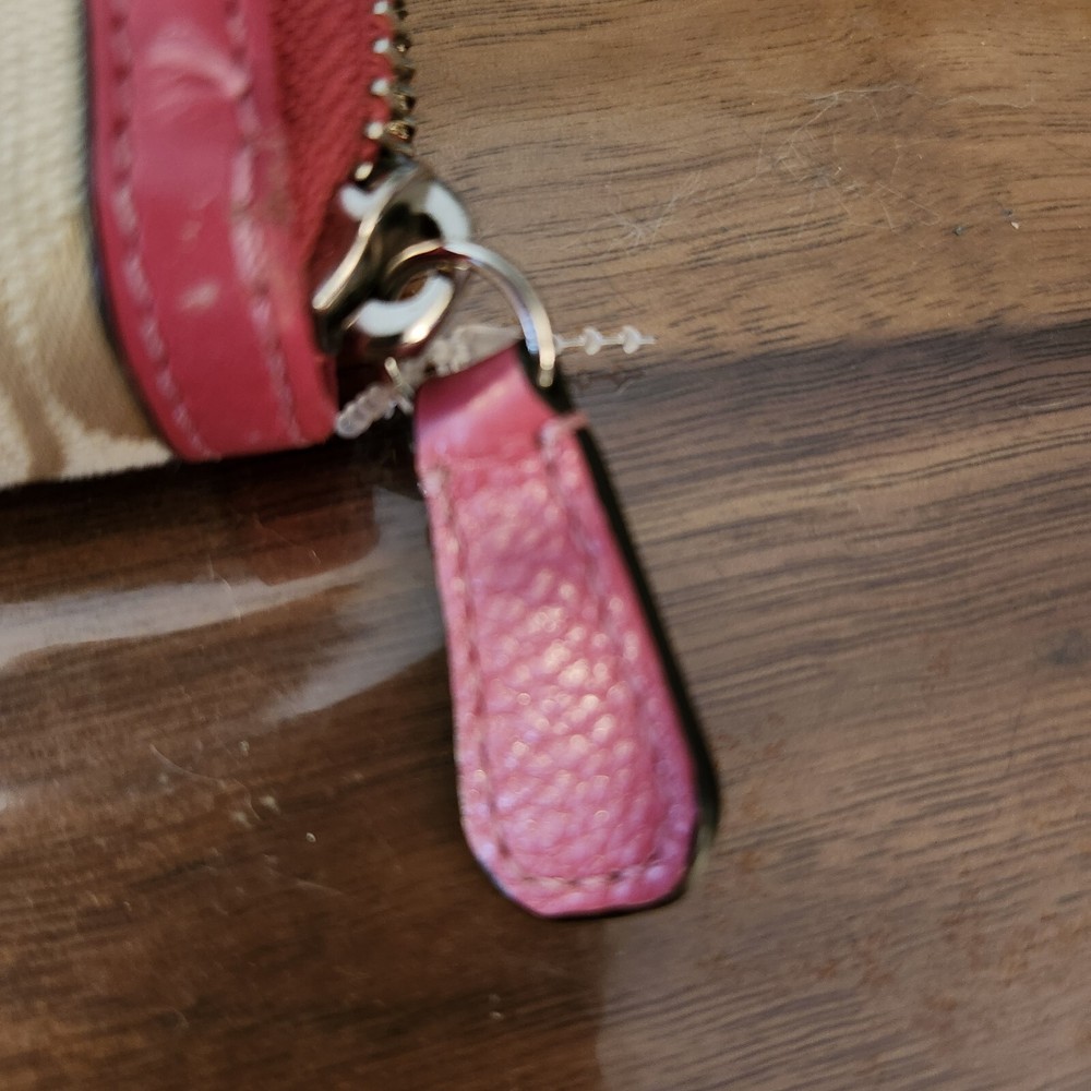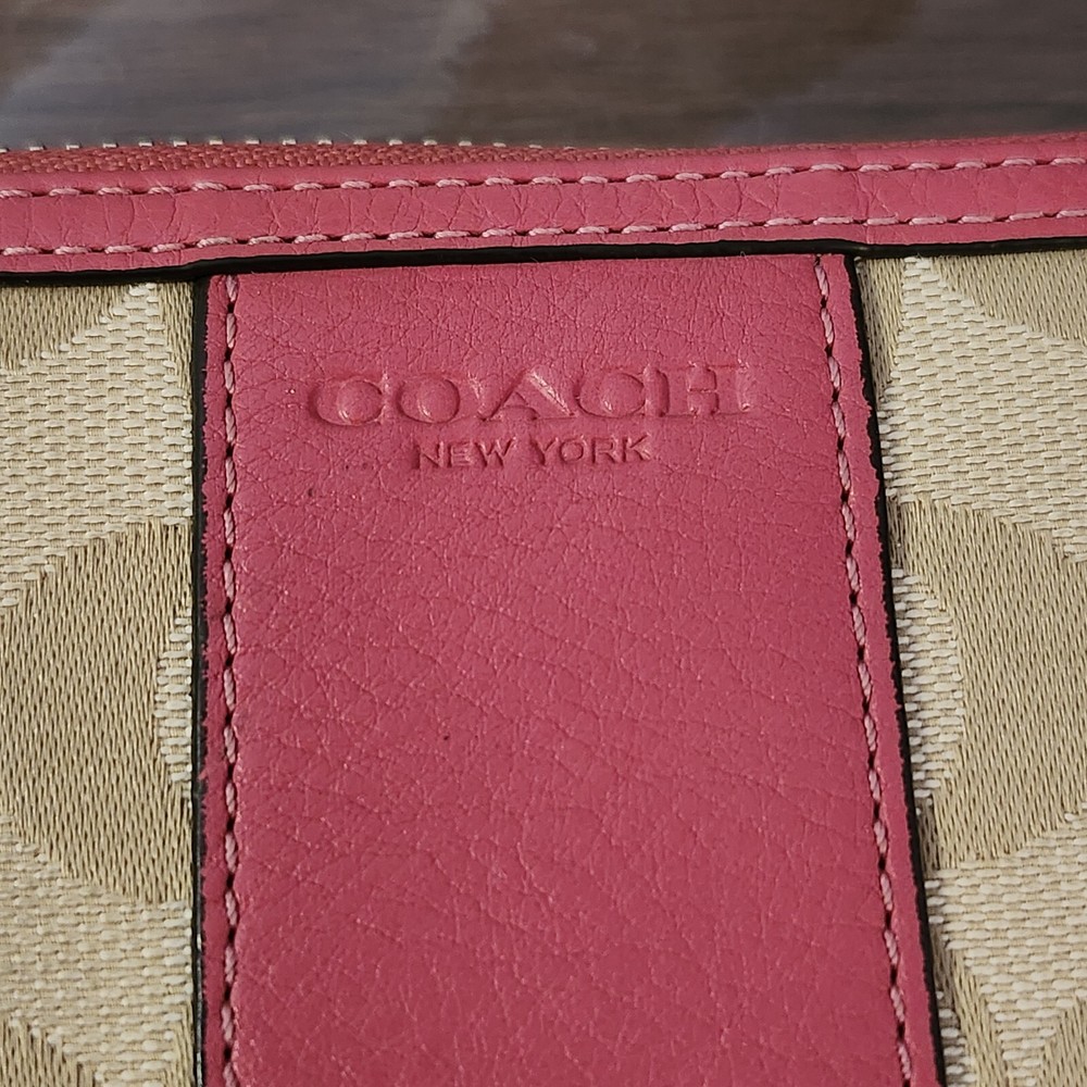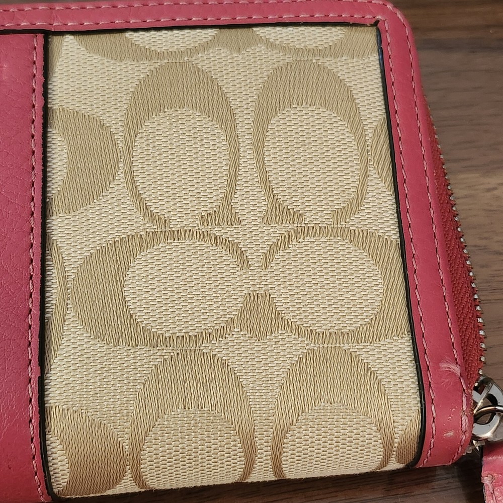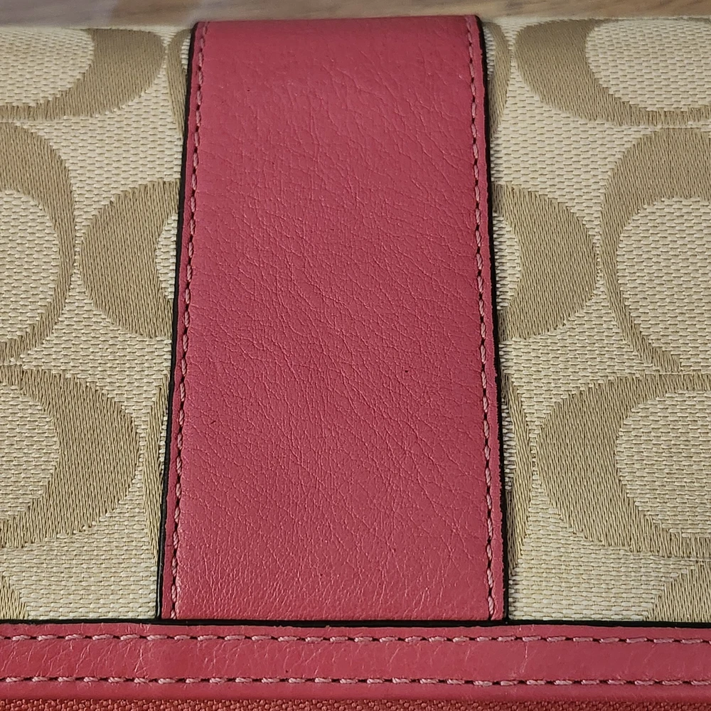 Coach Long Wallet Zip Around Wide Pink Leather Stripe Breast Cancer Pink This beautiful Wallet has the signature jacquard fabric with the center wide pink leather stripe. Multiple credit card slots on both ends of this wallet. One center zipper pocket, fully functional. Also has 5 slip in pocket slots for cash and miscellaneous items. Certificate of Authenticity through Authentic Detective will be included.