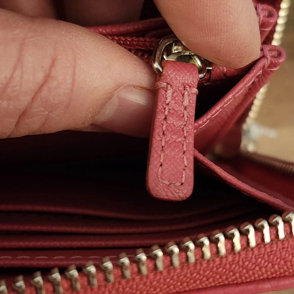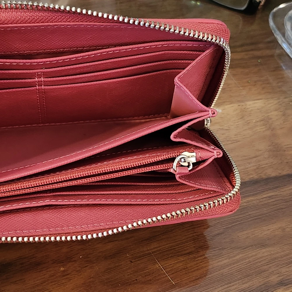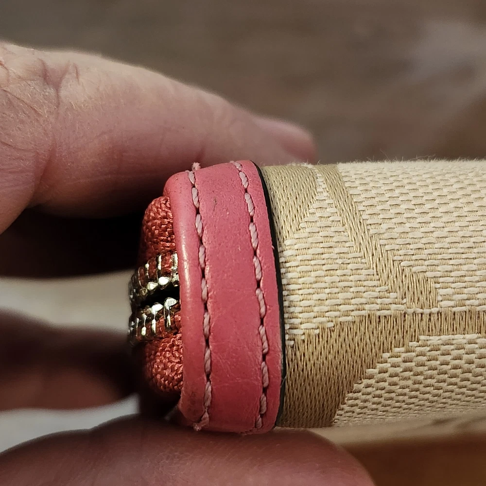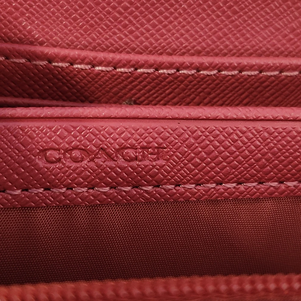 Coach Long Wallet Zip Around Wide Pink Leather Stripe Breast Cancer Pink This beautiful Wallet has the signature jacquard fabric with the center wide pink leather stripe. Multiple credit card slots on both ends of this wallet. One center zipper pocket, fully functional. Also has 5 slip in pocket slots for cash and miscellaneous items. Certificate of Authenticity through Authentic Detective will be included.