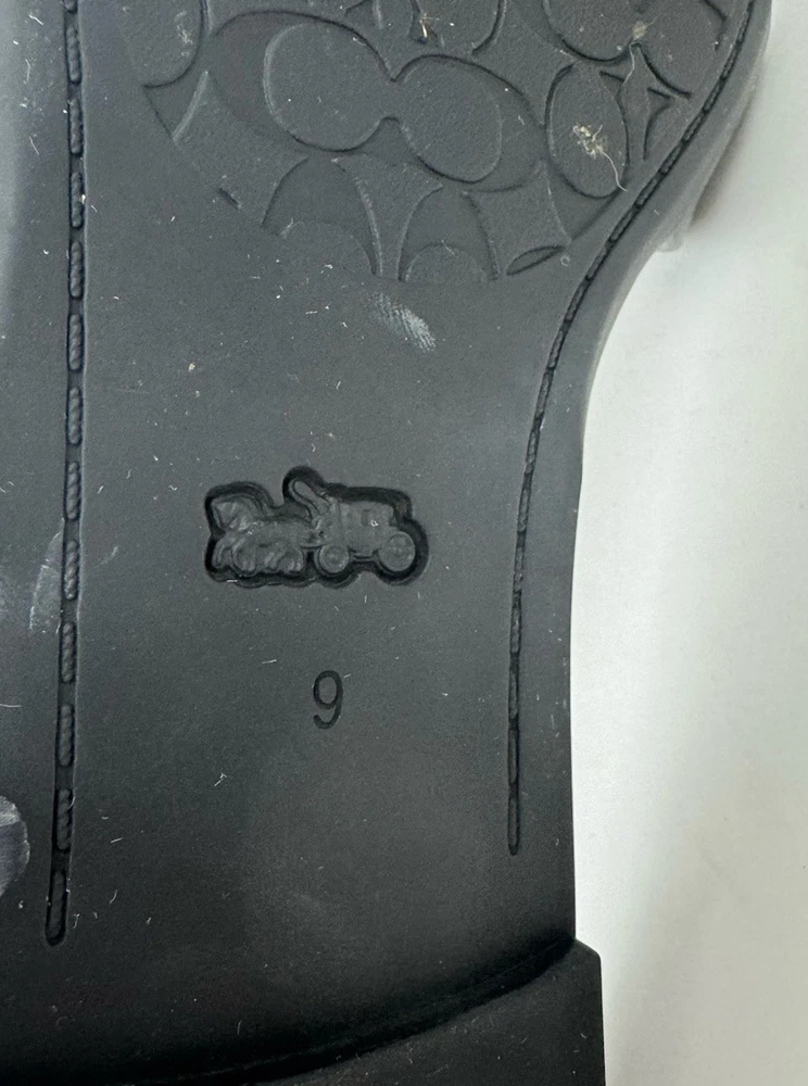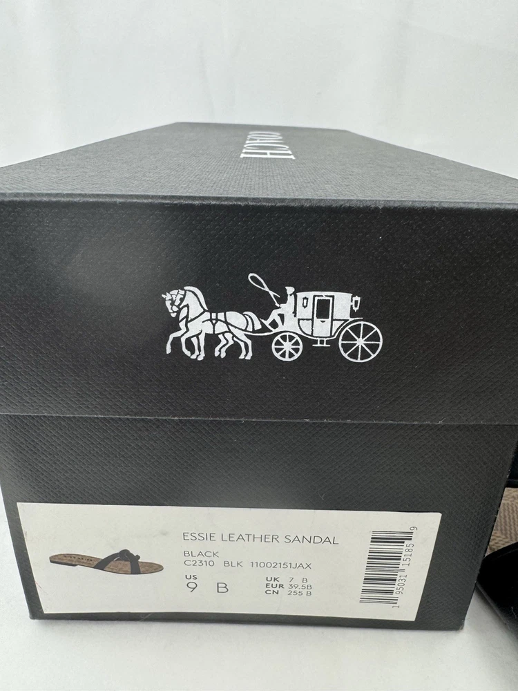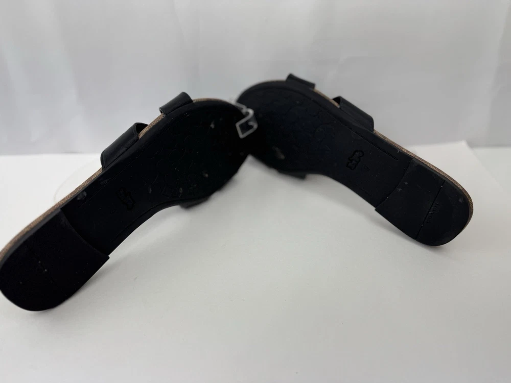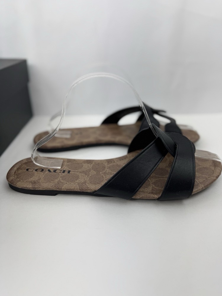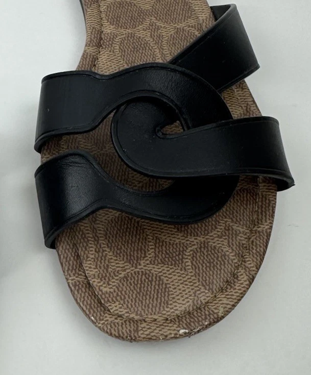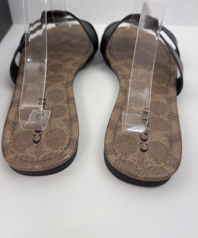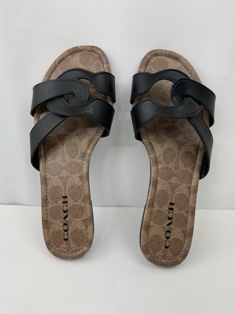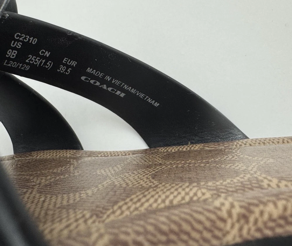 Size 9B wide fit, so if you're prioritizing comfort instead of a tighter fit, consider these shoes... Please see photos for the condition of the shoes. A minor scratch in front of the shoes is shown in the photo. A summer wardrobe staple, these Coach sandals are perfect for beach getaways and city streets alike. This style features a strap made from interlocking leather bands, fashioned into the iconic C initial. They're finished with a signature canvas footbed and a rubber outsole for grip. Details & Care Upper Composition: Leather Lining Composition: Canvas Sole Composition: Rubber