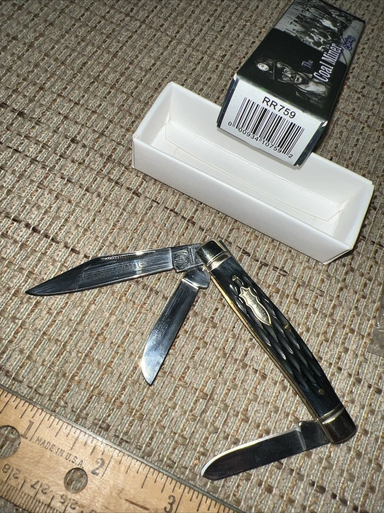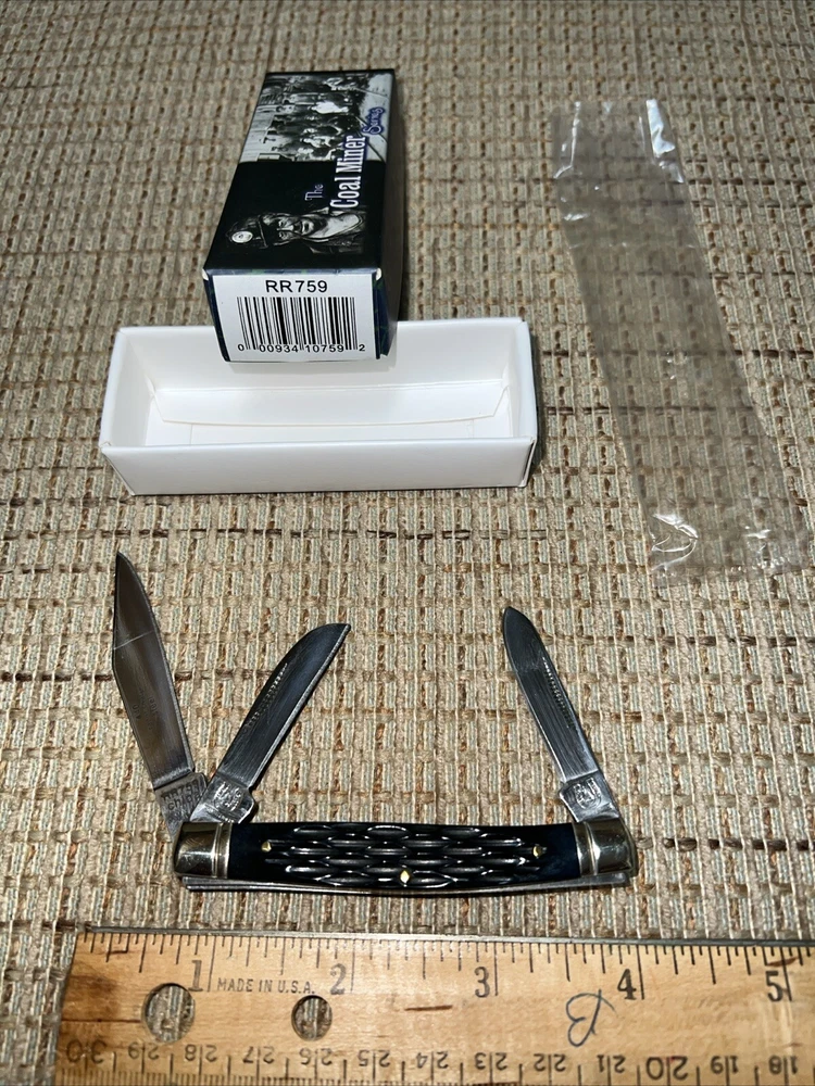 This Rough Rider pocketknife is a must-have for any collector or outdoor enthusiast. The black bone handle and stainless steel blade make for a durable and stylish addition to your collection. The knife features a slipjoint lock type and manual opening mechanism, with a plain edge blade and three total blades. The Coal Miner RR759 model is an original and authentic product from Rough Rider, a trusted brand in the industry. This knife is perfect for everyday use, camping, or any outdoor activity. Don't miss out on the opportunity to add this high-quality pocketknife to your collection. I inherited this knife from a collector. It is brand new.