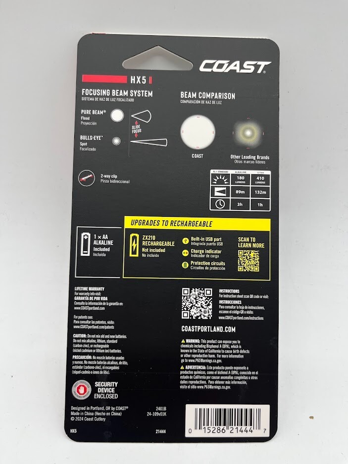 The HX5 Flashlight is a versatile and reliable lighting solution for all your needs, offering compatibility with multiple battery types. Whether you prefer standard alkaline AA batteries, rechargeable NiMH, or powerful lithium 14500 batteries, this flashlight adapts to your preferences. With lithium 14500 cells, it delivers up to three times the brightness of an alkaline battery. Its Pure Beam Focusing System with Slide Focus allows for seamless transition between wide flood and focused spot beams. The innovative 2-way clip adds flexibility, letting you attach it to your pocket or the brim of your hat for hands-free use. Highlights Pure Beam Focusing Optic: Provides a seamless beam transition from flood to spot. Slide Focus Technology: Easily adjust focus with one hand. Multi-Battery Compatibility: Works with alkaline AA, rechargeable NiMH, or lithium 14500 batteries (NiMH and lithium not included). 2-Way Clip: Attach to a pocket or hat brim for hands-free convenience. Performance: Delivers 130 lumens of brightness and a beam distance of 79 meters (259 ft.). Long Runtime: Provides up to 3 hours and 45 minutes of use on a single battery. Durability: Impact and weather resistant for dependable use in various conditions. Compact and powerful, the HX5 Flashlight is perfect for everyday carry, outdoor adventures, or professional use. We take great care to inspect all items and ensure they are accurately described. Should you have any issues with your purchase, please let us know immediately. We are committed to resolving any concerns promptly and to your satisfaction. Our small business truly appreciates your patronage.