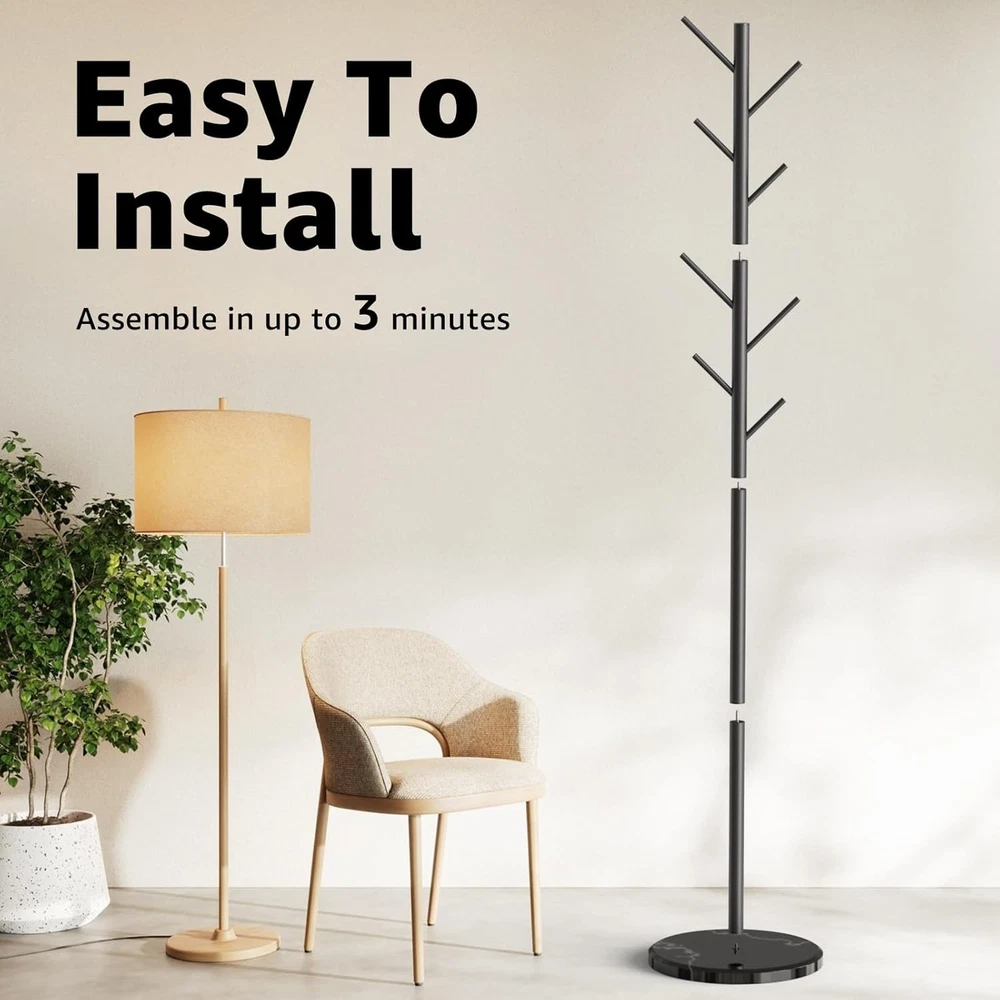 Coat Rack with Natural Marble Base, Metal Freestanding 8 Black Product Details Brand: HzTinT Color: Black Material: Metal Recommended Uses For Product: Coats Product Dimensions: 11.2"D x 11.2"W x 70"H Installation Type: Free Standing Special Feature: With Adjustable Shelves Style: 8hooks Finish Type: Polished Load Capacity: 200 Pounds Number of Shelves: 8 Furniture Finish: Metal Frame Material: Metal Assembly Required: Yes Maximum Weight Recommendation: 200 Pounds Assembly Instructions Description: Easy to assemble with included parts, no additional tools required. Manufacturer: HzTinT Item Weight: 12.07 pounds Item model number: Black Coat Rack Finish: Polished Item Package Quantity: 1 Special Features: With Adjustable Shelves Included Components: Metal Coat Rack Batteries Included?: No Batteries Required?: No Brand: HzTinT Color: Black Material: Metal Recommended Uses For Product: Coats Product Dimensions: 11.2"D x 11.2"W x 70"H 【Heavy-Duty Marble Base】Our coat rack natural marble base has a diameter of 11.2 inches and a thickness of 1 inch. The marble base alone weighs 10 lbs, enhancing the stability of the standing coat rack, preventing it from shaking or tipping like other wooden coat racks. 【Sturdy Metal Material】Our coat stand is made of a sturdy metal frame, ensuring stability for heavy coats and bags without tipping. This design provides superior stability and exceptional load-bearing capacity for your home as a coat tree, hat rack, or for a variety of clothing items. 【Sufficient Storage Space】The 8 storage metal hooks provide plenty of space to hang items including clothes, bags, hats, umbrellas, ties, purse and scarves. Measuring 11.2”W by 70”H, the metal coat rack takes up little space in the entryway, living room, bedroom, office, and more. 【Three Height Options】This coat rack freestanding features a 4-section design, and you can customize the rack height. Three height installation options are available at 39, 54, and 70 inches tall, meeting the needs of different groups of children, youth, adults, and other groups. 【Easy Installation】Our coat rack stand is designed with a threaded connection for long-term use, which can be easily assembled within 3 minutes, even by a young kid. Includes all necessary parts and no additional tools required.