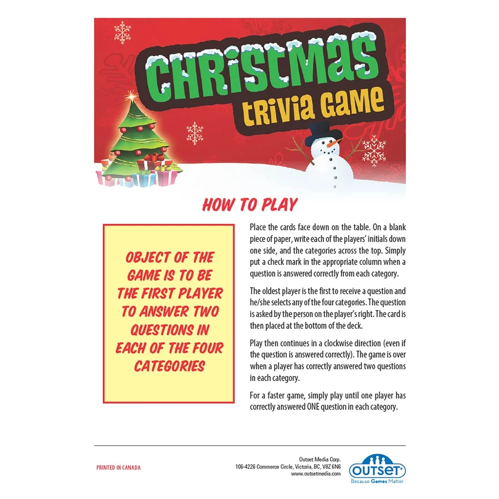 Christmas Trivia card game is the perfect way to take family fun on the road on the way to grandmother's house. This travel-size card game is full of trivia questions from Ebeneezer Scrooge to Frosty the Snowman. Ho-ho-hope you know all the answers as you recall those fun holiday traditions and familiar Christmas carols to score points in this game. There are four fun categories whcih include Christmas Carols, Holiday Traditions, Christmas Entertainment, and the North Pole. Make Christmas cheer louder than ever this year with fascinating facts about everyone's favorite holiday. Play individually or in teams for ages 12 years and up. CHRISTMAS TRIVIA GAME: This game is for those looking to test everyone’s knowledge of all things Christmas! GAME CONTENTS: For 2 or more players ages 12 years and up, game includes 70 trivia cards and 1 rule card. INCLUDE EVERYONE: Besides having the benefits of improving and expanding your knowledge, trivia games are also a fun way to get everyone involved at any family game night or party. FAMILY FUN: The rules are easy to learn and the game is difficult to stop playing, it’s that much fun! It’s the perfect game for families that allows the , teens, and parents to all get involved during the holidays. GREAT FOR TRAVEL: This compact, portable game can easily fit in a purse or backpack, making it perfect as an on the go activity for holiday road trips in the car and long waits at the restaurant.