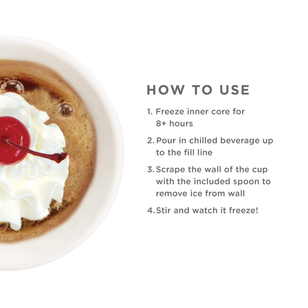 Make slushies, milkshakes, frozen alcoholic drinks, and fruit smoothies in as little as 7 minutes on your countertop! The Coca-Cola Float & Slushy Maker revolutionizes the way floats and slushies are made at home. Watch almost any type of beverage magically freeze before your eyes in minutes. To use, remove the frozen inner core from the freezer and place it into the outer sleeve, pour in your ingredients, mix and scrape the cup with the included spoon, and watch as the slush freezes before your eyes! Can make 8-ounce slushes before needing to refreeze the core. Ingredient ideas include: blended fruit, homemade juice from juicers, malted milk, chocolate milk, sweetened coffee, soda (root beer or cola with vanilla ice cream-yum!), eggnog, energy drinks, soy milk-the possibilities are endless! The slushy maker is designed to easily in your freezer so it is always ready to use. Includes an inner freezer core with an 8-ounce capacity, outer sleeve to keep hands from getting cold, specially designed spoon, and an instruction manual with recipes. OFFICALLY LICENSED COCA-COLA PRODUCT - 's partnership with Coca-Cola brings customers the best-selling Slush & Shake Maker! FROZEN TREATS IN AS LITTLE AS 7 MINUTES: Create Coca-Cola floats and slushies or milkshakes, frozen alcoholic drinks and healthy fruit smoothies in as little 7 minutes right on your countertop COMPACT AND CONVENIENT: Make, serve, and drink your slush all from the 8-ounce container; the Coca-Cola Float & Slushy Maker takes up as much space as a regular cup, no bulky equipment or electrical outlet needed EASY TO USE: Freeze the inner core for 8+ hours, remove from freezer and place it in to the outer cup, pour in your ingredients, mix and scrape the cup with the included spoon, watch as the slush freezes before your eyes; hand wash with warm water ENDLESS RECIPE IDEAS: Blended fruit, homemade juice, malted milk, chocolate milk, sweetened coffee, soda, eggnog, energy drinks and soy milk; experiment with whatever ingredients you have on hand to create new combinations; will not freeze sugar-free or diet beverages WHAT'S INCLUDED: (1) 8-ounce inner freezer core, 1 () protective outer cup embossed with Coca-Cola logo, 1 () specially designed slush spoon; BPA, phthalate, and lead free; designed in the USA