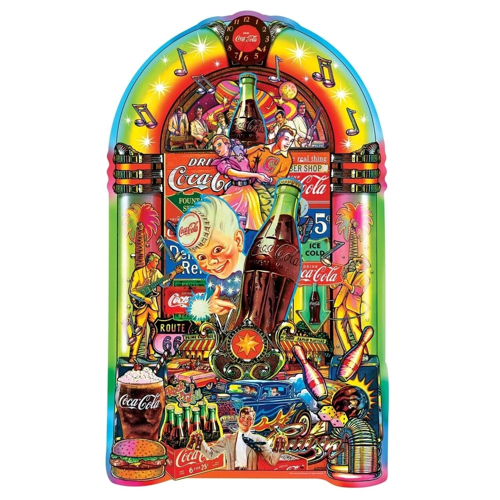 This 1000pc Coke shaped puzzle. Join in the dancing at the corner diner with this nostalgic Coke Jukebox playing all your favorites from the good old days. Includes three special shaped pieces hand-drawn into the dieline. To reduce their impact on our environment, the chipboard used in these puzzles is made of 100% recycled material. Coca-Cola Jukebox 1000 Piece Shaped Jigsaw Puzzle Recycled Material Retro Design This 1000pc Coke shaped puzzle. Join in the dancing at the corner diner with this nostalgic Coke Jukebox playing all your favorites from the good old days. Includes three special shaped pieces hand-drawn into the dieline. To reduce their impact on our environment, the chipboard used in these puzzles is made of 100% recycled material. Product Attributes: Weight (lbs.) : 1.00 lb UPC: 705988722868 Brand: MasterPieces