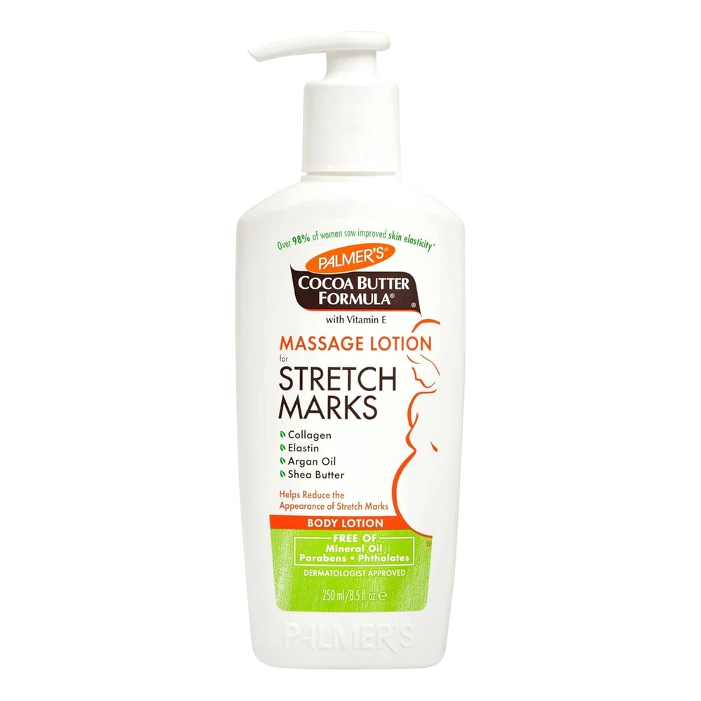 Stretch Mark Lotion: This non-greasy deep moisturizing body lotion is ideal for all-over body use to improve skin elasticity texture and tone and is widely recommended for stretch marks during and after pregnancy or weight fluctuation Natural Factors: This hydrating and hypoallergenic body lotion formula blends Pure Cocoa Butter and Shea Butter Argan Oil Collagen Elastin and Lutein to keep skin supple and moisturized for 48 hours allowing skin to stretch more easily; a pregnancy must-have! Finest Ingredients: We use only the finest natural, raw ingredients for soft, hydrated and beautiful hair & skin. We support sustainable production of Shea & Cocoa Butter and Coconut Oil. You can feel good about what you put on your hair and skin Choose What's Real: Our nourishing skin care and hair care products feature real, high-quality, plant-based ingredients. Our product line for whole body care includes body butter, creams, balms, lotions, oils, soaps, pregnancy and stretch mark care Why Palmers? For over 180 years, Palmer's has crafted treatment-oriented beauty products using Cocoa Butter, Coconut Oil, Shea Butter, Olive Oil & Vitamin E to soothe, hydrate, soften, replenish and revitalize skin and hair Nine out of ten pregnant women develop stretch marks at some point in their pregnancy. And aside from the belly, thighs, hips, breasts, and buttocks can all show signs of stretching. The cause? The collagen and elastin fibers that keep your skin firm and tight stretch and tear due to the pregnancy hormones and the pressure on your body from the rapid weight gain. While you can’t prevent stretch marks, you can help reduce their appearance with the support from Palmer's. Whatever product you choose - whether it's a stretch mark cream, a stretch mark oil, or a stretch mark lotion, natural cocoa butter is safe to use on your body while pregnant and helps reduce stretch marks as you and your baby grow. Palmer's Cocoa Butter Formula Massage Lotion helps visibly improve skin elasticity and reduce the appearance of stretch marks. Pure Cocoa Butter, Shea Butter, Natural Oils, Collagen, Elastin, and Lutein keep skin moisturized and supple for 48 hours. A pregnancy must have, this everyday body lotion is widely recommended for stretch marks during and after pregnancy. This non-greasy lotion is ideal for all over body use, in place of your regular skin moisturizer. Proudly made in U.S.A.
