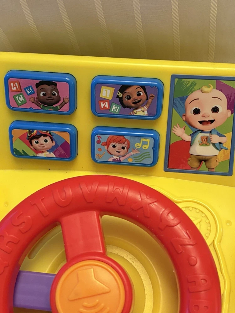 The Cocomelon Wheels On The Bus Learning Steering Wheel Interactive Toy by Just Play is a yellow interactive toy designed to help babies develop hand-eye coordination, language skills, and motor skills. With 60 phrases, this unisex toy provides an engaging learning experience. Made in China.
