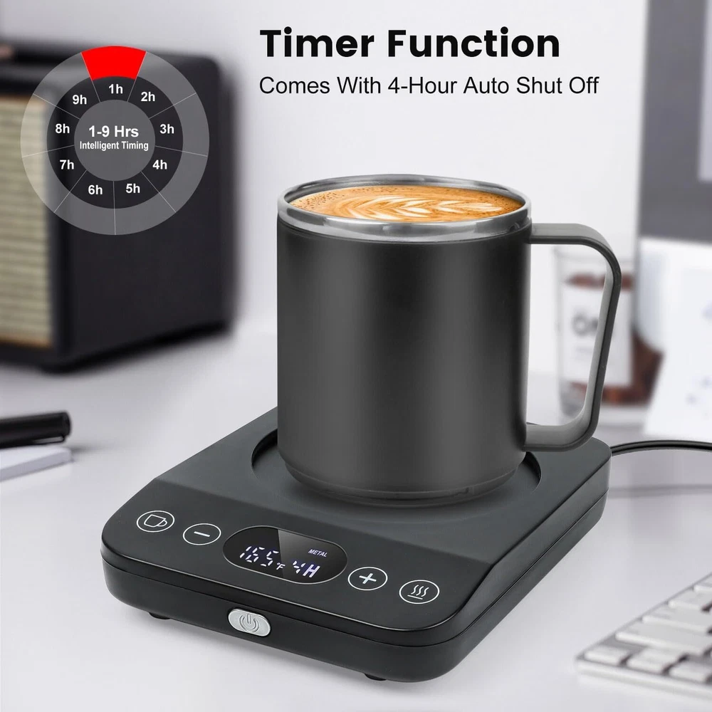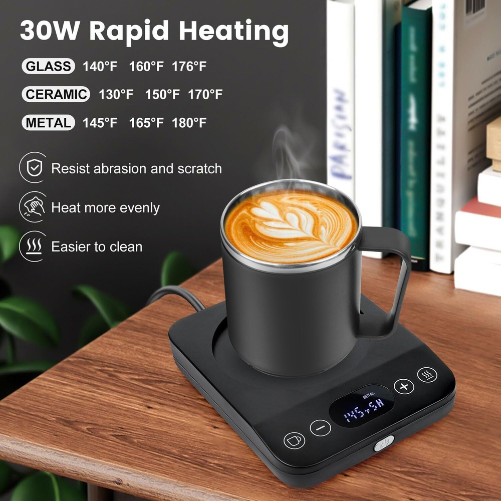 [Heating Quickly]: coffee mug warmer set comes with 15.5oz stainless steel cup, whose plastic base is detachable. The coffee mug warmer can heat up fast than other warmers, reduce waiting time. Liquid temperature can reach the highest temp to 180°F, not only warm but hot (Note: There is no any noise when it is working) [Exquisite Mug]: The inner lining of the mug is made of food grade 304 Stainless Steel, which is high temperature resistant without odor, easy to clean. The mug outer layer is thickened PP, whose heat insulation effect is excellent to protect your hands. The cup with leak proof lid and detachable base can retains heat effectively, slow down the cooling speed of hot beverages. The cup will keep your drink about 10 degrees higher than in iregular ceramic mug [Customized Temperature]: Our cup warmer with 3 Temp-Mode for your choice, GLASS(140°F,160°F,176°F),CERAMIC(130°F,150°F,170°F),METAL(145°F,165°F,180°F). Just a tap of your finger to change the temperature [1 to 9 Hrs Auto Shut Off]: Upgrade the delay timer setting from 1 to 9 hours, ensuring the best coffee taste you need. Maintain the perfect temperature of drink, ensuring that you can savor the warmth and aroma of your beverages from the first sip to the last [Safety Is The Priority]: The smart coffee heater Defaultly Auto shuts off after 4 hours of continuous use, preventing the risk of overheating or fire. Built-in gravity induction switch, no need to turn it off manually when you take the cup away. If you don't need the gravity sensing function, you can turn it off with this switch. Tip: The minimum weight for sensing is 200g [Easy to Use]: The coffee warmer for desk with high quality ABS and aluminum alloy material and upgrade metal heating plate, which not only heating faster but also waterproof. In addition, the heater would remember the last temperature and time settings [Multi-Functional Warmer]: The mug heater has large heating area ( Diameter 3.74"/95mm), can fits most cups (ceramic, glass, stainless steel and etc). Great for heating beverages, coffee, candles, tea, soups, chocolate and milk. This mug warmer is definitely a great gift for coffee lovers