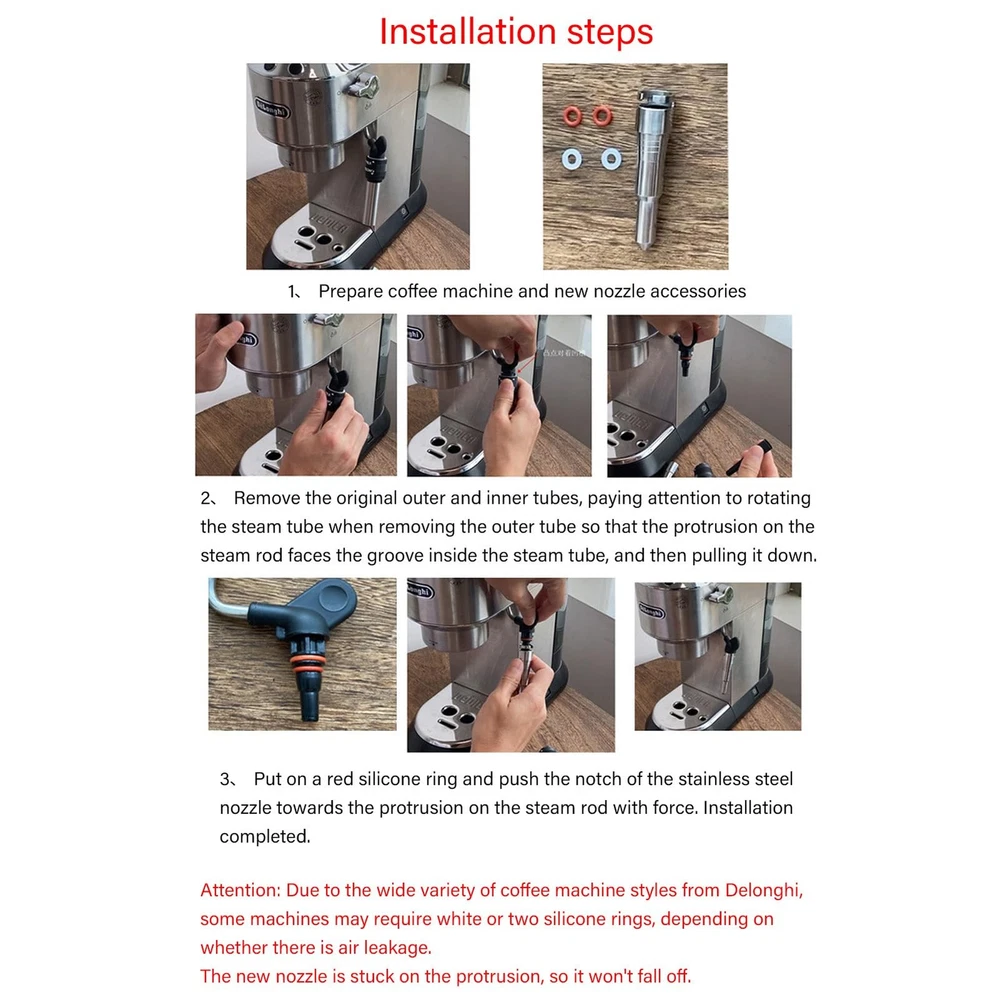 Spec: Item Type: Coffee Machine Steam Nozzle Product Material: Stainless Steel Gross Weight: 27g / 1.0oz Applicable Model: For ECP3420 310 330, EC680 685, EC9335, 9665, ECAM22.110.SB PackageList: 1 x Coffee Machine Steam Nozzle 2 x White Silicone 2 x Red Silicone Powerful Steam Effect: The coffee steam nozzle has more powerful steam and maximizes the steam effect, helps achieve fine and soft milk foam. Applicable : This stainless steel coffee steam nozzle is suitable for ECP3420 310 330, EC680 685, EC9335, 9665, ECAM22.110.SB. Opening Buckle Design: Easy to install and operate. Our coffee steam nozzles are suitable for coffee shops, restaurants, milk tea shops, etc. Stainless Steel: The standard coffee steam nozzle is made of 304 stainless steel material, which is to high and low temperature. And it is easy to , just rinse with water for a 360 degree . Silicone Rings: The buckle of the coffee steam nozzle is more compact since the built in silicon rings, giving greater play to the steam effect, and it is not easy to wash off when the pressure is high.