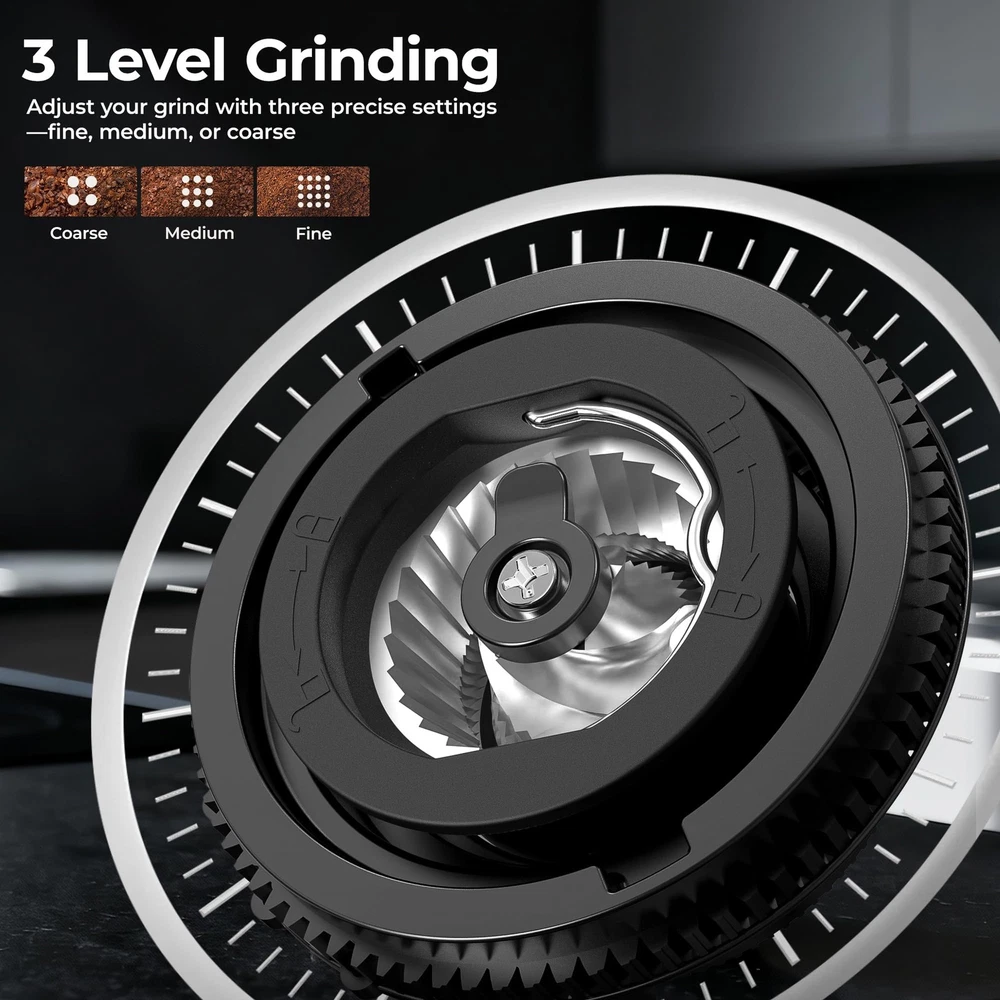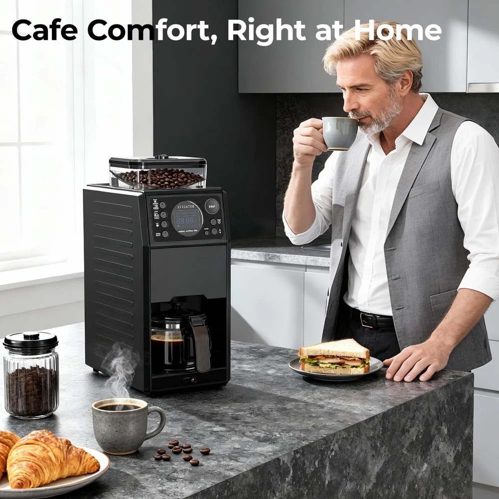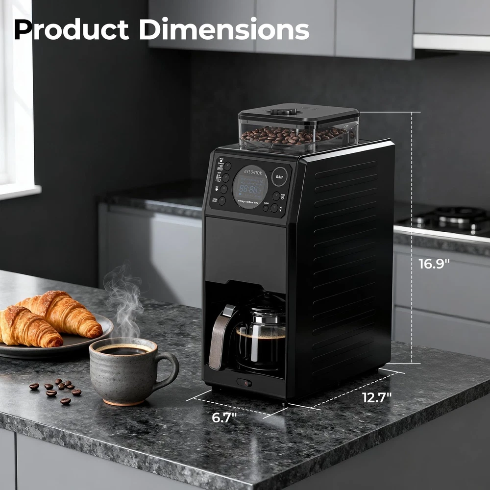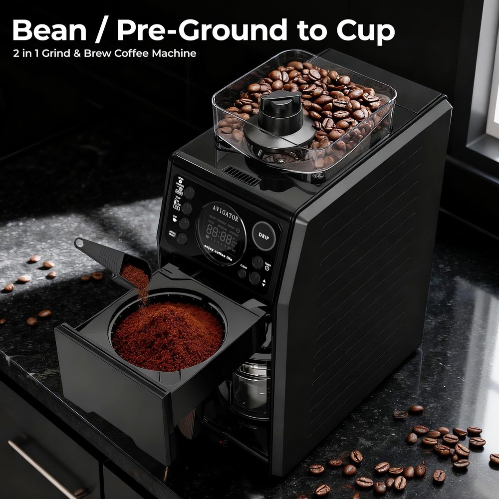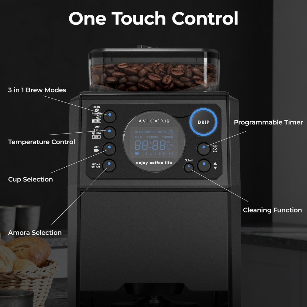 Wake up to perfection every morning with automatic grind and brew coffee maker designed for fresh- ground coffee lovers. The 24H programmable timer lets you set your brew the night before, ensuring aromatic coffee brewed at your setting time. For your convenience, the removable 0.65L reservoir makes refilling and cleaning effortless. Control every detail through the intuitive LCD display that puts customization at your fingertips on the buttons. Enjoy fresh grounds every time with the built-in precision grinder that preserves coffee's natural oils and flavor. Key features that elevate your brew: Thermal plate maintains optimal temperature for 30 minutes after brewing hot coffee; serve single cups to full 5-cup glass carafe; 3 customizable brew aromas(Mild/Medium/Strong); 3 distinct brew teampature (High/Low/Ice); -cleaning system for hassle-maintenance. Perfect for any coffee preference - whether you crave a strong morning americano or a smooth coffee at anytime you want. Coffee Maker with Grinder Built In: 3-In-1 automatic Drip Coffee Maker offers customization features to adjust the coarseness or fineness of the grind. Brewing with coffee saving your time and effort in morning routine, You could also select GRIND mode, it will gives you a flexibility to grind beans for later use or for other brewing methods Customized Brewing Options: 3 brewing temperature/1 to 5 cups/ 3 aroma options(Mild/Medium/Strong) to choose for your perference. Intuitive buttons and LCD Display make it easy to view the settings and time 24H Programmable Brewing: Grind and Brew Coffee Maker can automatically brew at a specific routine by setting time in advance. Enjoy a cup of fresh-brewed coffee when you wake up in the morning or anytime you want. Thermal Plate keeps warm about 30 minutes after brewing hot coffee Easy to Clean: Automatic Grinding Coffee Makers features 3 mode of cleaning in -touch button. Also coffeemaker comes with 5-Cup Glass Carafe and removable Reservoir so it's easy to clean routine Package : Coffee Brewer, 5-cup glass carafe, removable reservoir, (5pcs), measuring spoon, cleaning brush