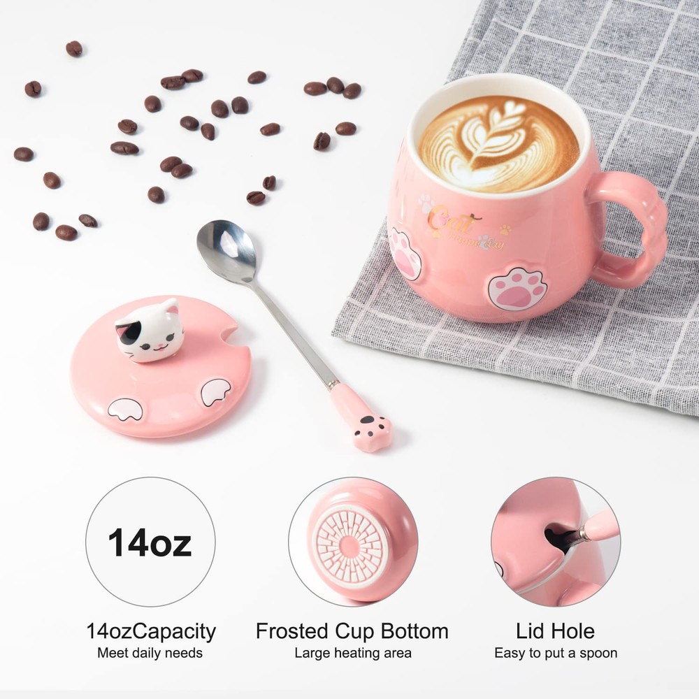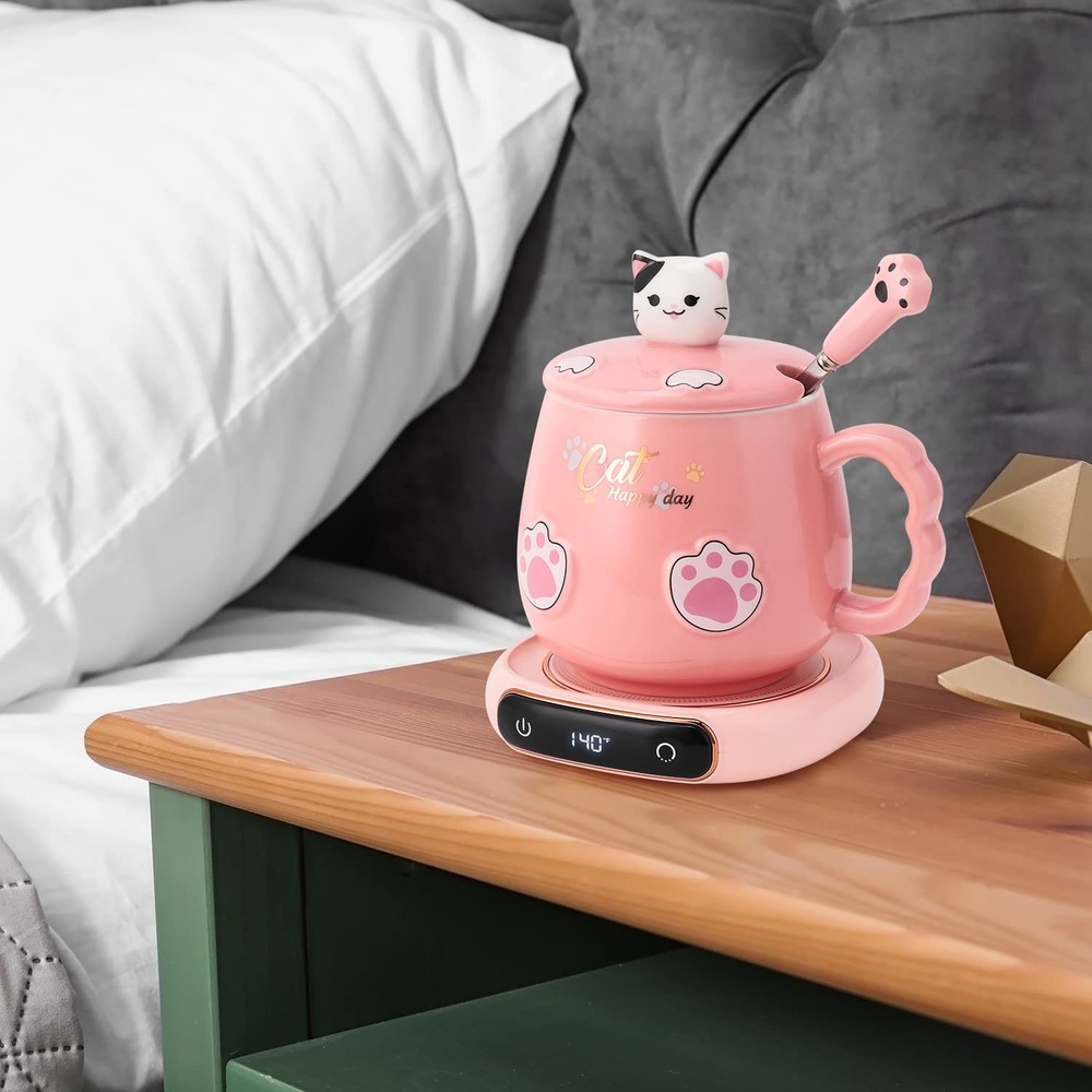 Mug warmer Ultra-compact Mug Warmer : Mini Smart Coffee Mug Warmer for Coffee and Tea, Portable Cup Warmer for Travel, Office Desks, and Home, Easy to tote and take anywhere. 110 V 230 V dual voltage with US plug can be use all over the world Special Flat Bottom Cat Mug : Cute Cat Mugs with flat bottom, Which makes the bottom fully fit the warmer heating plate, so this mug would stay hot to warm up the beverage inside,100% ceramic material 3-Temperature Setting: Coffee cup warmer will keep your coffee at a perfect drinking temperature, keeping beverage up to 113 ° F/131 ° F/140 ° F by touching the Temperature Setting Button. You can enjoy your hot coffee any time 8-Hour Auto Shut-Off : This coffee warmer will automatically shuts off after 8 hours of continuous operation. So you don't have to stress if you forget to turn it off, there is no safety hazard Safe and solid : With high-tech materials make the coffee warmer heat-resistant and fire-resistant. 53" long length ETL power cord is more convenient and safer than other brands. Product-safety with standard ETL Intertek5009505 certification. Back with 100% satisfaction service Best Present Choice : Stylish and Cute design, keep the beverages warm all day, this mug warmer and cat cup set is a best gift for coffee lovers and families. Tea warmer will be your best gift choice to show your care to your loved friends on Mother's Day, Christmas, Valentine's Day, Thanksgiving, Birthday or other special occasions