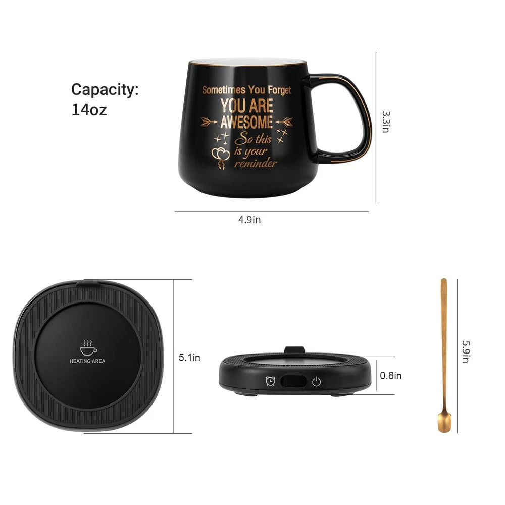 Smart Coffee Mug Warmer & Mug Set, Beverage Cup Warmer for Desk Home Office, Candle Warmer Plate for Milk Tea Water with Two Temperature Setting(Up To 140℉/ 60℃), 8 Hour Auto Shut Off Adjustable 4-Temperature Setting: Coffee warmer will keep your coffee at a perfect drinking temperature. You can control the temperature by tapping the button, keeping your coffee, tea or milk up to 113°F/131°F/149°F/167°F Intelligent Timed Design: Coffee cup warmer will auto shut off 8 hours after the last operation by default. We also set up 4 options of 2 H/4 H/6 H/8H according to different use conditions of users. You can set the automatic shutdown time according to your own needs. Warm drink available at your wanted time. Safe and energy efficient. No worries about forgetting turn mug warmer off Compatible with Most Cups: The heating plate adopts sealed-insulation technology to prevent splashing water, 4.5 inch heating plate is also fits for other glass cup, stainless steel cup, porcelain cup etc. NOT suitable for plastic cups and double insulation mugs. When using a small sized cup, the silicone rubber ring design on the top of the cup cushion can not only reduce heat dissipation, but also protect your hands from scalding Fast-Heating 14 oz Mug: 14 oz(400 ML) capacity can meet your daily needs and lid to cover the mug will also help retain heat. This ceramic mug is designed with special frosted cup bottom for fast heating, no more wait, just enjoy your hot coffee at any time Best present Choice: Cup Warmer with mug set comes in a novel and cute packaging. the mug has been carefully printed with ''Sometimes You Forget YOU ARE AWESOME, so this is your reminder'', this great tea warmer is ideal choice for present on Birthday, Thanksgiving Day and Christmas and so on