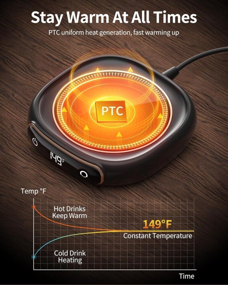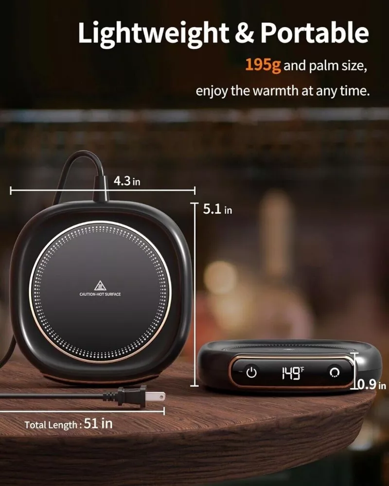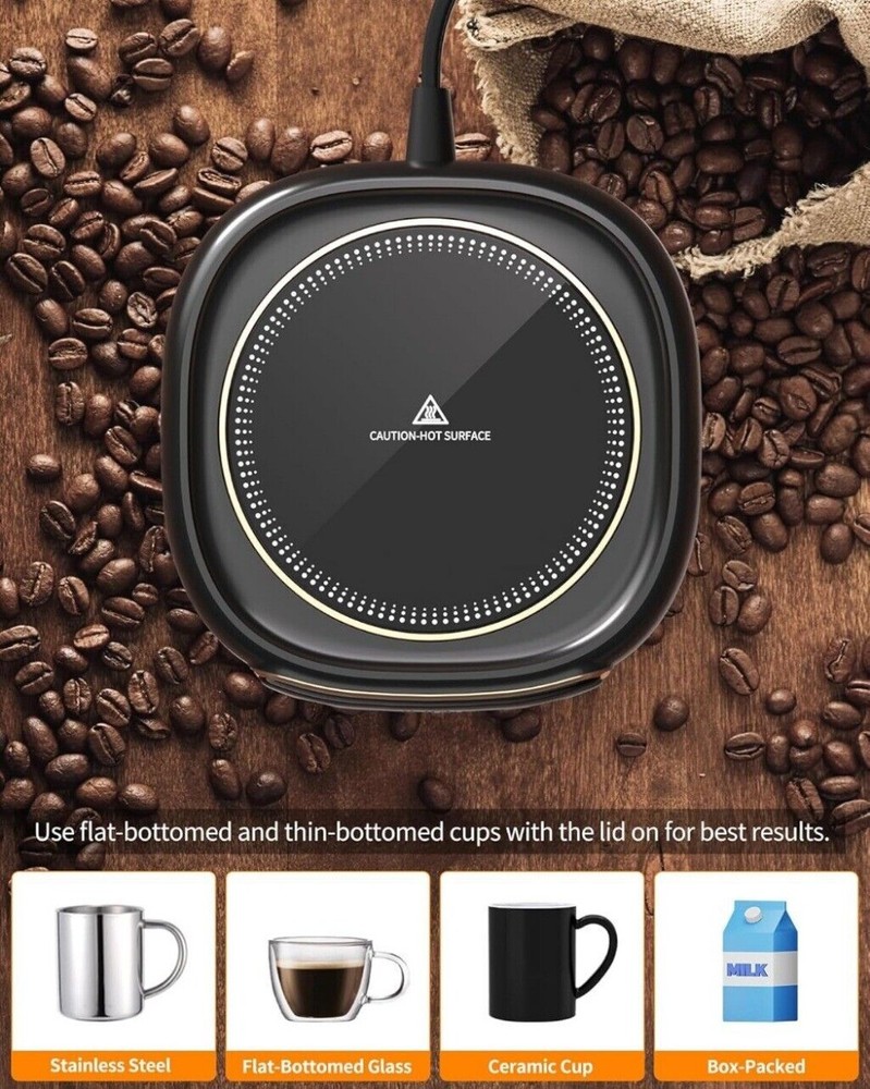 Product Description: Electric Coffee Mug Warmer, Auto Shut Off Coffee Cup Warmer for Desk with LED Display, 3-Temp Settings Cup Warmer for Heating Coffee, Beverage, Milk, Tea and Hot Chocolate (No Cup) (Black) Feature: 1.【CONSTANT 149°F Temperature】Our Coffee Mug Warmer ensures that your beverages stay at a consistent 149°F, providing a perfectly warm sip every time. Whether you're keeping your coffee hot or warming up a cold drink, this mug warmer maintains your desired temperature throughout. Tip: For even faster warming and better heat retention, use the lid to cover your cup. 2.【3 ADJUSTABLE Temperature】Choose from 113°F, 131°F, or 149°F with a simple tap to match your preferred warmth. Perfect for coffee, milk, chocolate, or tea. Best suited for flat/thin-bottomed stainless steel, ceramic, or glass cups. Also works as a candle warmer. Keeps your drink at the ideal temperature whether you’re working or relaxing. 3.【SAFETY & EFFICIENCY】Mug warmer features an automatic shut-off function that activates after 8 hours of continuous use, ensuring peace of mind and safety. Its low-power design keeps your coffee or tea warm efficiently, making it ideal for long work sessions or extended relaxation periods. Additionally, the anti-slip bottom provides stable placement on various tabletops, enhancing overall safety 4.【PORTABLE and Easy to Clean】Our coffee cup heater features a 1.3m (51-inch) power cord, weighs just 7 ounces, and is only 0.9 inches thick, making it easy to use anywhere. Constructed from durable ABS and aluminum alloy with an upgraded metal heating plate, it heats up quickly and is easy to clean. Additionally, it operates quietly, ensuring a peaceful environment. 5.【A Warmer GIFT】With its classic design, this mug warmer combines style and functionality, making it a perfect gift for any occasion—Valentine's Day, Thanksgiving, Christmas, New Year, or other festivals. It keeps your coffee or tea warm efficiently, any hot drink enthusiast who loves having their beverage at the perfect temperature at all times. Package Includes: 1x Coffee Mug Warmer