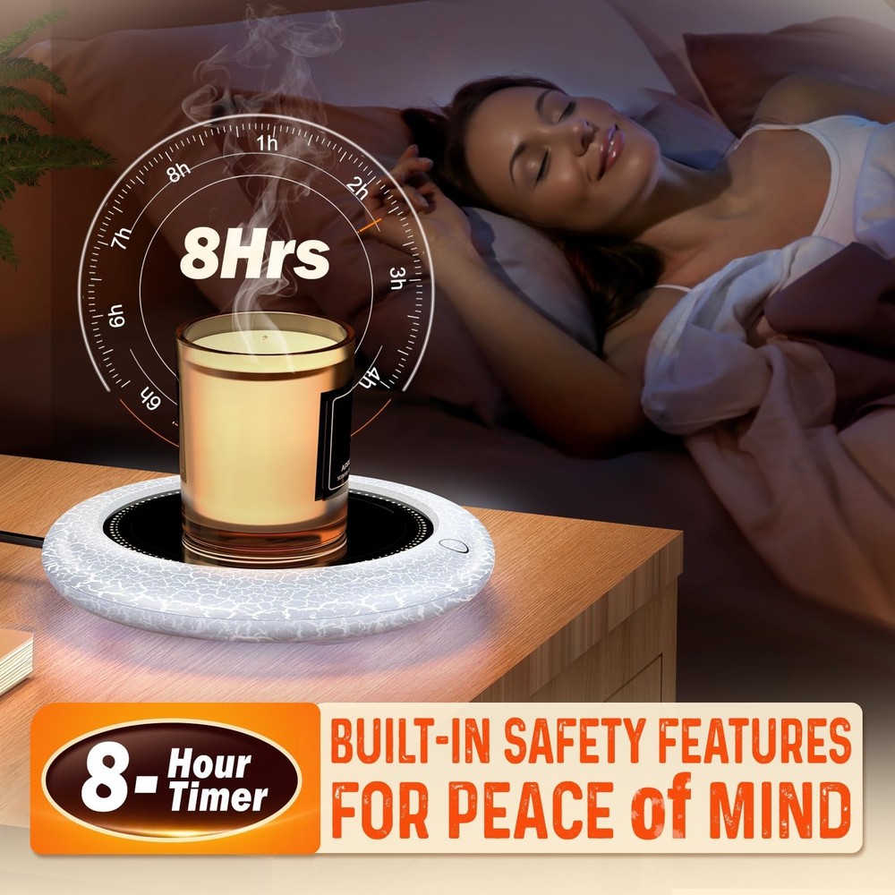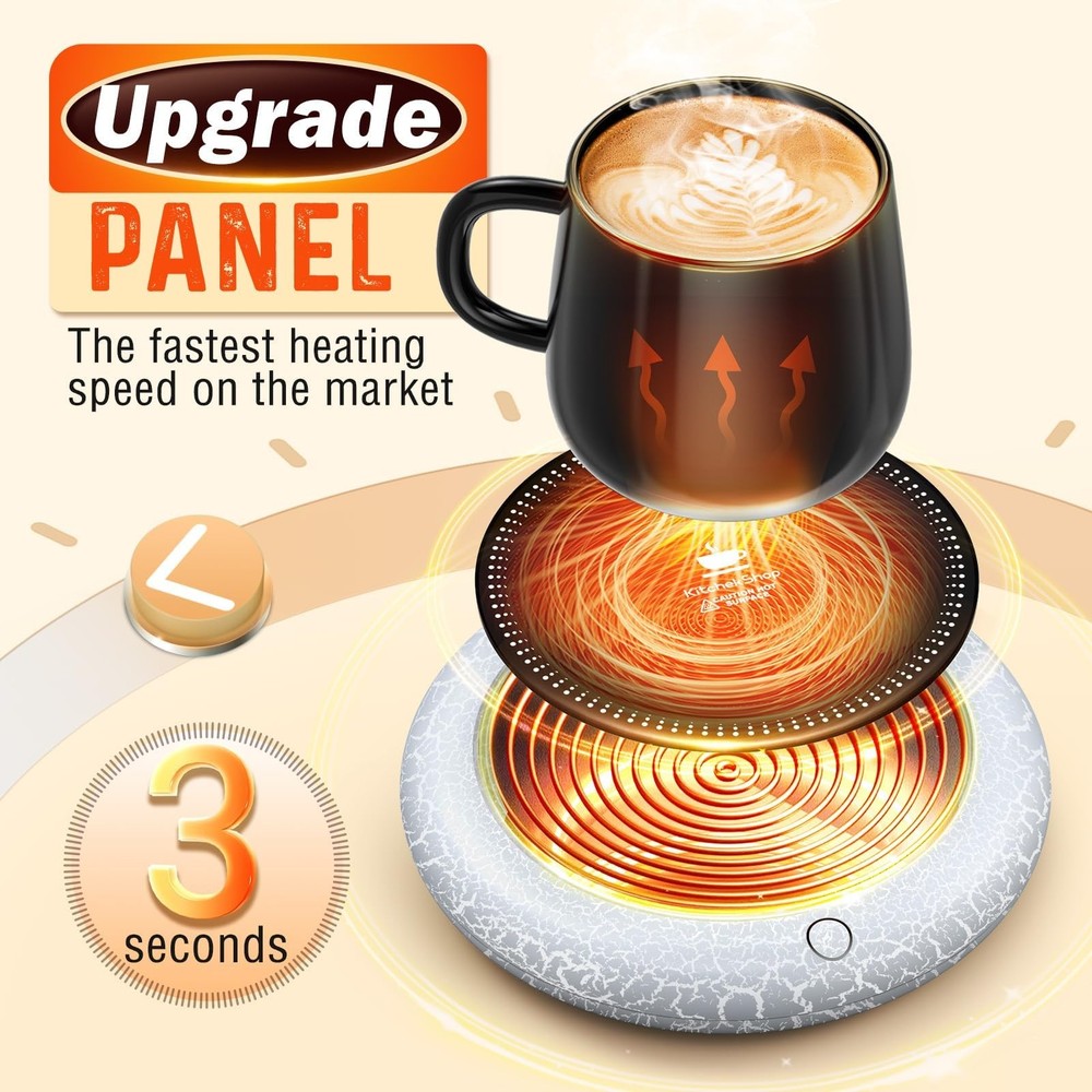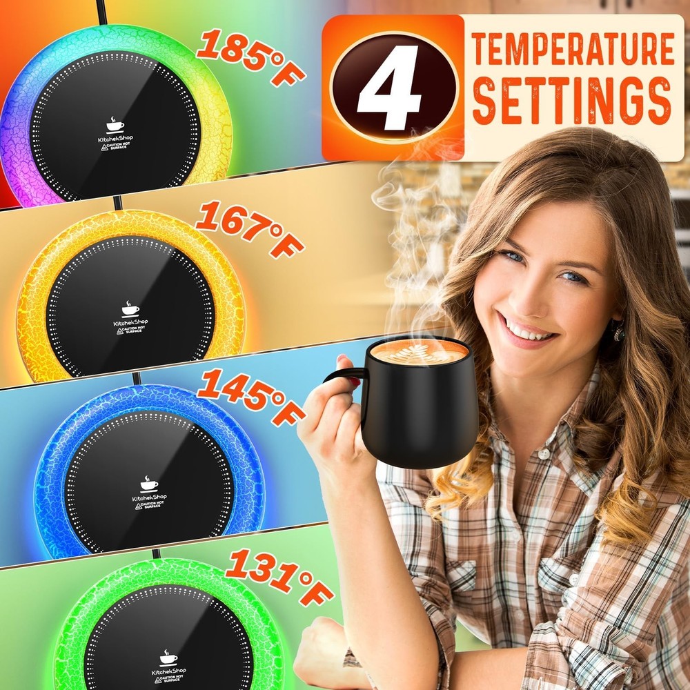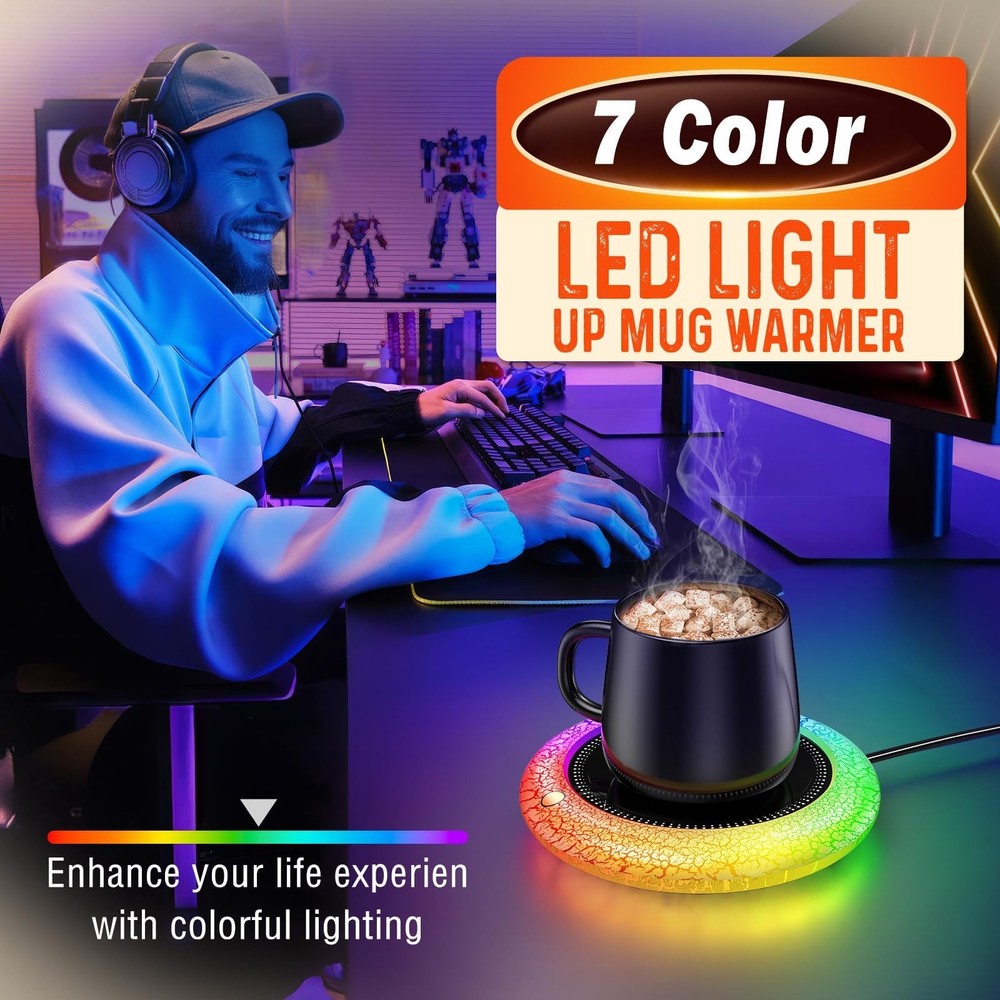Coffee Mug Warmer with Light - Enjoy the Perfect Coffee Temperature and Atmosphere Tired of your favorite beverages turning cold before you can finish them? Say goodbye to lukewarm drinks with our cutting-edge Cup Warmer, designed to keep your beverages at the optimal temperature from the first sip to the last drop. Key Features: The Coffee Mug Warmer features an innovative auto on/off gravity-induction switch that automatically activates the warmer when you place your cup on it and turns it off when you remove the cup. This smart design not only saves energy but also adds convenience to your daily routine. You can enjoy your drink without worrying about manually turning the warmer on or off. Adding to its appeal, our mug warmer comes with 7 color light options that allow you to customize the ambiance to match your mood or décor. The vibrant and soothing lights create a pleasant atmosphere, making your coffee break more enjoyable and relaxing. Crafted with a sleek and modern design, the Coffee Mug Warmer is perfect for both home and office use. Its compact size ensures it fits seamlessly on any desk or countertop, while the smooth surface makes it easy to clean. Whether you're working, studying, or simply unwinding, our mug warmer is your ideal partner for keeping your beverages at the perfect temperature. Not just limited to coffee, this versatile mug warmer can also be used to keep tea, hot chocolate, milk, or even soup warm. Its wide compatibility makes it a valuable addition to your kitchen gadgets, providing warmth and comfort with every sip. Specification: Name: Coffee Warmer Brand: Model: S-005 Color: Black panel with white crackle case Voltage: 110V Power: 40W Cable Length: 1.5 m/59 in Weight: 0.4 lb is lightweight and portable Package: 1 x Coffee Mug Warmer 1 x User Manual 【Fastest Heating Speed】The coffee mug warmer boasts the fastest heating speed and highest temperature available on the market. It ensures every sip of your coffee remains as warm and enjoyable as the first, providing consistent warmth for your favorite beverages 【Coffee Mug Warmer with Colorful LED Lights】Our mug warmer features a unique LED light system that enhances your drinking experience. It offers a 7-color auto-cycle light at 185°F, a soothing red light at 167°F, a calming blue light at 145°F, and a relaxing green light at 131°F. The coffee warmer creating a romantic and relaxing atmosphere at your desk or in your kitchen, making your coffee time more enjoyable 【4 Temperature Settings for Every Preference】Choose from four adjustable temperature settings: 185°F, 167°F, 145°F, and 131°F. Whether you like your beverages warm or hot, this coffee cup warmer for desk keeps your coffee, tea, water, or cocoa at the perfect temperature 【Ample Heating Panel】Our coffee warmer features a wide heating surface, accommodating a variety of cup sizes with ease. Enjoy the convenience of a larger heating plate that ensures a snug fit and optimal temperature for most cups. This coffee cup warmer is suitable for glass cups, stainless steel cups, ceramic cups, milk cartons, etc. And using a flat or thin bottomed mug will give the best results 【Gravity Sensor & Auto Shut Off】The built-in gravity sensor switch automatically turns the coffee mug warmer on and off, eliminating the need for manual operation. For added safety, the auto-off feature powers down the coffee warmer after 8 hours of continuous use, providing you with peace of mind 【Best Gift Choice】With its stylish and modern design, this coffee cup heater is perfect for everyday use in the office, home, or kitchen. It makes an ideal gift for special occasions like Valentine's Day, Thanksgiving, Christmas, New Year, and more. Surprise your loved ones with a thoughtful and practical present that enhances their daily coffee experience